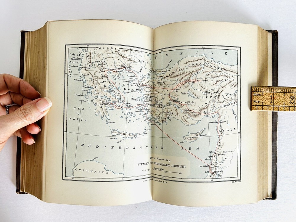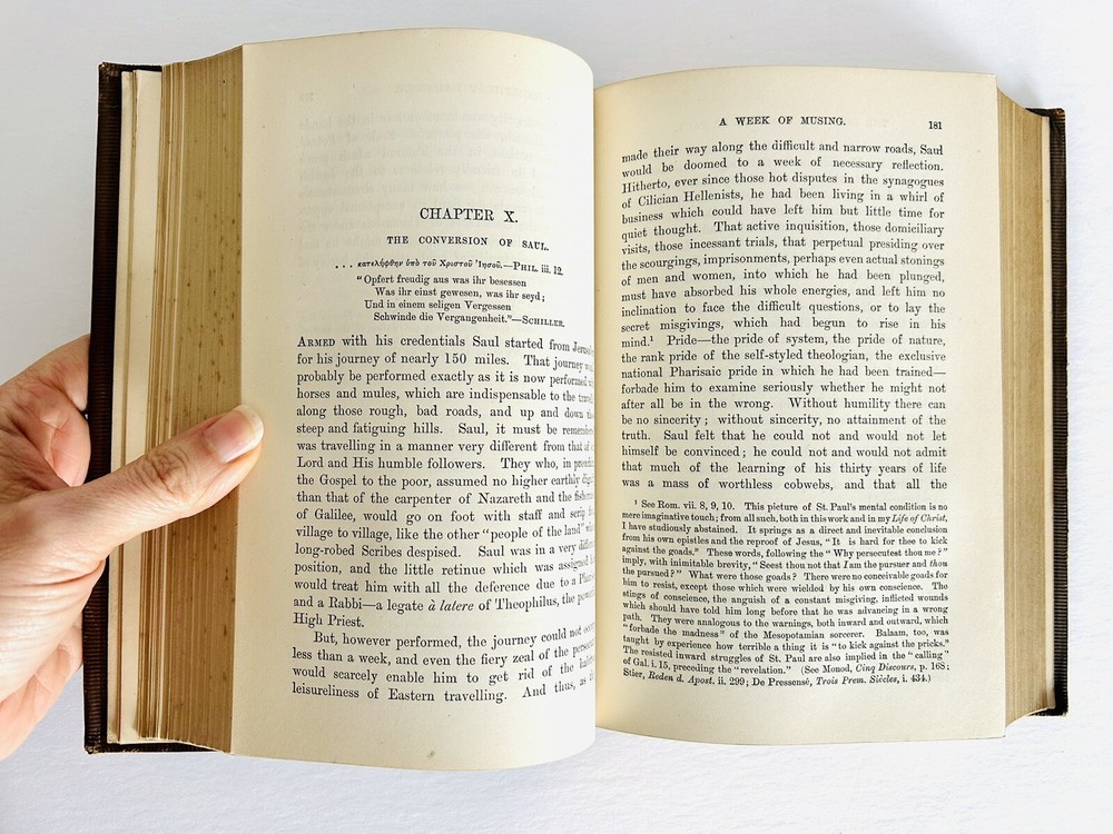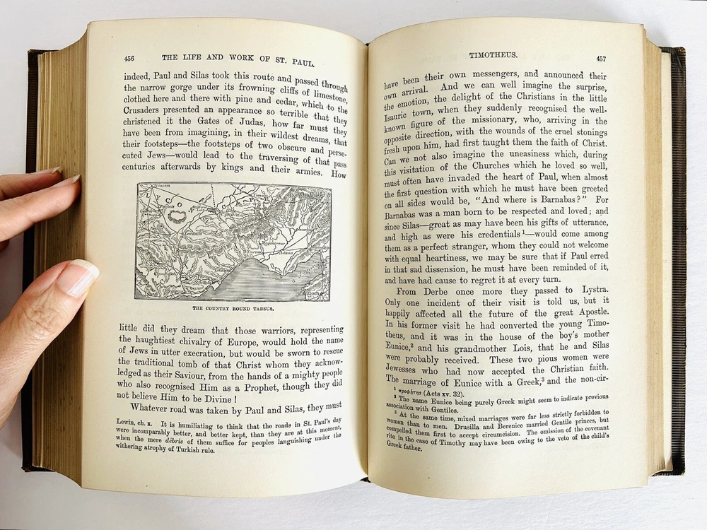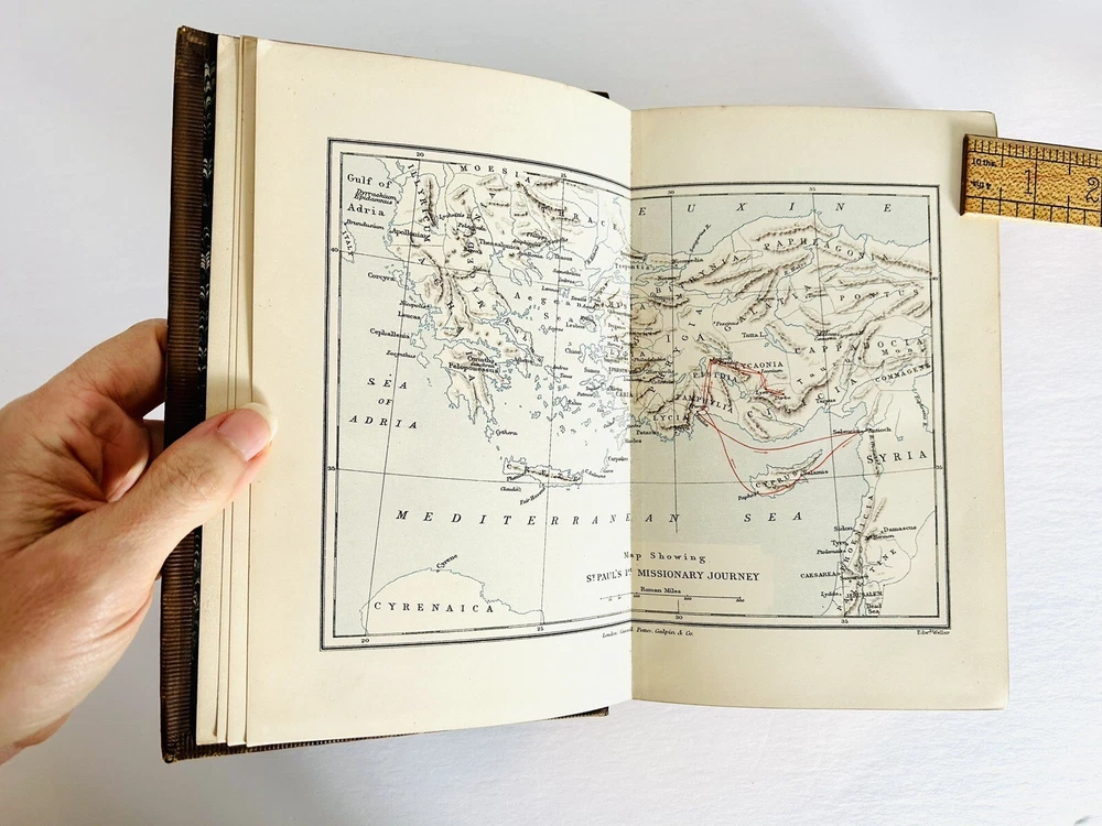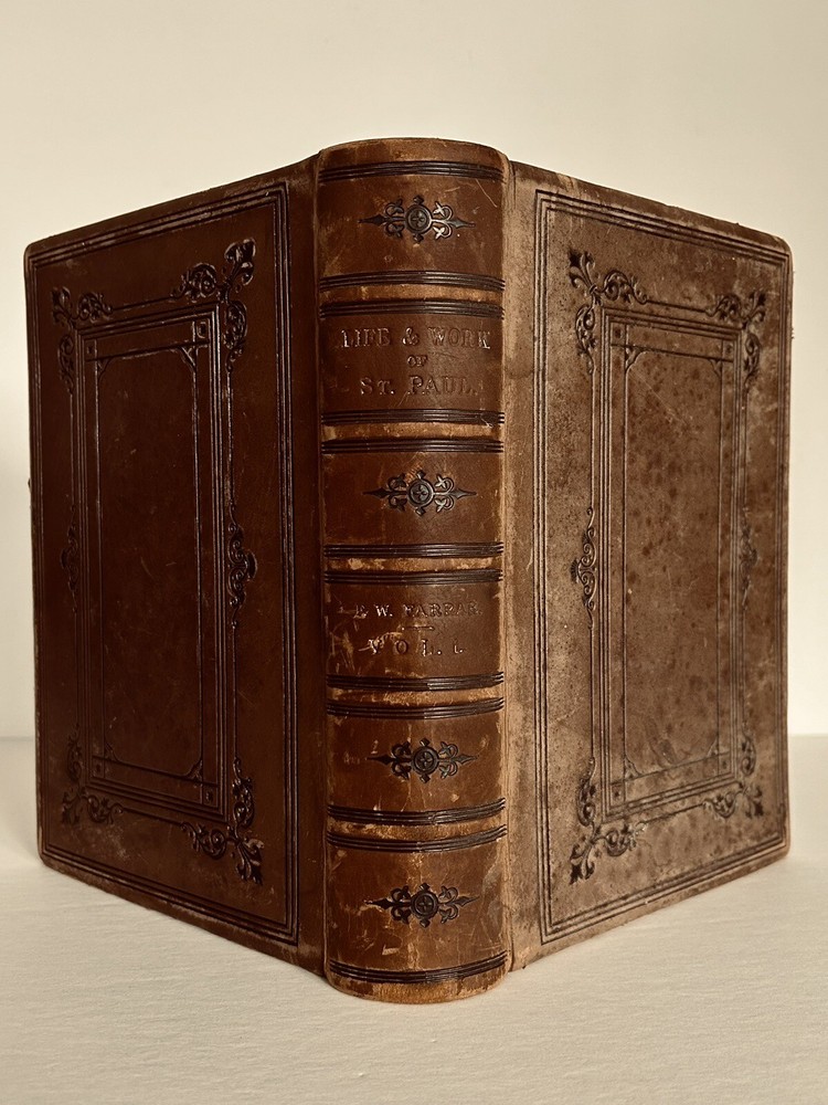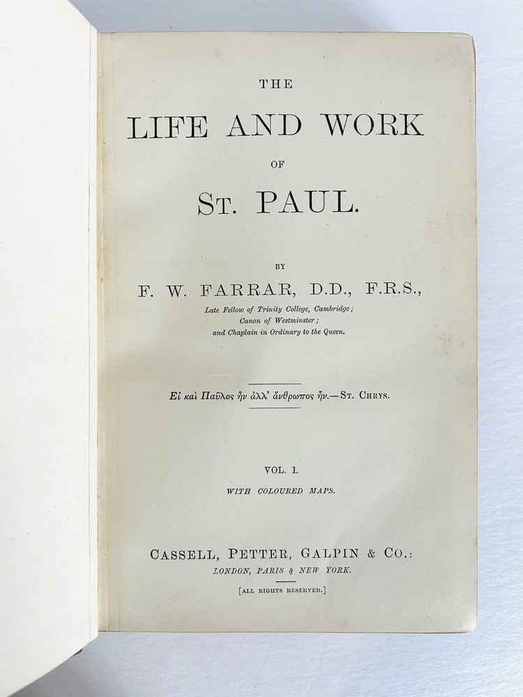 The Life and Work of St. Paul Vol. 1 F. W. Farrar D. D., F. R. S. Published by Cassell, Petter, Galpin, London, Paris & New York Undated, circa 1880 Hardcover Full leather binding Embossed leather with decorations, 5 raised bands and gilt titles to spine Illustrated with full color maps Gilt page edges Marbled end papers Book is in Very Good + Condition Binding is square and tight Pages are clean and unmarked Please see photos for specific condition and content information A stately and elegant book