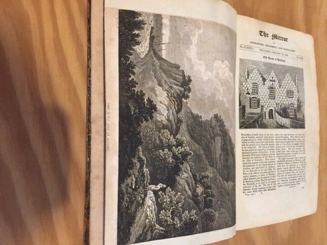The Mirror of Literature,Amusement and Instruction , various dates 1826-1840 Marbled boards with leather spine and corners. Contents include many extra illustrations focusing mainly on Yorkshire and Derbyshire including an 1808 map of each of those counties. and steel engravings of sites. In good overall condition, front board starting to split, previous owner's plate pasted to inside front cover