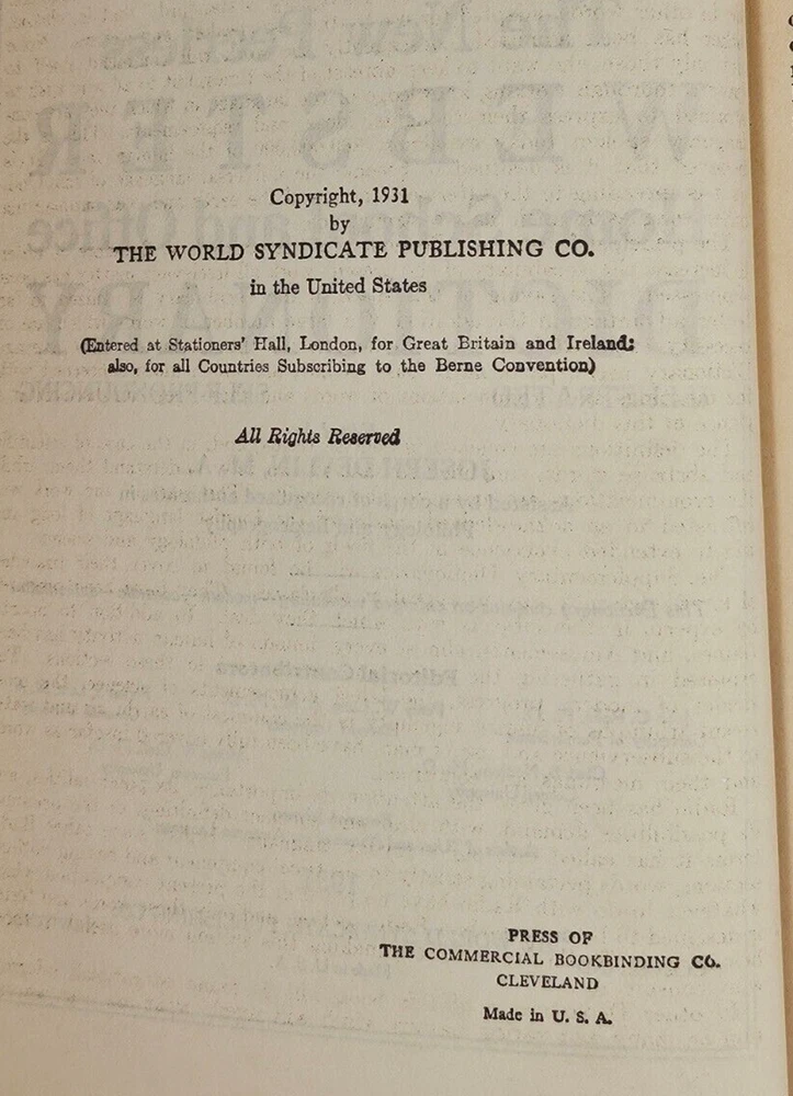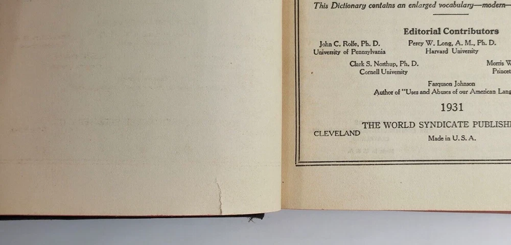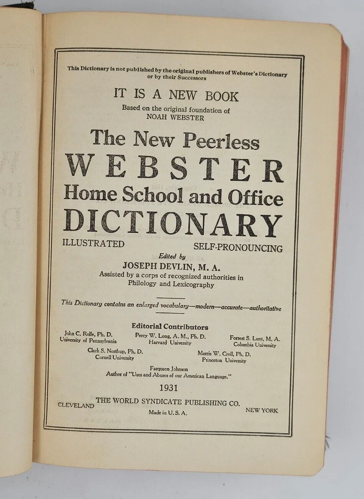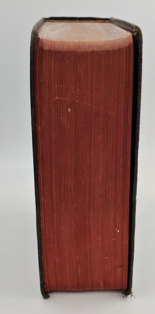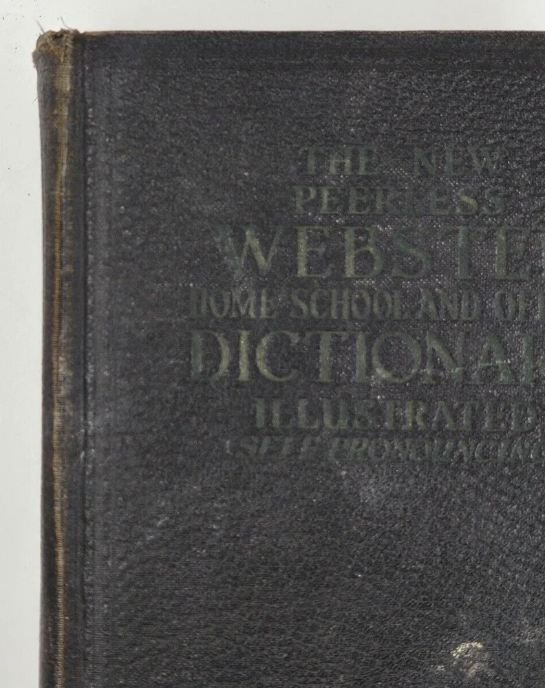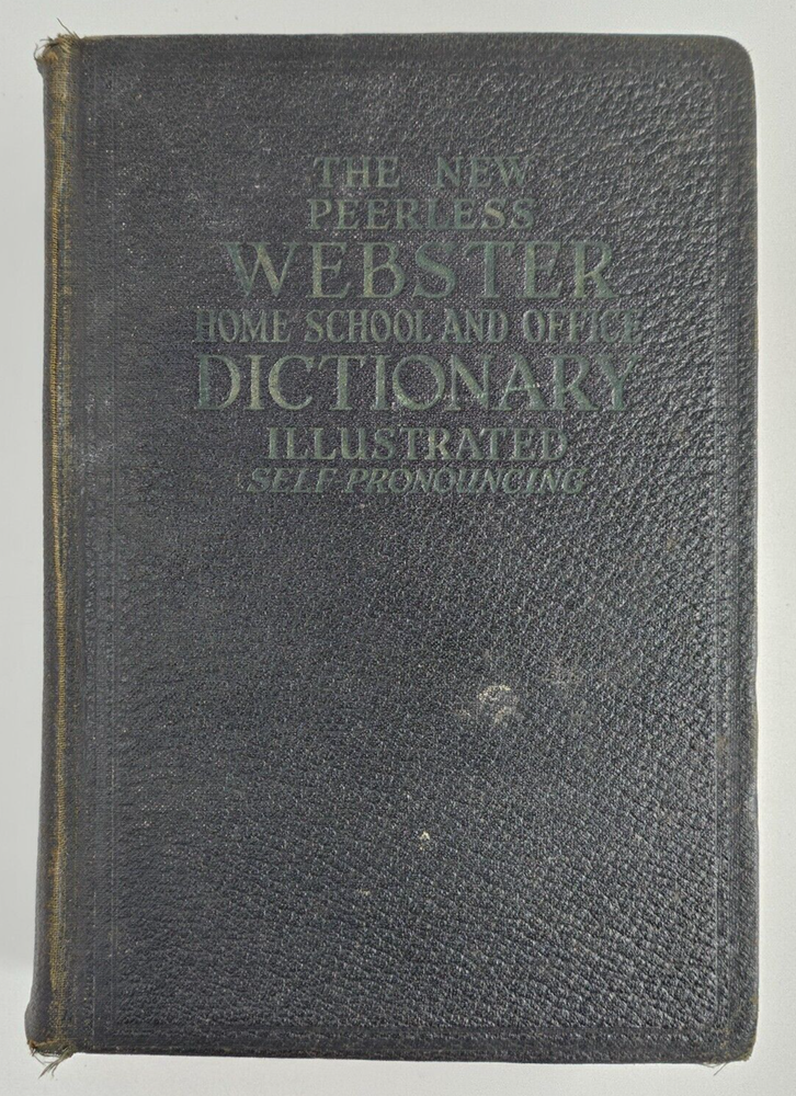 This is a rare find for any collector or enthusiast of antique books. The New Peerless Webster Home School and Office Dictionary, published in 1931 by World Syndicate Publishing Co. in the United States, is a valuable addition to your collection. The dictionary contains a wealth of information on various topics, including maps, sports terms, and the population of principal U.S. and Canadian cities. With its diverse subject matter, this book is a must-have for those interested in vintage reference books, dictionaries, and thesauri. Title: The New Peerless Webster Home School and Office Dictionary Edited by Joseph Devlin, M.A. Copyright 1931 by The World Publishing Co. Publisher: The World Publishing Co. Printed in the United States of America Format: Leather Hardcover Dimensions: Height - 8.1 inches, Width - 5.6 inches, Thickness - 2.51 inches Condition : See Pictures. Cover has wear at the edges, some soiling / staining / fading, and blunted / abraded corners with bends / creases. The cover has a tear across the full width of the top of the spine, with the cardboard underneath showing through. The back cover has a er with a missing piece just above the bottom outside corner. The outside page edges are faded with some staining. Pages are off white to cream. Ther is staining / soiling on some pages. There is a half-inch tear at the bottom edge of the page opposite the title page. Please review all pictures and ask any questions before purchasing or making an offer. Shipping and Handling : Multiple items purchased at one time may ship together. I do not ship internationally. Returns : I accept returns within the first 30 days under most conditions. Please contact me prior to returning an item.