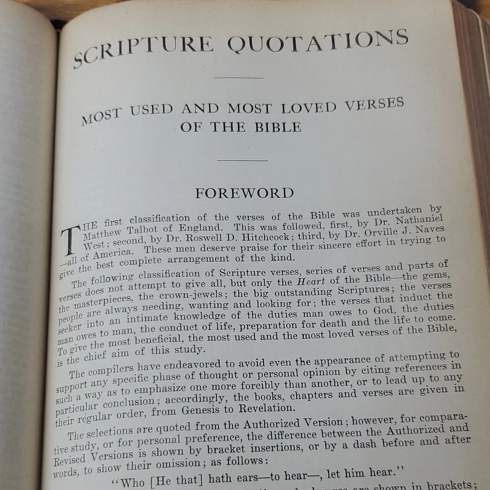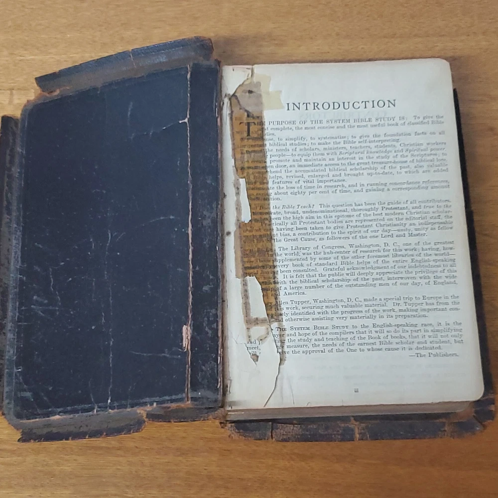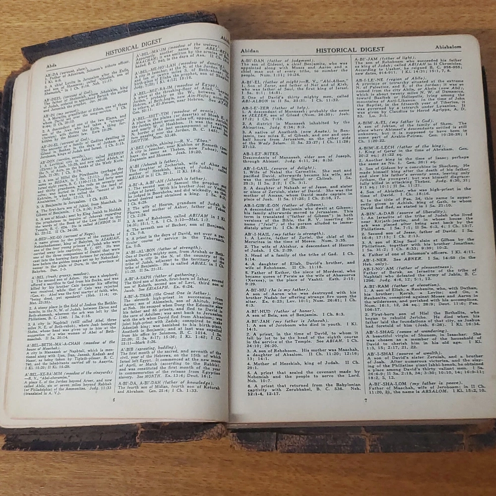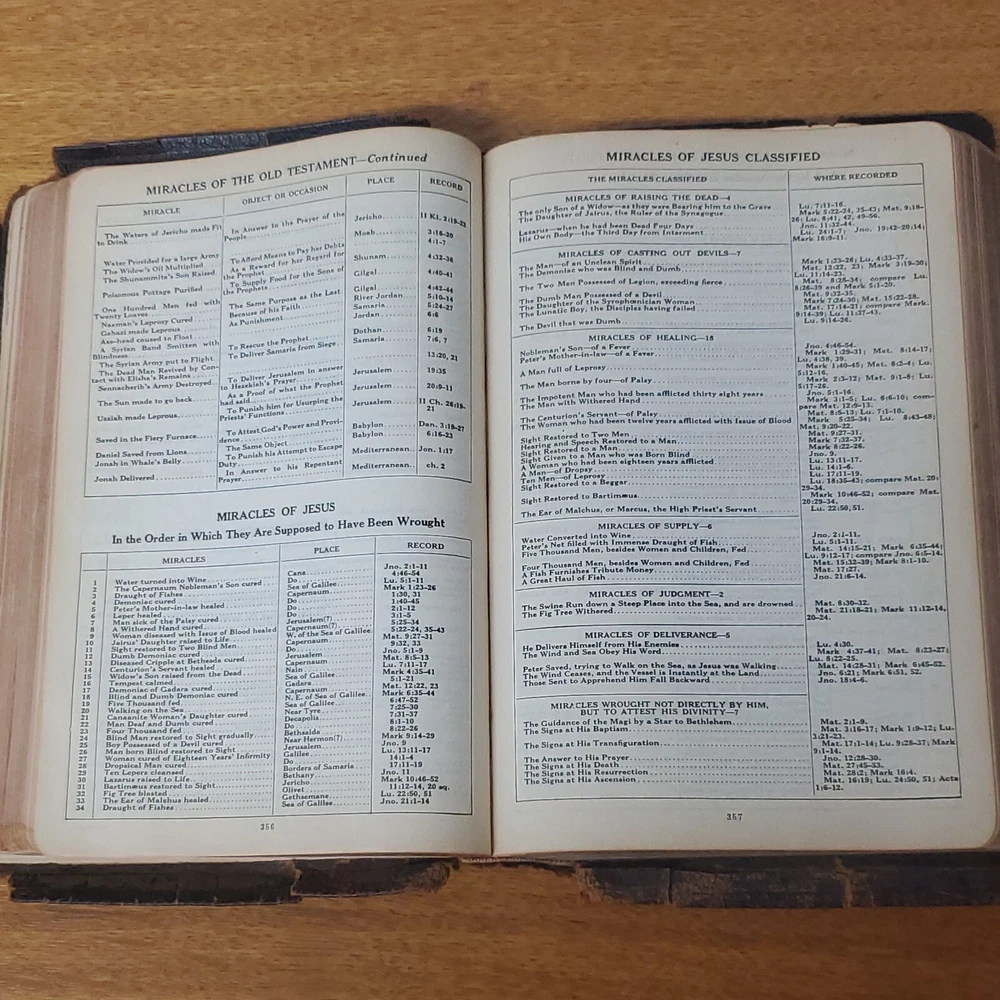Estate sale find. When I picked this book up I assumed it was a Bible, the right size, the right shape, the right look. The leather cover is wore and missing edge pieces. Inside are some ripped pages repairs and missing pages. Leafing through the book there is much useful information if you are interested in Bible study. Miracles of the Old Testament, miracles of Jesus, answered prayers, parables of the Old Testament, parables of Jesus, laws of the Bible, just a name a few. Weight is 2 lb 6 oz before packaging. 6½ × 10 × 1½" Offers always considered Thank you for looking. PS1-4aa.050224.24.9