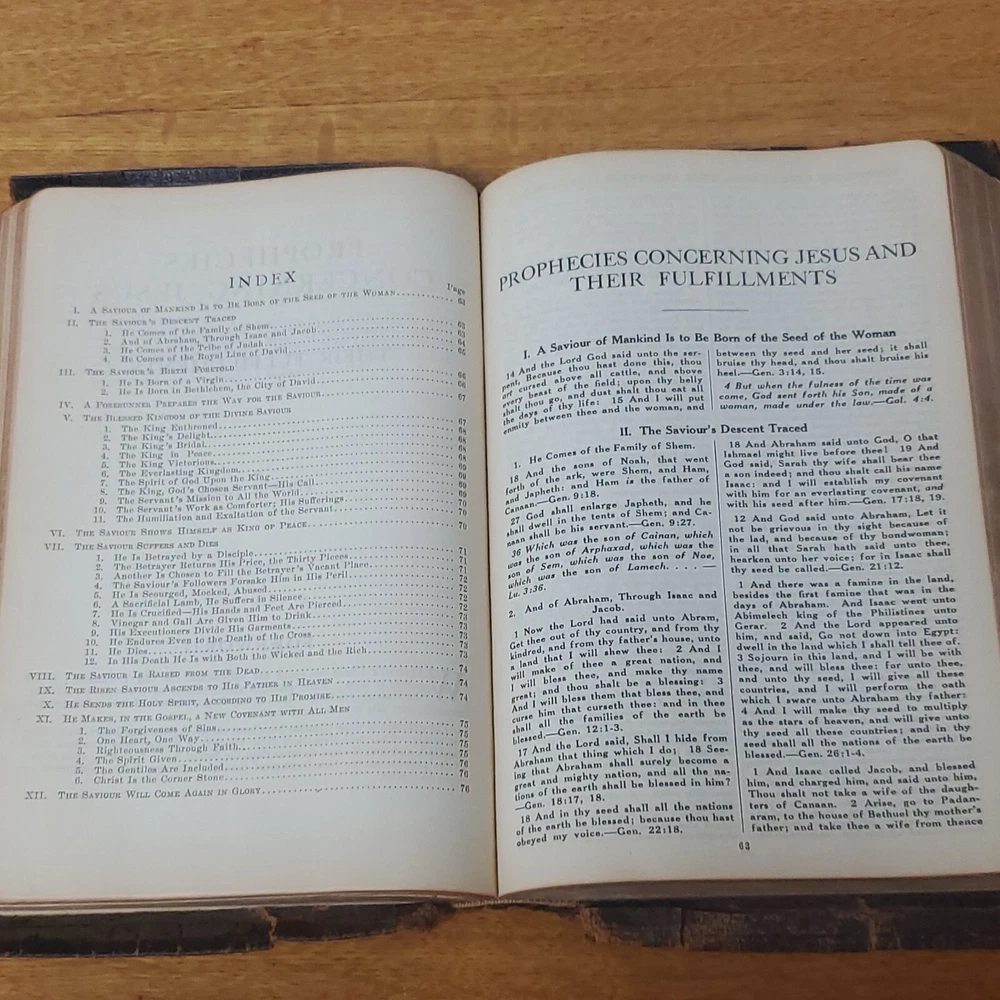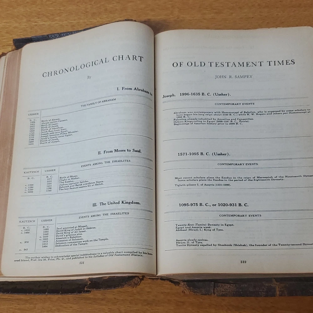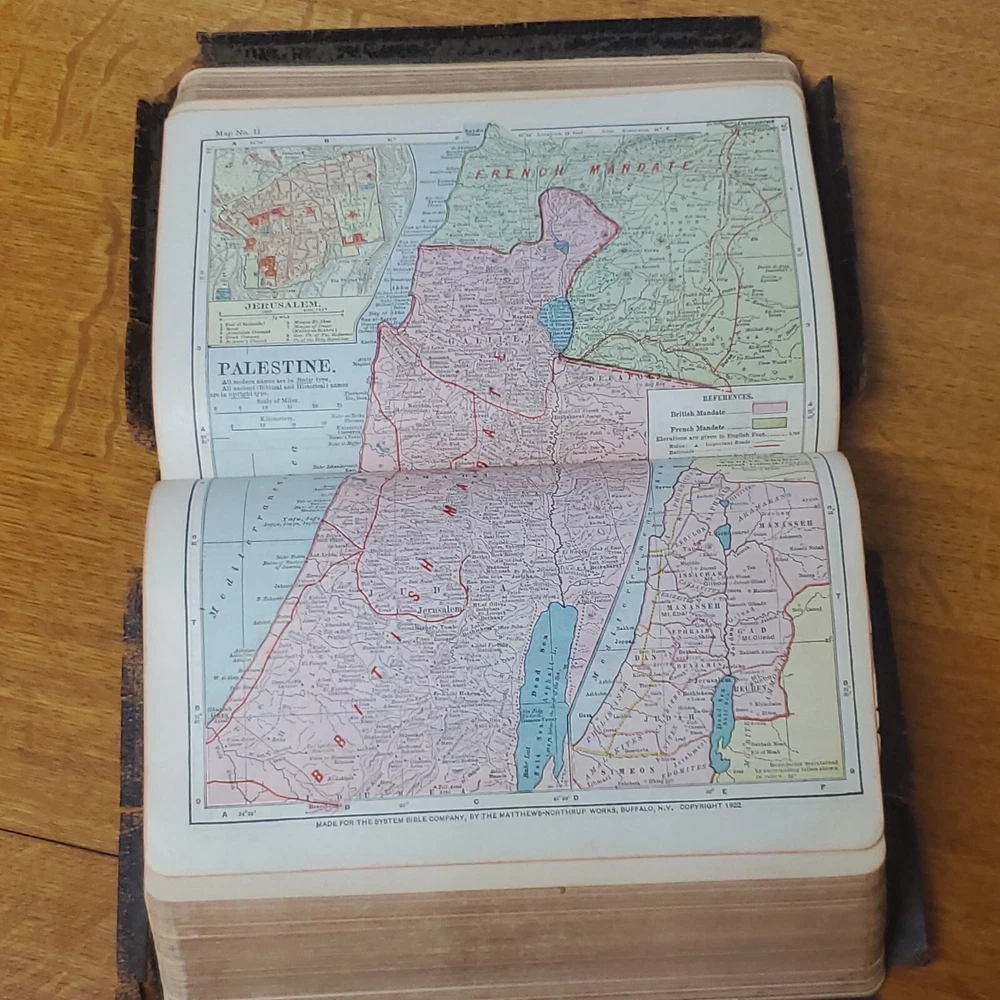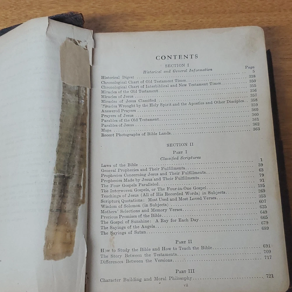 Estate sale find. When I picked this book up I assumed it was a Bible, the right size, the right shape, the right look. The leather cover is wore and missing edge pieces. Inside are some ripped pages repairs and missing pages. Leafing through the book there is much useful information if you are interested in Bible study. Miracles of the Old Testament, miracles of Jesus, answered prayers, parables of the Old Testament, parables of Jesus, laws of the Bible, just a name a few. Weight is 2 lb 6 oz before packaging. 6½ × 10 × 1½" Offers always considered Thank you for looking. PS1-4aa.050224.24.9