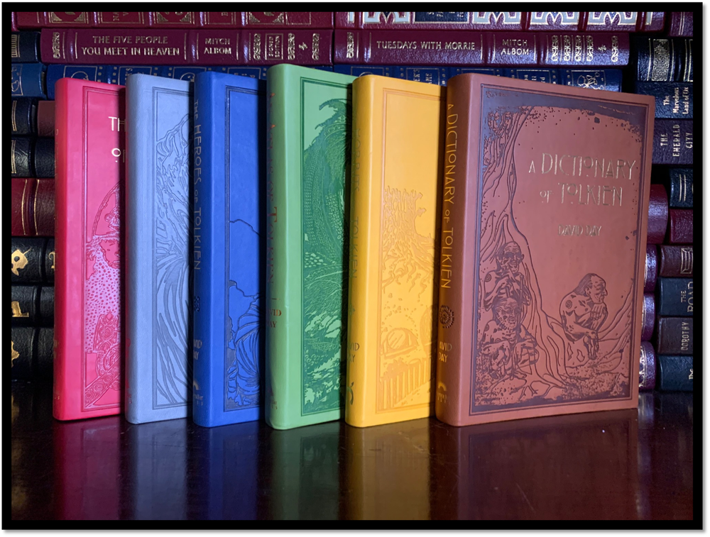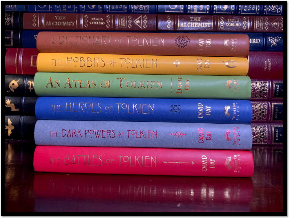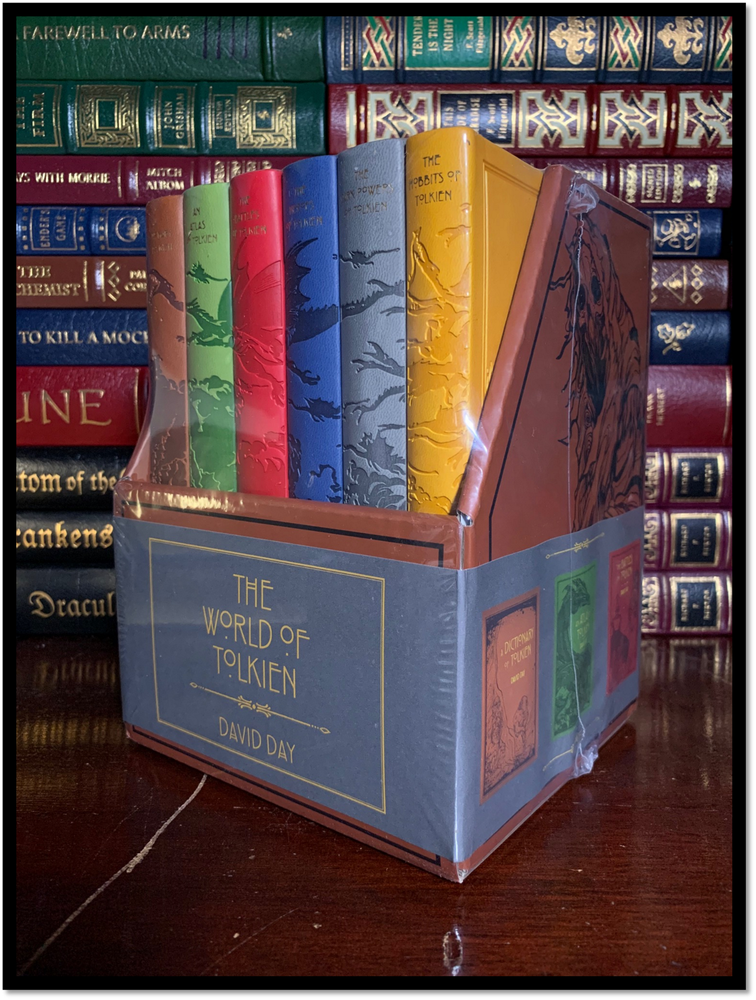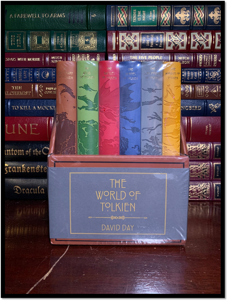 The World Of Tolkien This is a brand new soft leather feel set of books in handsome case on the worlds of Tolkien by David Day. The Dark Powers Of Tolkien he vast fictional universe of J. R. R. Tolkien contains many dark terrors to challenge the forces of good. This compendium of villains includes battle timelines, genealogy charts for creature races, striking illustrations, and well-researched commentary on the evil forces that dwell in Middle-earth. The Heroes Of Tolkien J. R. R. Tolkien's fictional world of Middle-earth is filled with great heroes who rose in the face of crisis to shape the course of that world's history. This volume examines the complexities surrounding Tolkien's portrayal of good and evil, analyzing the most celebrated heroes from the earliest days of Arda to the end of the War of the Ring. Men, elves, dwarves, and their allies are covered in detail, and each hero's role in the battle against the forces of evil is discussed at length. An Atlas Of Tolkien J. R. R. Tolkien’s fictional universe is as vast as the human imagination, so an atlas is a helpful tool to get around. Consider this book your navigational guide to Middle-earth and the Undying Lands. Maps, images, and vivid descriptions in full color create an enchanting reference to all the fantastical places and creatures that sprung from Tolkien’s mind. A Dictionary Of Tolkien J.R.R. Tolkien is the father of modern fantasy. He created characters and a world so rich with details—and so unique—that it warranted a whole new vocabulary along with it. His creation of language is not surprising, considering his first civilian job following his service during World War I was working on the Oxford English Dictionary. Inside, you’ll find a chronology of Tolkien’s life, along with a short biography and an explanation of his writings. Then flip through the dictionary to discover terms like Aglarond, the great caverns beneath Helm’s Deep, or the Black Riders and the mystery surrounding them—among many other terms. This companion serves as a terrific resource for all those in love with Middle Earth and its inhabitants. The Battles Of Tolkien Consider this book your navigational guide to Middle-earth and the Undying Lands. Maps, images, and vivid descriptions in full color create an enchanting reference to all the fantastical places and creatures that sprung from Tolkien’s mind. The Hobbits Of Tolkien An entire race was born when J.R.R. Tolkien scrawled on a leaf, 'In a hole in the ground there lived a hobbit.' From the invention of that single word (hobbit) Tolkien became the explorer and chronicler of the character, their race and their significant role in his fantastical world, Middle-earth. The deluxe, heat-burnished covered set makes this a charming addition to your Tolkien library. SHIPPING I ship via media mail within the U.S. If you would like an expedited option please let me know before buying. I ship globally, but I use the U.S. service which I ship to in Kentucky and it ships out to the Country and uses their services. Also, if you are an international buyer and would like to combine shipping and the add to cart and request total option is not working please contact me about creating you a listing.