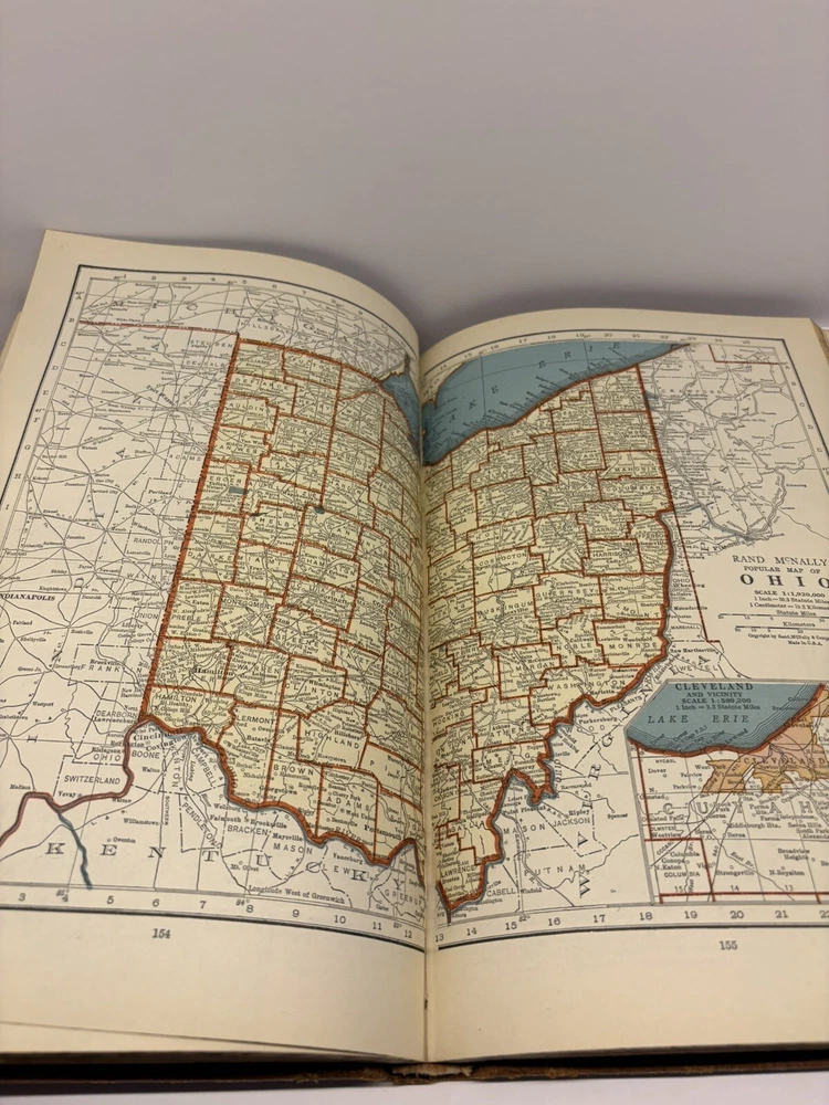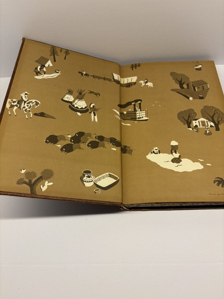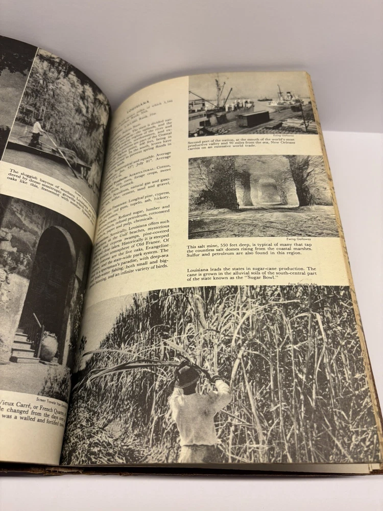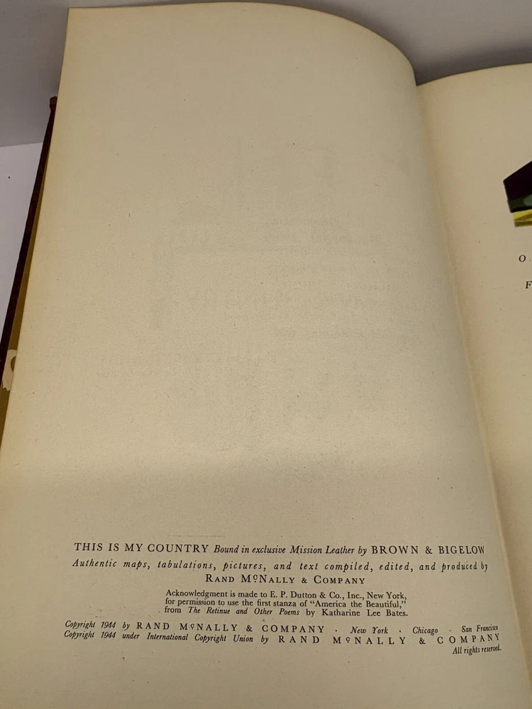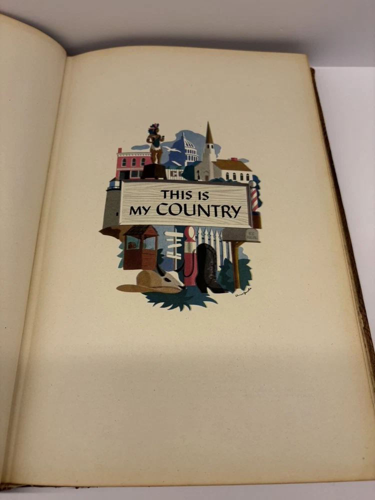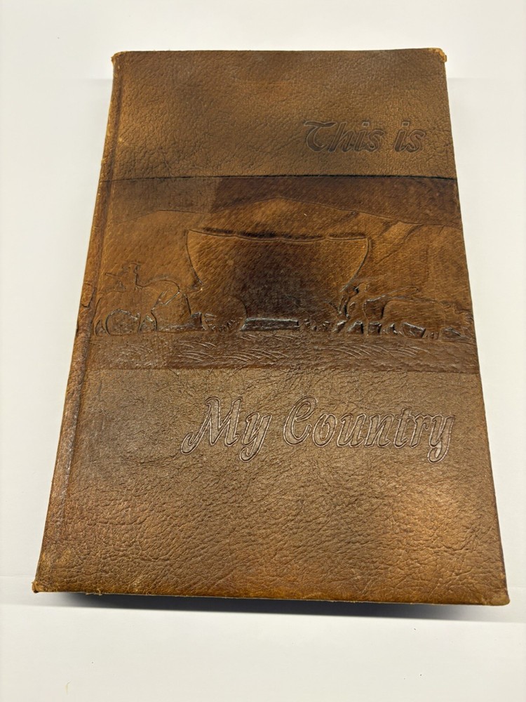 This vintage 1944 atlas titled "This Is My Country" features US maps by Rand McNally. The atlas is leather-covered, illustrated, and published in English. It focuses on travel and exploration in North America, specifically the United States. This original edition is a valuable collectible item for those interested in historical cartography.