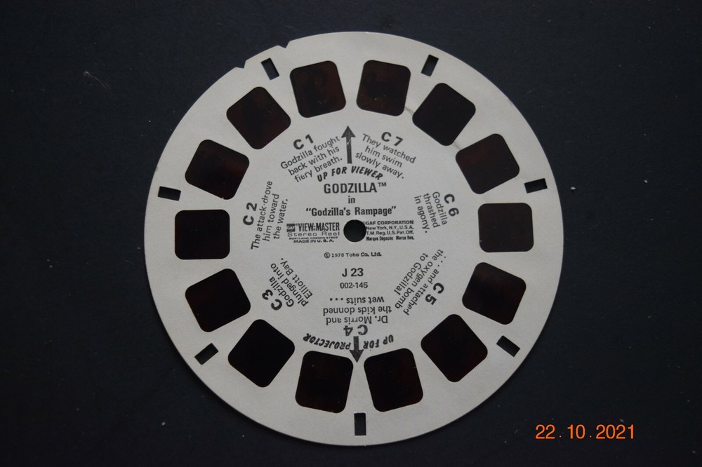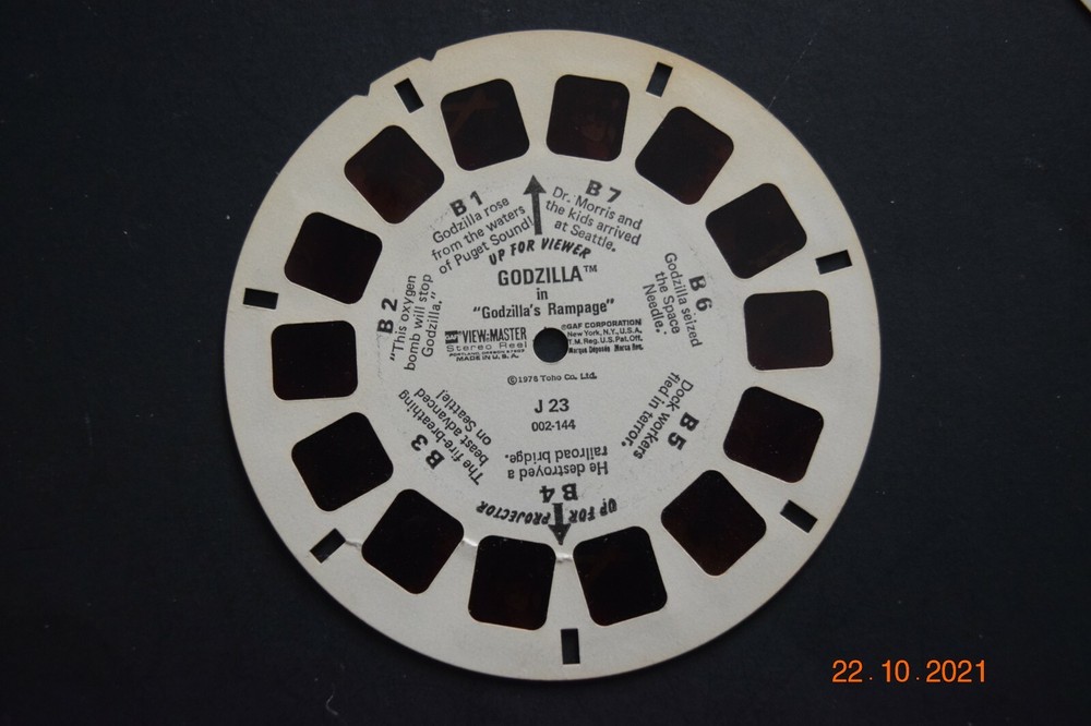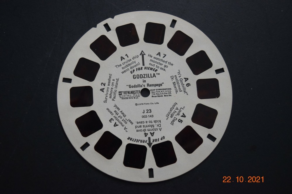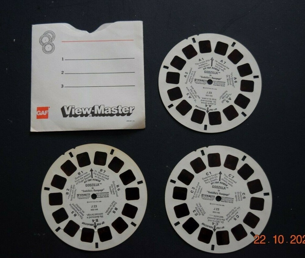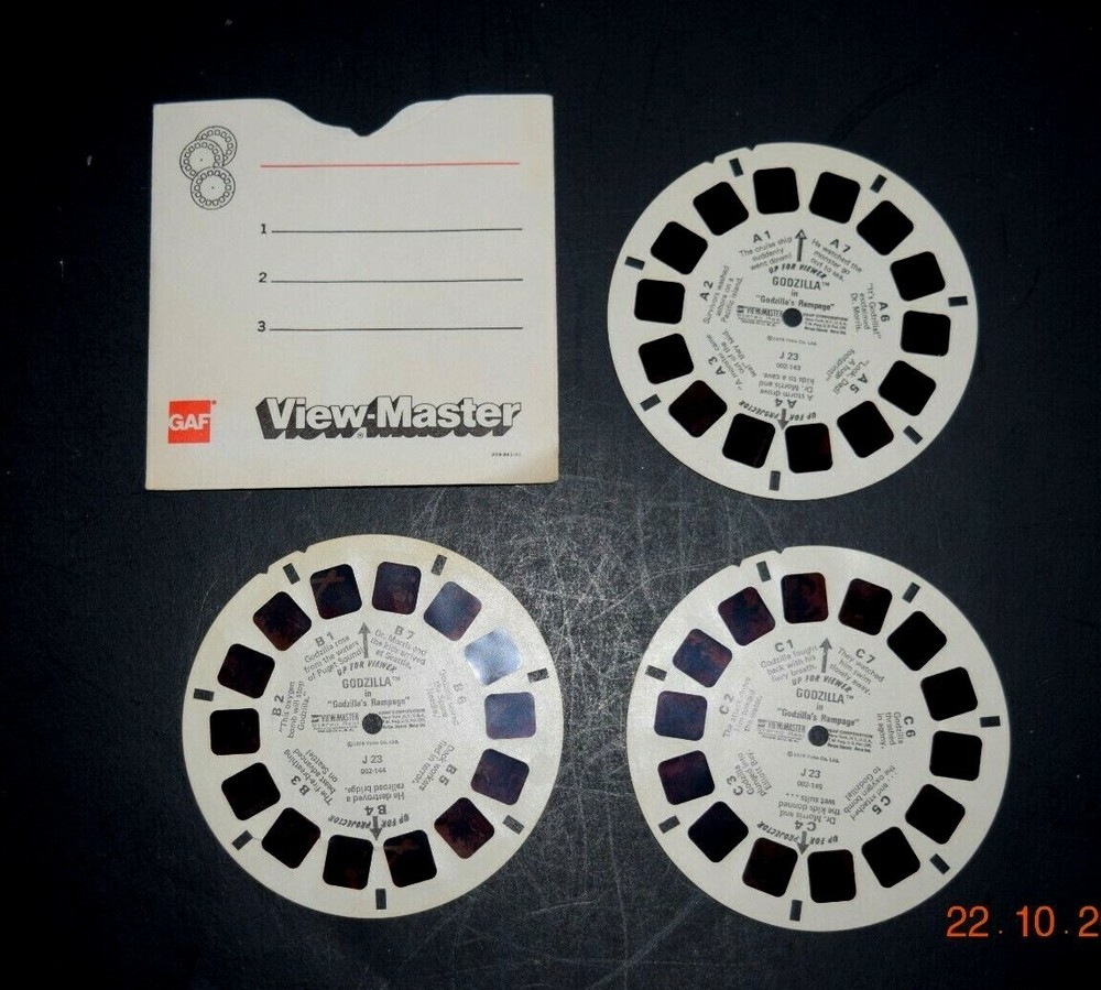Three (3) VIEW-MASTER PIC REELS, "GODZILLA," (J 23) & Mail Order Form, Pre-Owned Twenty-One (21) Total Views, VM Folder, FL Back BR VM - 10 Images are sharp. Film has slight red tint. Has Been Stored in a Humidity and Temperature, Smoke-Free Environment. THESE ARE ACTUAL PHOTOS OF THE ITEM FOR SALE, NOT STOCK PHOTOS. BEWARE OF STOCK PHOTOS, WHICH MYA NOT REPRESENT THE SPECIFIC OFFER. Will be Shipped (Folded) in a Stiff Card Board and/or a Separate Box to insure that it Arrives in the Same Condition.
