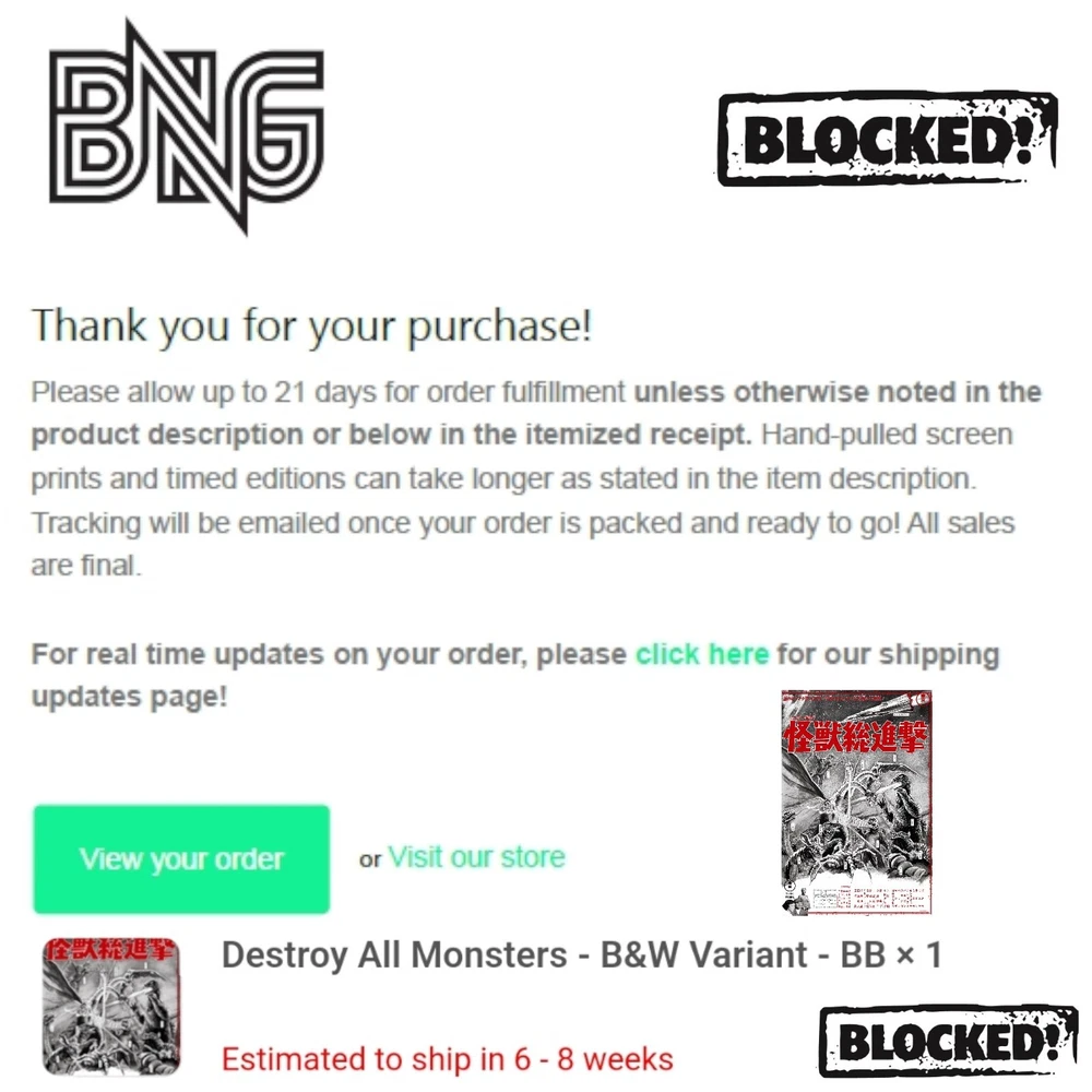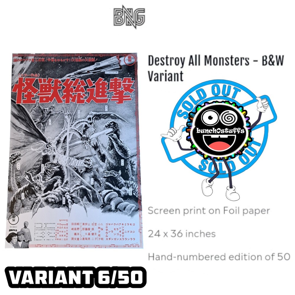 Toho Ishiro Honda Godzilla Destroy All Monsters Black & White Variant Screen Print 24" x 36" Limited Edition X/50 Rare. Brand New. Ships when in hand. Extended handling time. Released 7.25.24 for purchase. Sold out in a matter of minutes. In Hand In 6 to 8 Weeks as per Bottleneck Gallery. Confirmed Order. See Photo. Limited Edition Variant Black & White Screen print 24 x 36 inches Hand-numbered Limited Edition Variant Black & White of only 50 made. Kaiju with 1968’s Destroy All Monsters. With Godzilla 1954, Toho, Ishiro Honda, and the rest of the talented team behind the movie created the world’s most popular kaiju as well as a powerful allegory and symbol for creatives and storytellers to use as a vehicle for decades to come. With Destroy All Monsters, Honda and the rest of the Toho team created a simple, all-out slobberknocker of a movie featuring Godzilla, King Ghidorah, Mothra, and many others. The original theatrical poster is a classic, and we’re proud to be able to reproduce it as a high quality, officially licensed screen print Variant. How will my print be shipped? All prints are shipped rolled in kraft and placed in a sturdy Yazoo tube. Then placed in another box with plenty of packing to ensure safe arrival. We understand how important it is to make informed decisions, especially when shopping online. Rest assured, the item you choose will match the visual representation you see in our listin