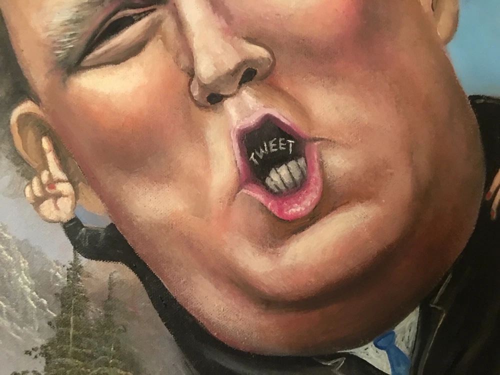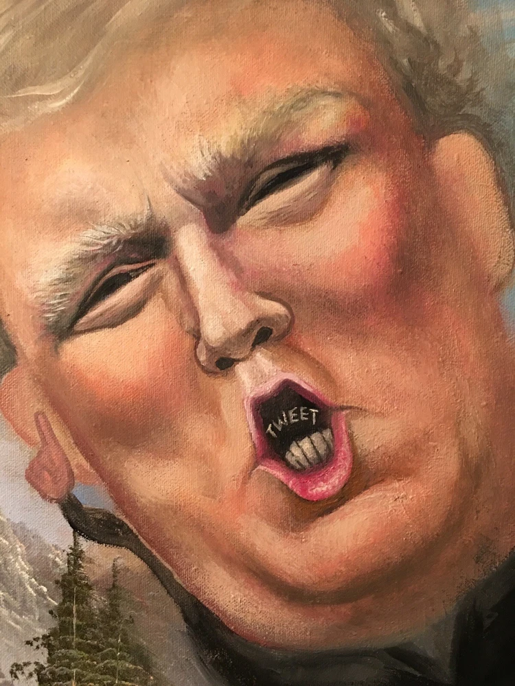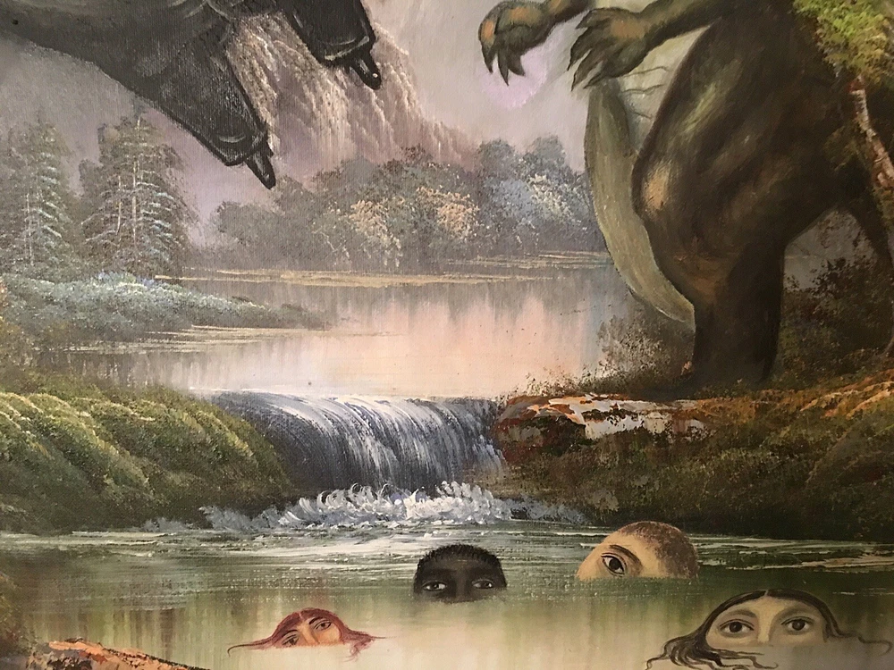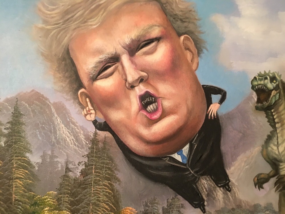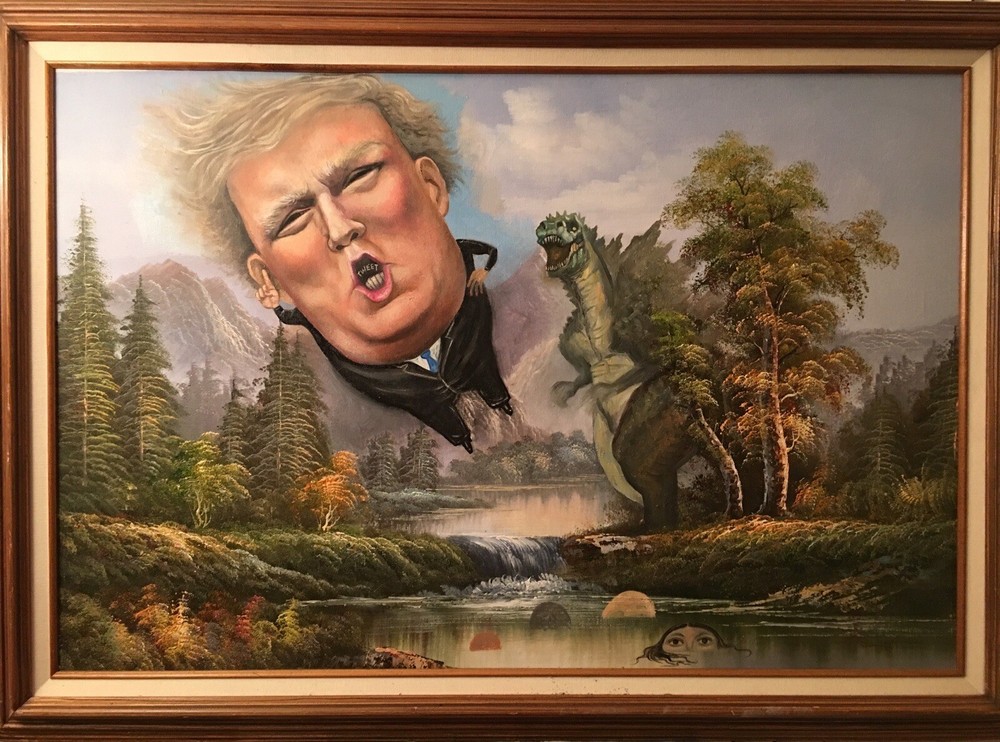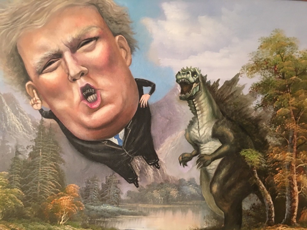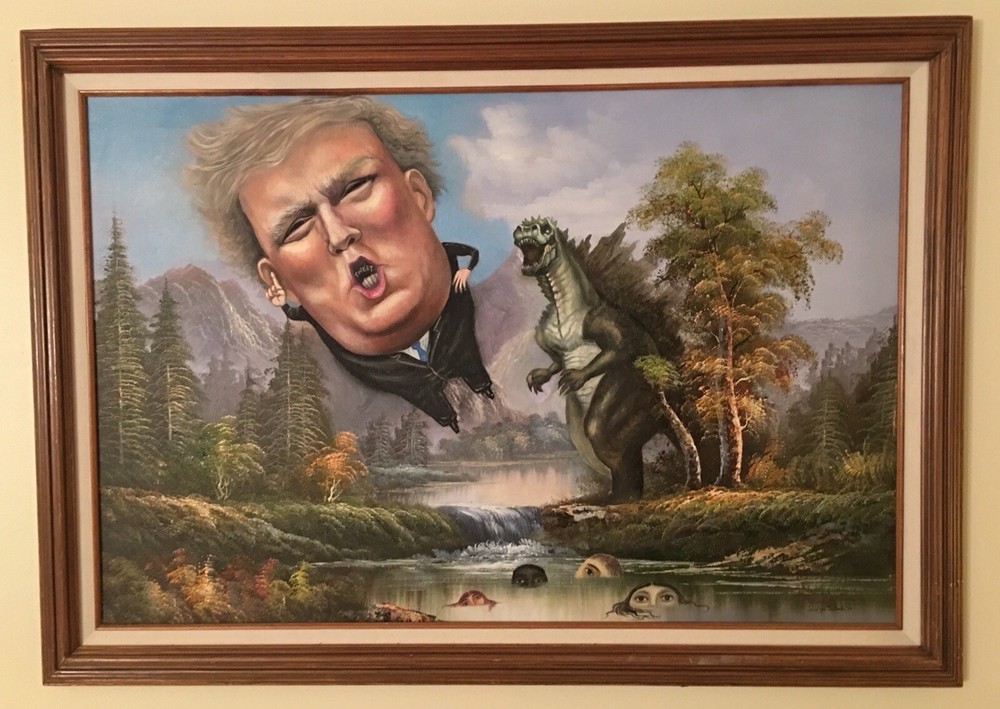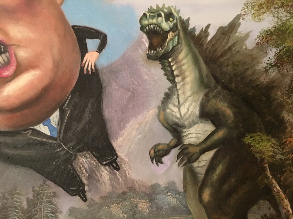 Trump vs Godzilla Art Oil Painting by Jocelyn Bullock 2016. This is an oil painting done over a thrift store painting. On canvas, wooden frame, wired in back. Professionally packed and shipped.