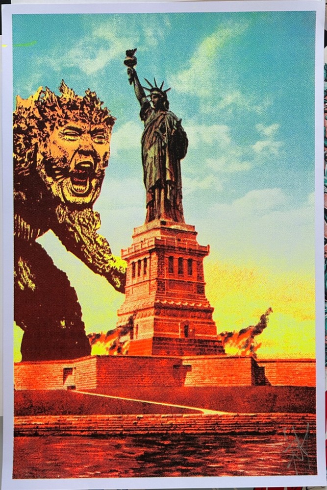First, I ship professionally: Kraft paper, good Yazoo tubes, and priority mailing. We are also quite quick. These are all from our 6000 piece poster collection. See Stootz on EB. Underpriced for a sale. Yes, very happy to combine shipping. The Horrific TRUMPZILLA!! by Blunt Graffix.
