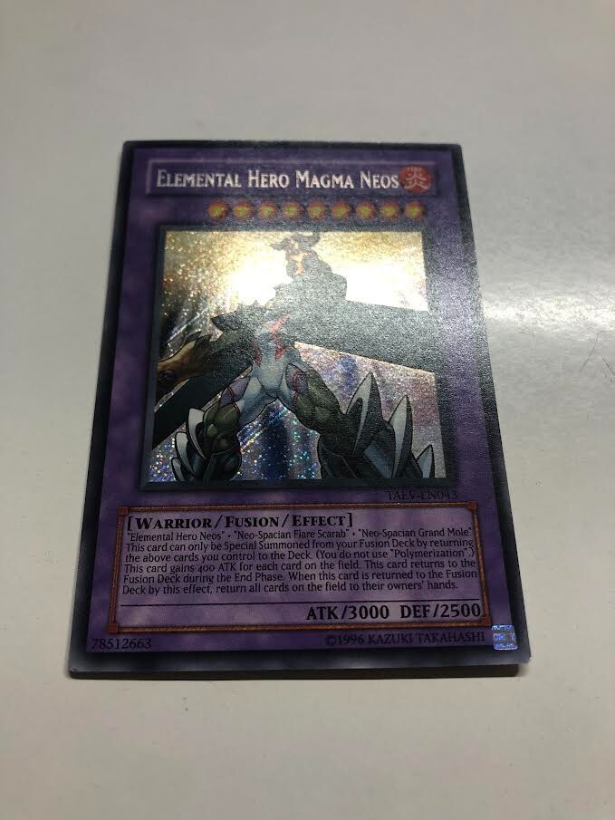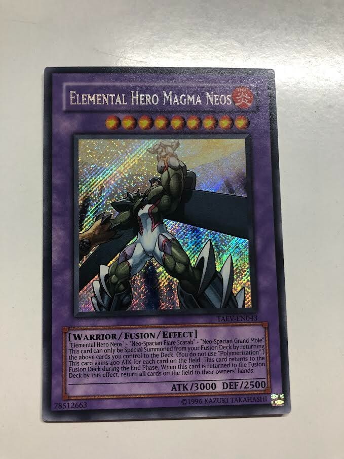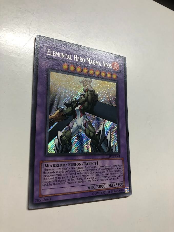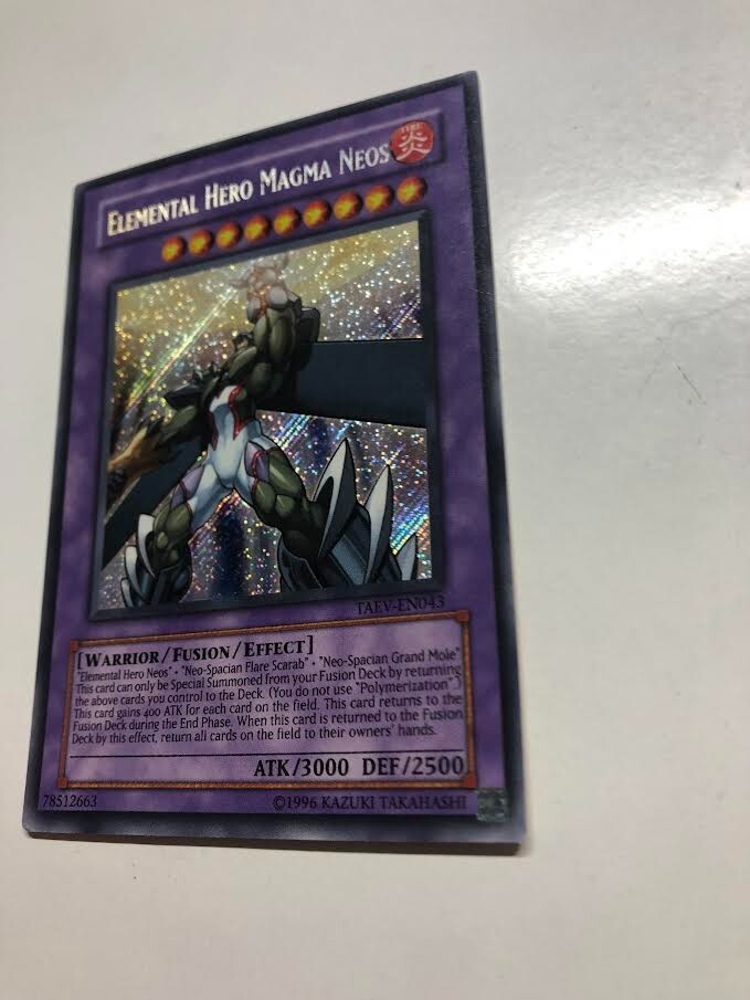 =====You are Getting===== USA Seller Yugioh Elemental Hero Magma Neos TAEV-EN043 Secret Rare NM =====Shipping===== We also do combined shipping for all the items you buy from us! We will do our best to ship all the items within 2 business days after payment is received and we will double check before we send. Please double check your address to prevent any unnecessary delay. ===Others=== Please contact us if there are any questions or problems. We will try our best to respond as fast as possible. Please leave us positive feedback and we will leave you feedback too once we receive feedback from you. If there are anything that you are not satisfied with your purchase, please do not hesitate to give us a message. We strive to make great communication with our buyers. Happy buying or bidding!! Thank You!!