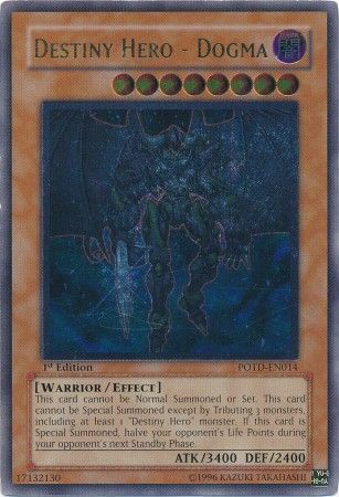 Home Products About Add Us Feedback Contact Us Ultimate Rare - Destiny Hero - Dogma - POTD-EN014 1st Edition Product Description Ultimate Rare - Destiny Hero - Dogma - POTD-EN014 1st Edition Power of the Duelist was the 20th expansion of the Yugioh TCG. It was released in August of 2006 and consisted of 85 cards total. Noteworthy cards from Power of the Duelist include Chimeratech Overdragon, Elemental Hero Dark Neos, Future Fusion & Neo-Spacian Dark Panther. This set is the first that uses a 4 character naming system instead of the previous 3 character version. This set also introduces “Alien” monsters. Power of the Duelist consists of the following rarity breakdown: 35 Commons 14 Rares 7 Super Rares 4 Ultra Rares 25 Ultimate Rares Condition: Lightly played (Excellent) Additional Information When Shipments Are Made Shipments are made within the 2-3 business days of payment being received. Payments Payments must be received within 3 days of purchasing this item. Our Hours We are open from Monday to Friday 9 a.m. to 5 p.m. EST. If you have questions, please send us an eBay message. Our customer service representatives make every effort to answer your emails within 24 hours of being received. Our offices are closed on public holidays. International Buyers - Please Note: Import duties, taxes, and charges are not included in the item price or shipping cost. These charges are the buyer's responsibility. Please check with your country's customs office to determine what these additional costs will be prior to bidding or buying. Auction format and description, in-house images and in-house photos © 2025 and ™ Troll and Toad Enterprises All rights reserved.