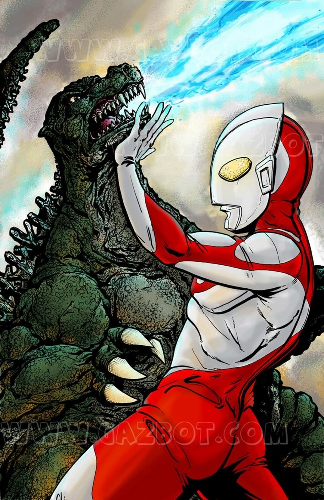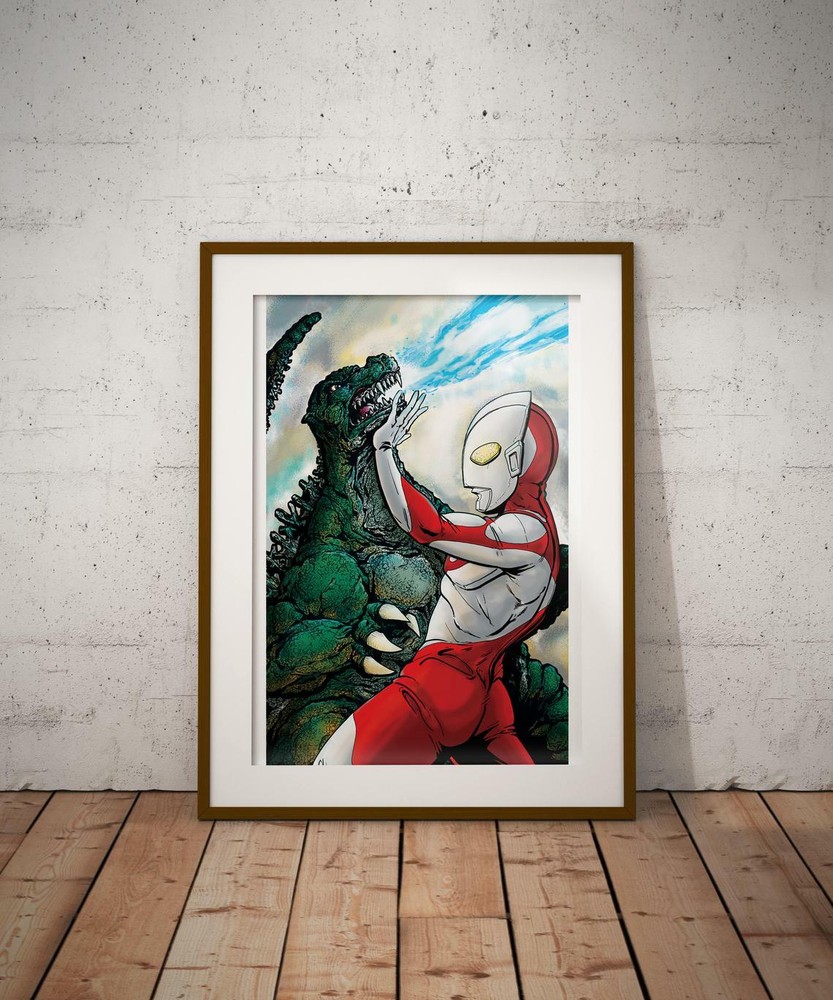 Art By Comic Artist and Illustrator GAZBOT Full Color Print of The original Ultraman (Hayata) vs a non-specific Heisei era Godzilla Paper size is 11x17 inches with a white border roughly 1/4 inch on top and bottom. Printed on card stock with a Matte finish. Shipped flat with a clear fitted bag and thick backing board.