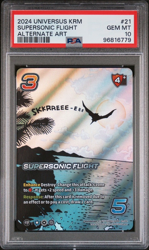 This UniVersus Challenger Series Godzilla Supersonic Flight Alt Art PSA 10 is an ultra-rare card featuring King Ghidorah and dinosaurs. It is a standard size card made of card stock with a foil finish. The card is in English and was manufactured by UVS GAMES in the United States in 2024. The card is perfect for collectors of all ages and is suitable for children aged 4+. It is an attack card with an alternative art feature and belongs to the final stage of the UniVersus game. The card is not autographed and is part of the Godzilla set. Get your hands on this challenging card and add it to your collection today!