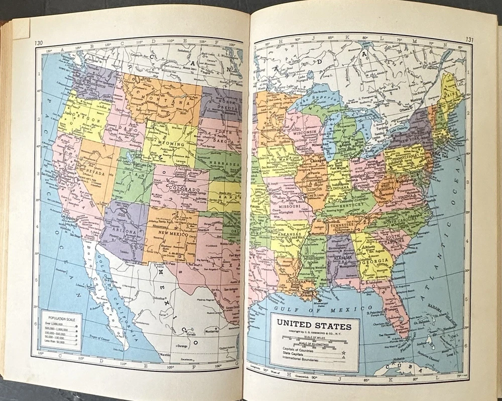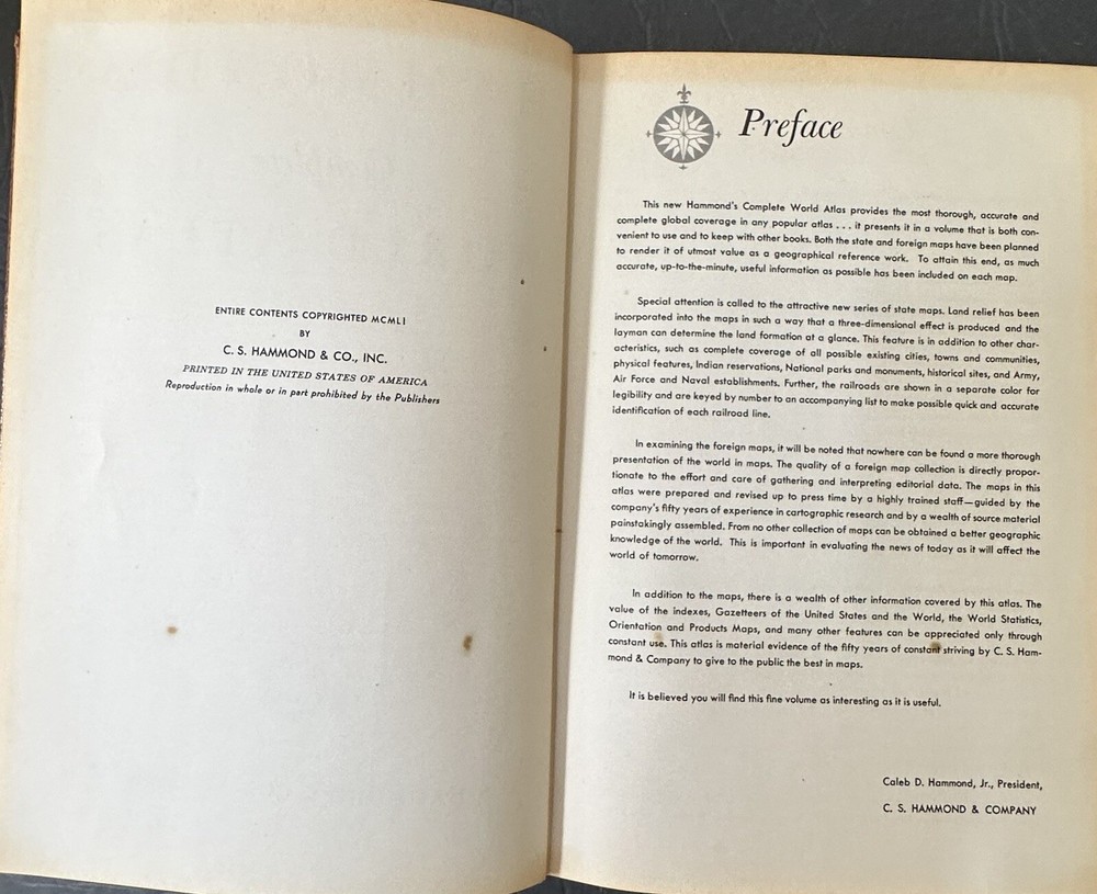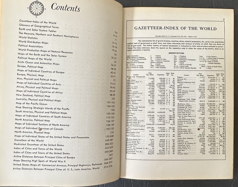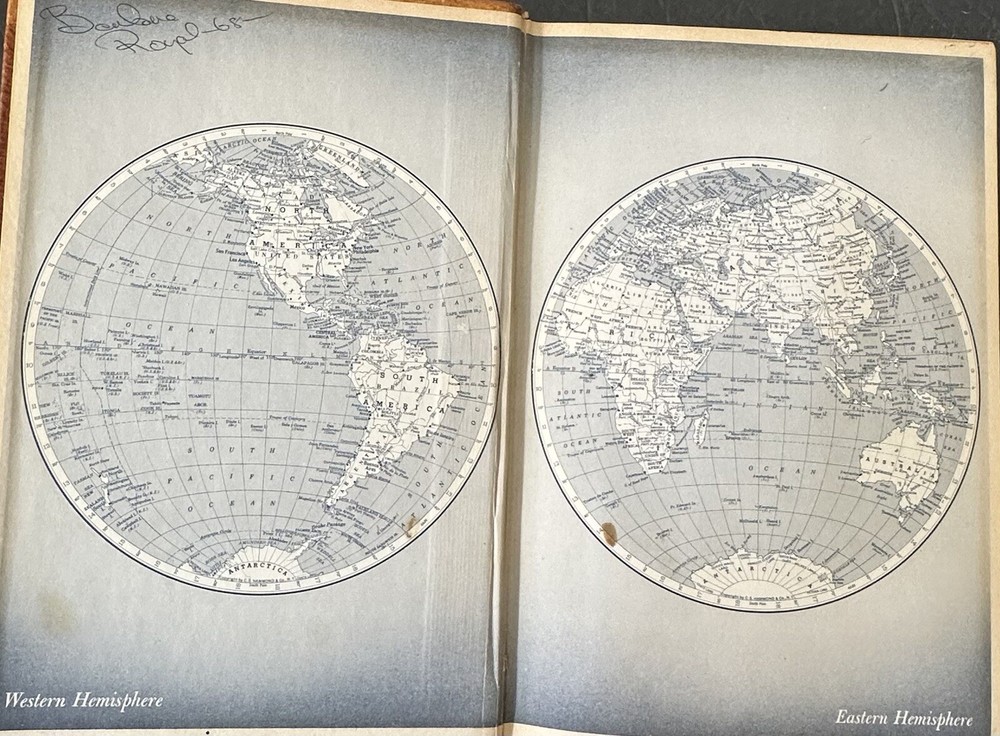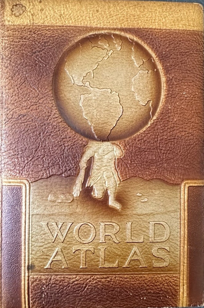 Preowned 1950 Hammond's Complete World Atlas. Good condition with wear on leather cover. 376 pages of charts and color maps. Add $6.00 s/h in the U.S.