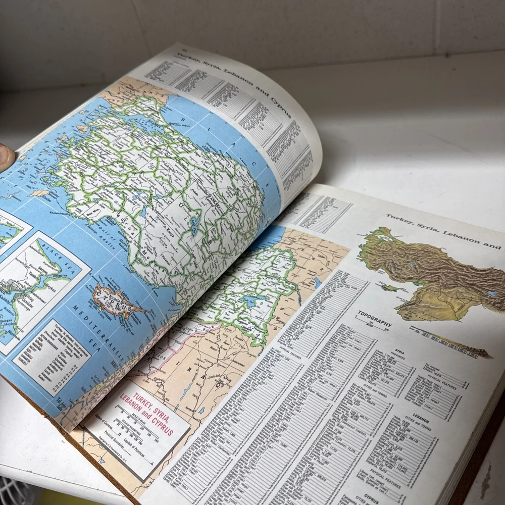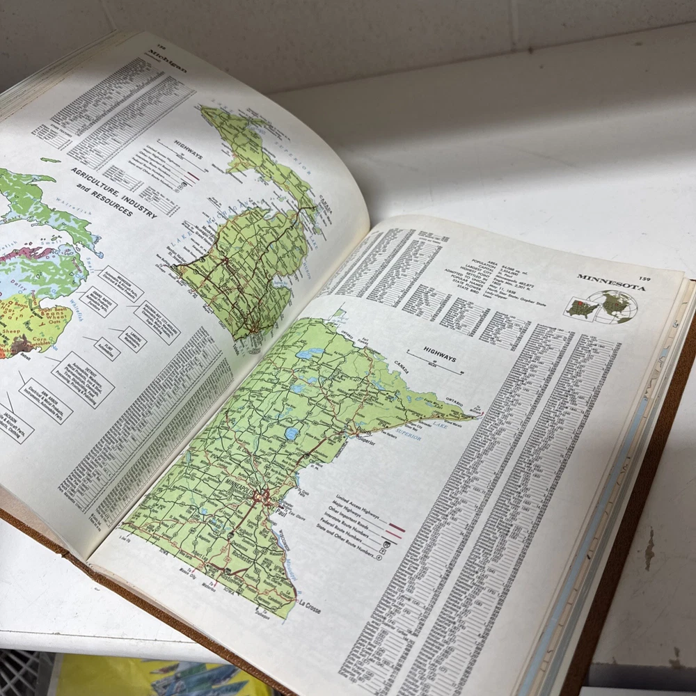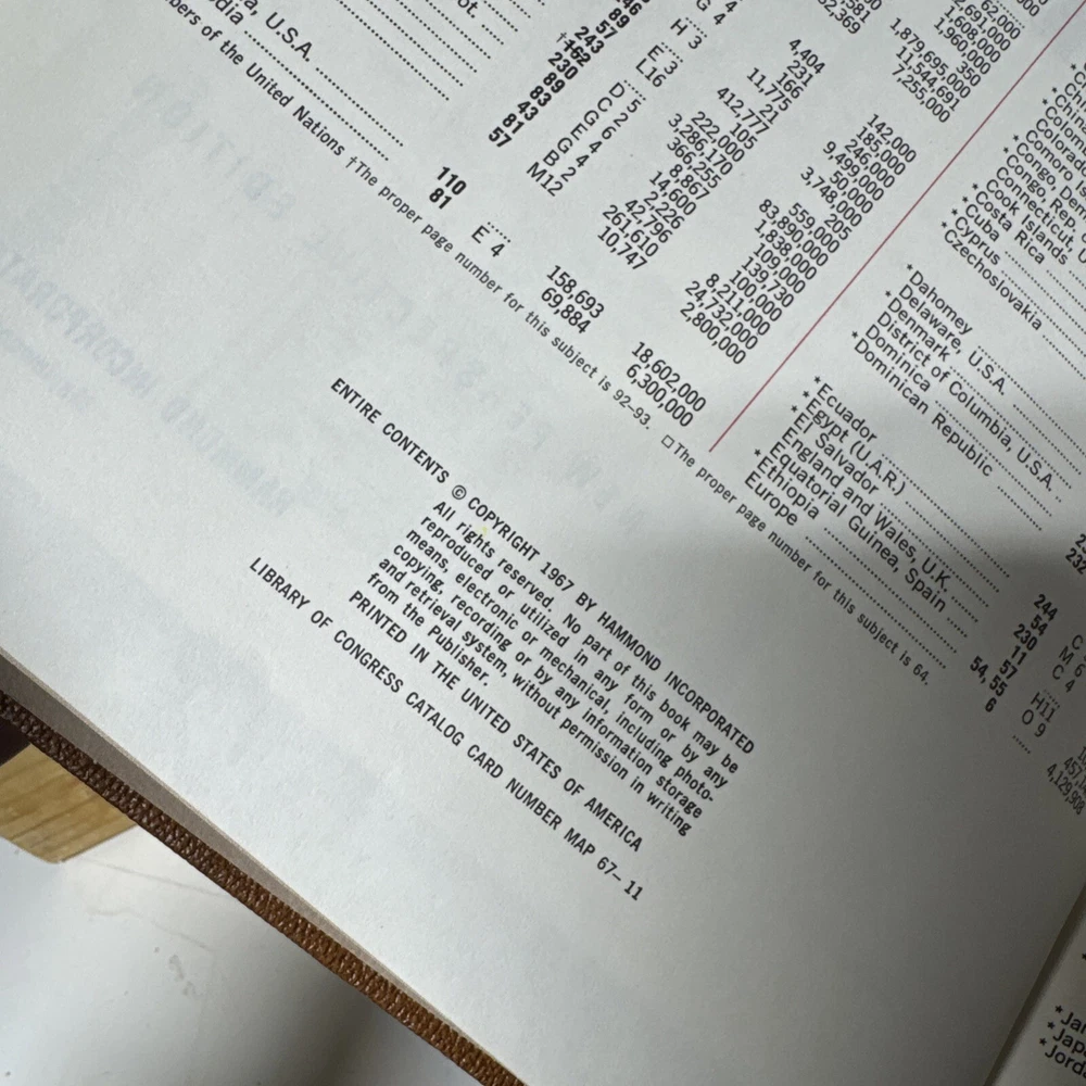 This vintage hardback book is a must-have for any collector or enthusiast of historical maps. The Award World Atlas by Hammond Inc. is a first edition, faux leather bound book with illustrated maps of the world's continents. Published in 1967, this book is a great addition to any collection and a fantastic resource for young adults, ages 9-12, and adults alike. The book features various illustrators and covers a range of topics including realism, post-modernism, and modernism. It is a non-fiction narrative type and comes in a unit quantity of one. This book is in English, the original language, and has a weight of 1lb. It is not personalized, inscribed, or ex libris. The book is a great find for anyone interested in books and maps and is a collector's edition.
