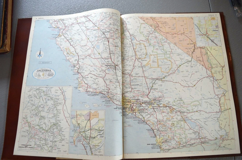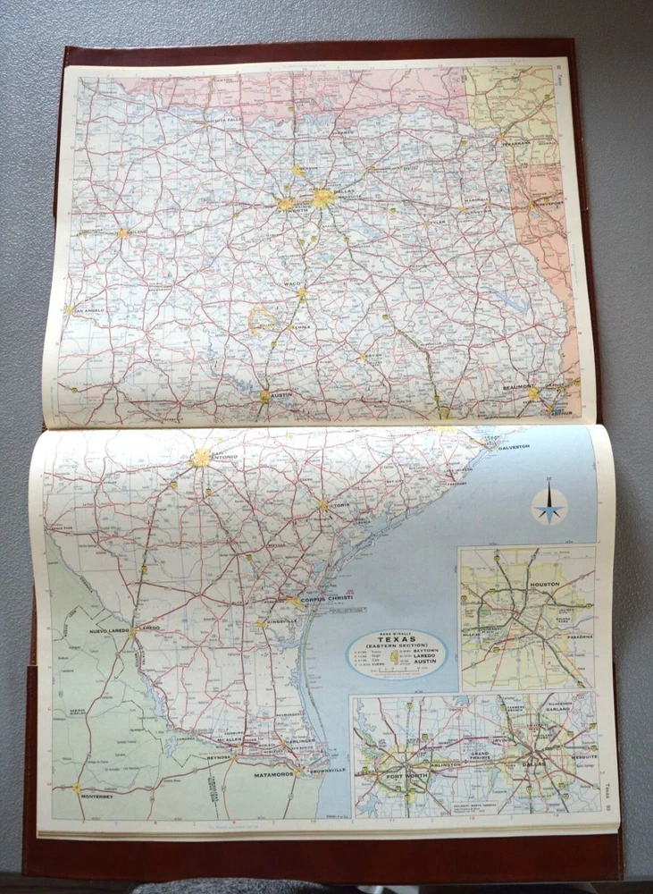 This leather-bound road atlas by Rand McNally covers the United States, Canada, and Mexico. Its durable design makes it suitable for travel and frequent use. • Leather-bound cover with high-quality stitching • Includes maps for United States, Canada, and Mexico • Detailed index for easy navigation • Published by Rand McNally • Compact and lightweight design for portability Slight scuffs and indentations on the leather cover. 15" x 12" Condition: Pre-Owned Good Size: 15" x 12" *please see all photos as they are part of the description *color interpretation may vary based on screen and lighting, I cannot guarantee how you will see it. *From Smoke Free Environment **Ships from Dallas Texas