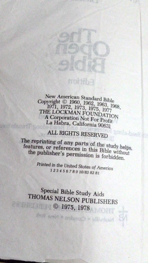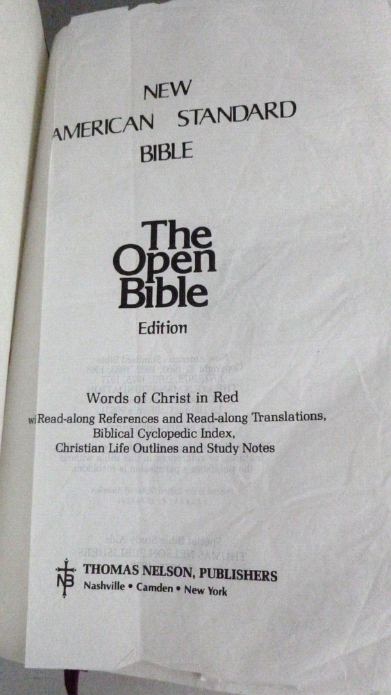 Up for your consideration is a vintage #944BG New American Standard Bible (NASB) The Open Bible Edition. Published by Thomas Nelson in the year 1978. Red leather cover with gold gilt lettering on cover and spine. Has gold page edges. Features Words of Christ in Red. With read-along references and read-along translations, Biblical cyclopedic index, Christian life outlines and study notes, colored maps in back, and integrated ribbon book marks. Printed in the USA. Dimensions measure about 8"x5.625"x1.5". Shows use, age, and wear. Has pen writing and markings inside cover, back notes section, and throughout the pages. Folded pages/corners. Wrinkles in pages. Please refer to pictures provided. If you have any problems or questions, feel free to send a message and I will get back to you as soon as possible. Fast & Free Shipping! American seller, buy with confidence! If you experience any problems or concerns please send me a message BEFORE leaving feedback.