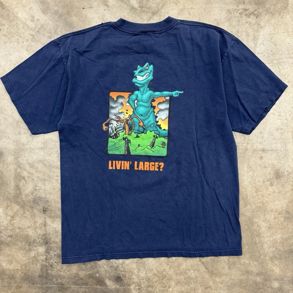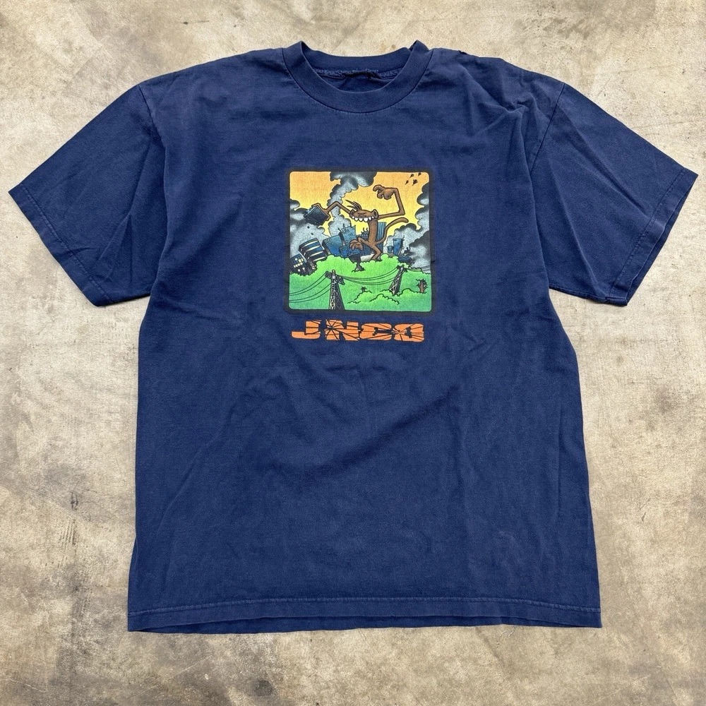 This vintage JNCO Jeans t-shirt features a colorful graphic print of the beloved 90s character Godzilla, living large and ready to take on any season. Made of comfortable and breathable cotton knit fabric, this limited edition tee is perfect for any fan of the artful and animalistic theme. The shirt is easy to care for and has been pre-shrunk to ensure a perfect fit for size XL. The crew neck and short sleeve design make it suitable for both casual and active wear, and the logo accents add a touch of retro style. This shirt is a rare find for any collector or enthusiast of 90s fashion and Godzilla memorabilia. Don't miss out on the chance to add this unique piece to your collection. Size XL, cut tag. Measurements pictured