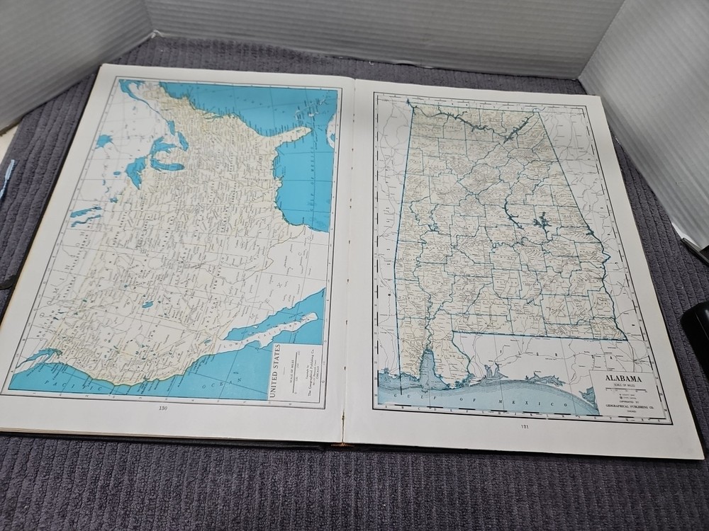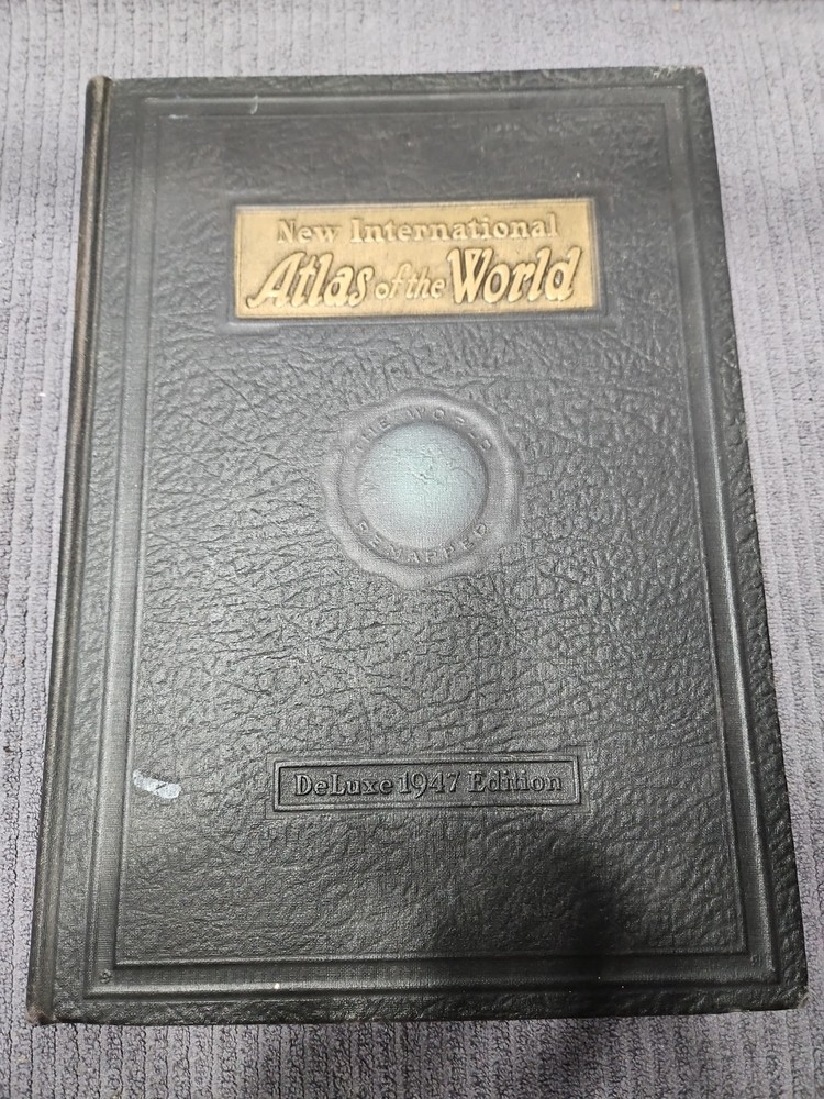 This vintage 1947 edition of the New International Atlas of the World is a must-have for collectors and enthusiasts of historical atlases. The hardcover leather binding and deluxe war edition make it a unique and valuable addition to any collection. The atlas is filled with illustrated maps and war editions, providing a fascinating insight into the world during this time period. The Geographical Publishing Company published this original piece in English, and it is sure to be a cherished item for years to come. The atlas falls under the category of books and magazines, specifically antiquarian and collectible. Its intricate details and historical significance make it a perfect gift for anyone interested in geography, maps, and history.