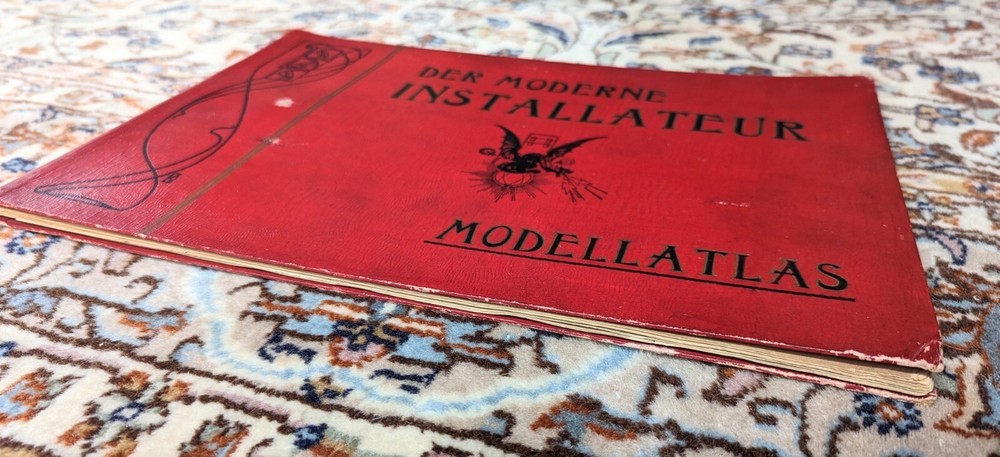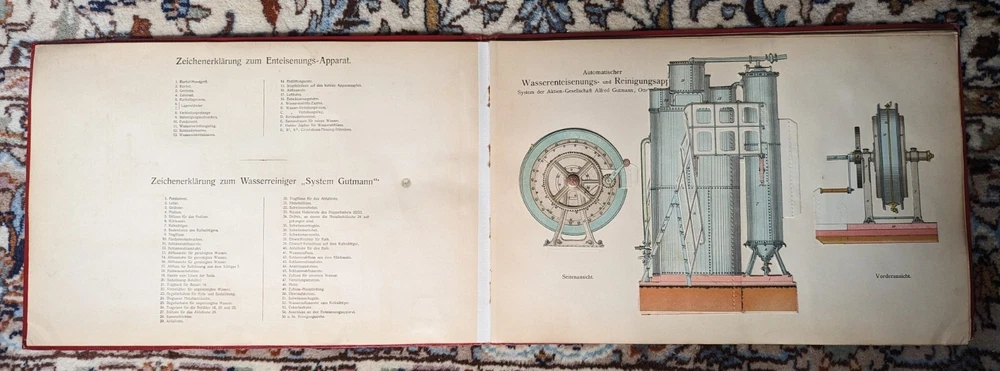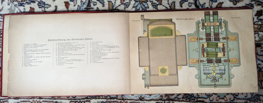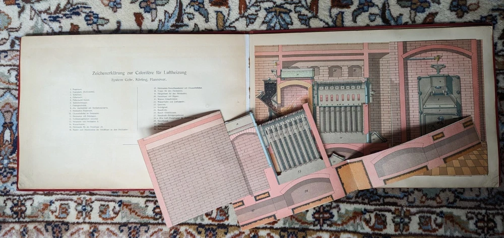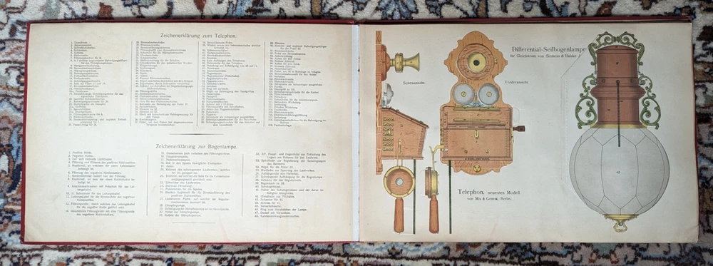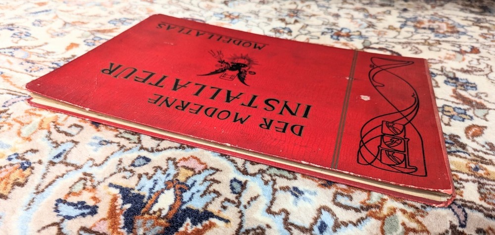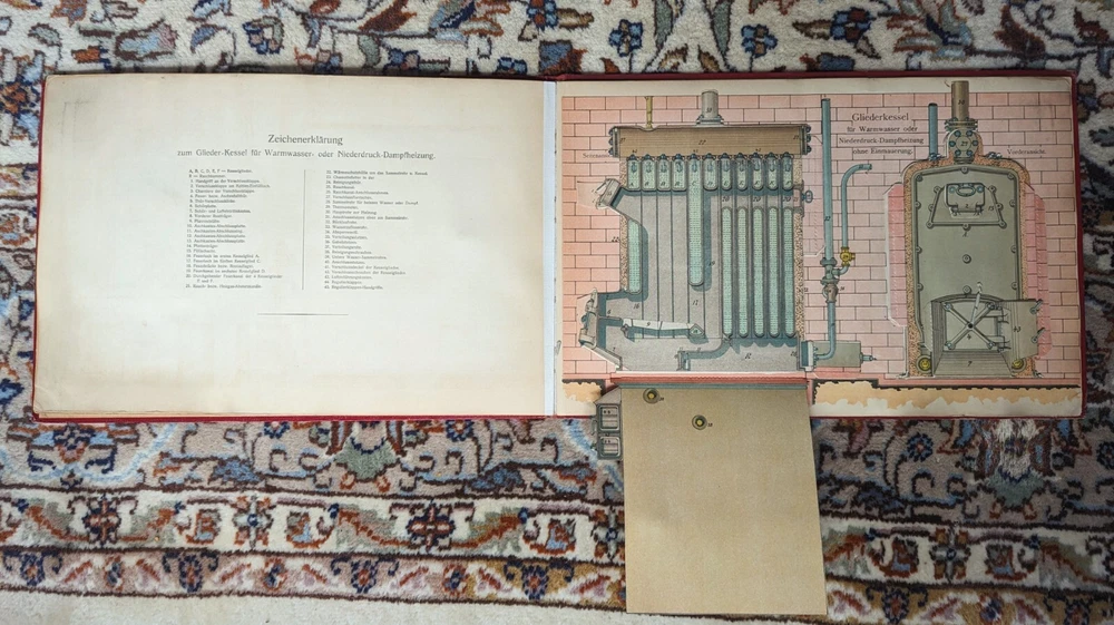 Wonderful German Engineering book with several pop out models depicting the following; 1) Electric Meter 2) Telephone 3) Differential Cable Arc Lamp 4) Automatic Water Cleaning Apparatus 5) Neuhaus Pulsometer 6) Cast-iron Fin Heater 7) Sectional Boiler for Heating 8) Acetylene Gas Apparatus 9) Incandescent Lamp Book is in great shape, and would make a fantastic present for that special engineer or collector.