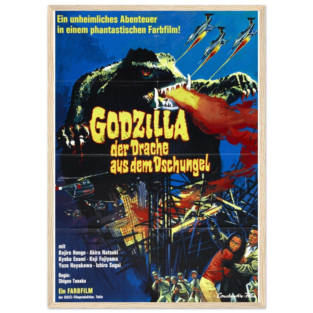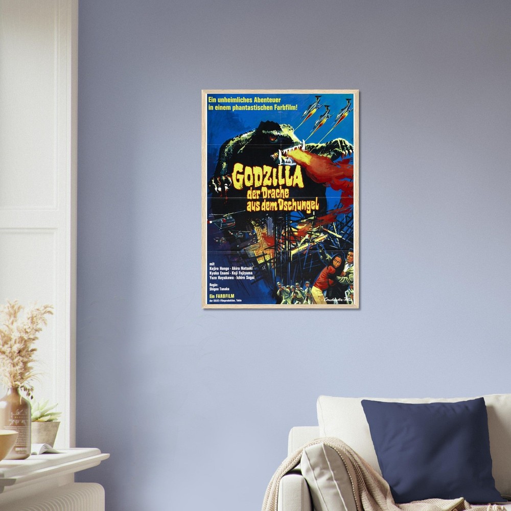 A striking retro movie poster featuring the iconic Godzilla breathing fire amidst attacking jets and city destruction. Bold German text headlines this dramatic vintage film artwork, showcasing vibrant yellows and blues against dark backgrounds. Classic kaiju monster movie aesthetic with dynamic action scenes --- Our sturdy wooden framed posters come ready to hang and are printed on heavyweight white matte paper with a smooth, luxurious finish—designed to stand the test of time: Ready-to-hang: Includes hanging kit, ready to hang directly on the wall. Frame Material: Durable pine wood. Frame Measurements: 20-25mm (0.79"-0.98") thick, 10-14mm (0.4"-0.6") wide. Paper Weight: 200 gsm (80 lb), thickness: 0.22 mm (8.7 mils). Paper Finishing: Matte, smooth, non-reflective surface. Protection: Shatterproof plexiglass protects the poster. Sustainable Paper: FSC-certified materials or equivalent.