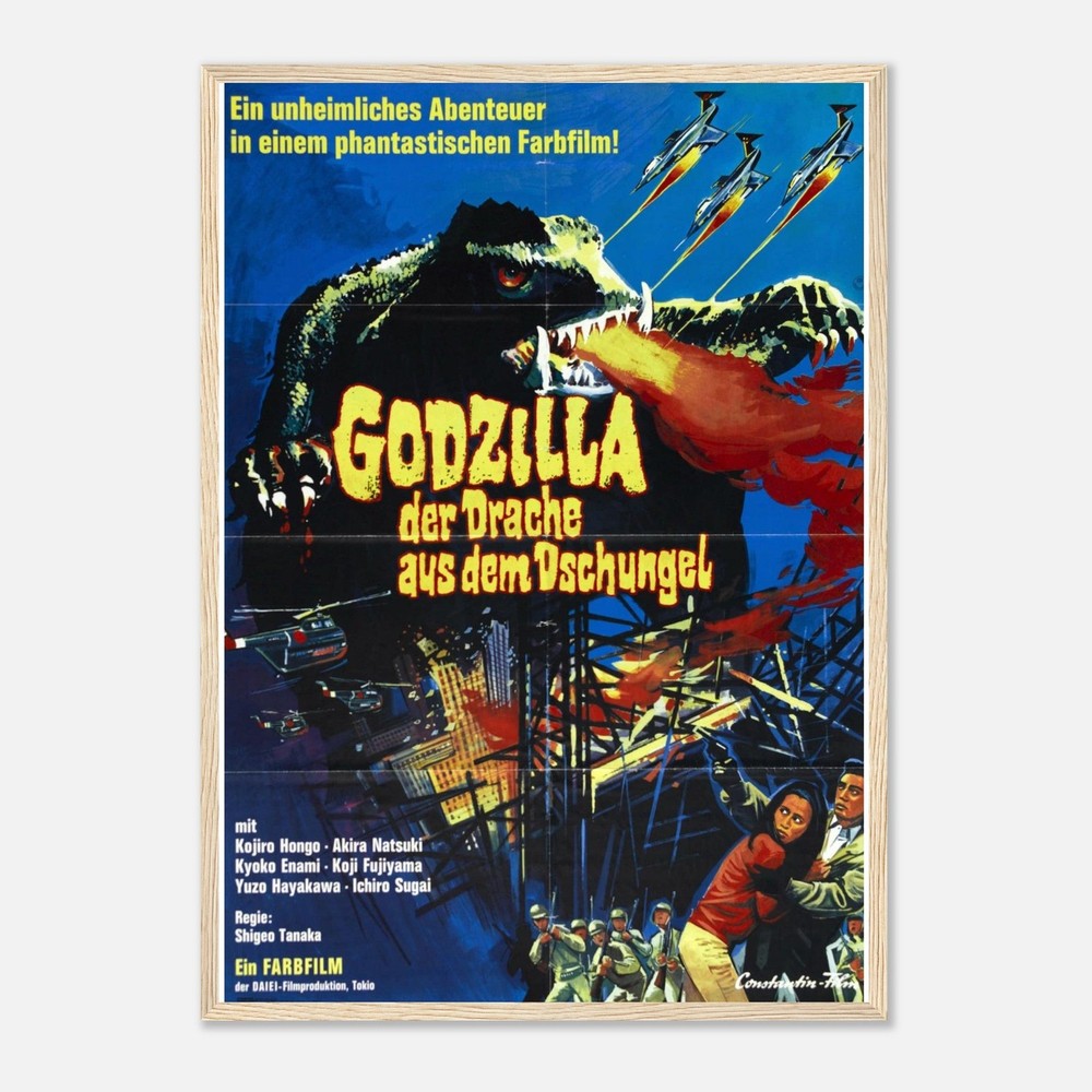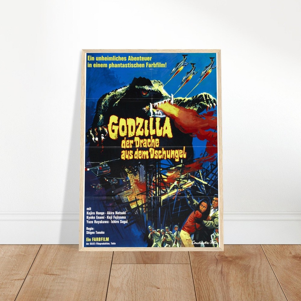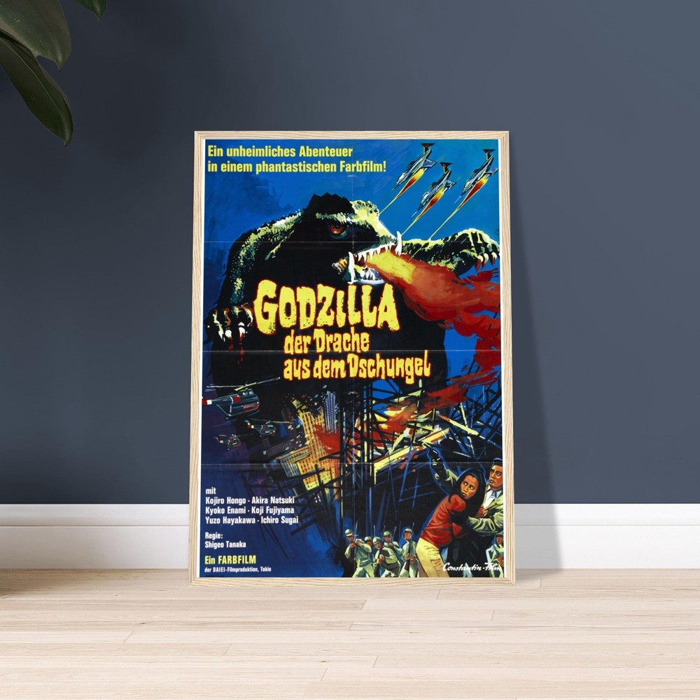 Dramatic vintage German movie poster featuring the iconic Godzilla unleashing fiery breath amid a cityscape. Bold yellows and reds contrast against deep blues, showcasing classic kaiju film art style. Features dramatic typography and intense action scenes with military aircraft engaging the monster --- Our sturdy wooden framed posters come ready to hang and are printed on heavyweight white matte paper with a smooth, luxurious finish—designed to stand the test of time: Ready-to-hang: Includes hanging kit, ready to hang directly on the wall. Frame Material: Durable pine wood. Frame Measurements: 20-25mm (0.79"-0.98") thick, 10-14mm (0.4"-0.6") wide. Paper Weight: 200 gsm (80 lb), thickness: 0.22 mm (8.7 mils). Paper Finishing: Matte, smooth, non-reflective surface. Protection: Shatterproof plexiglass protects the poster. Sustainable Paper: FSC-certified materials or equivalent.
