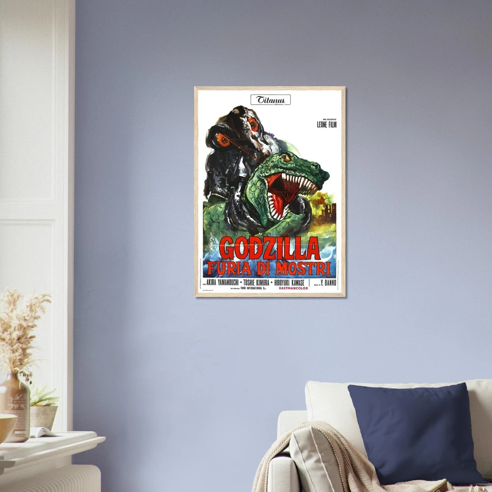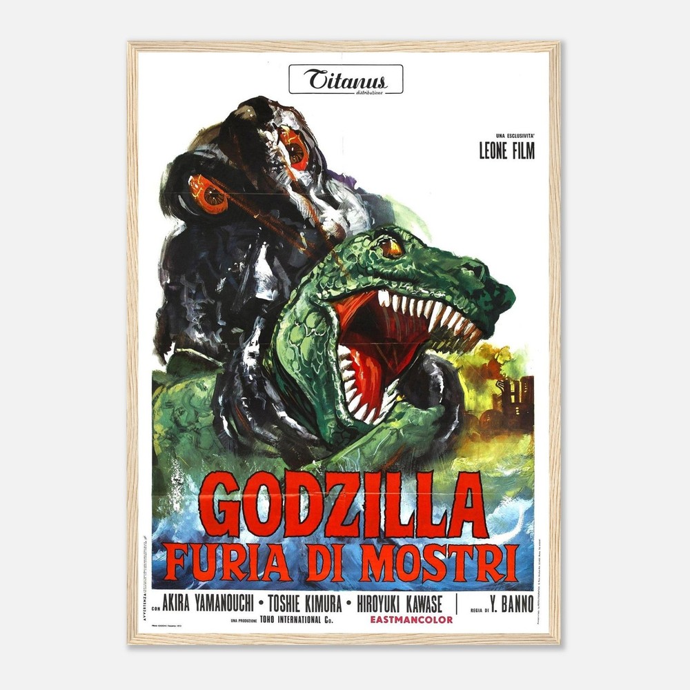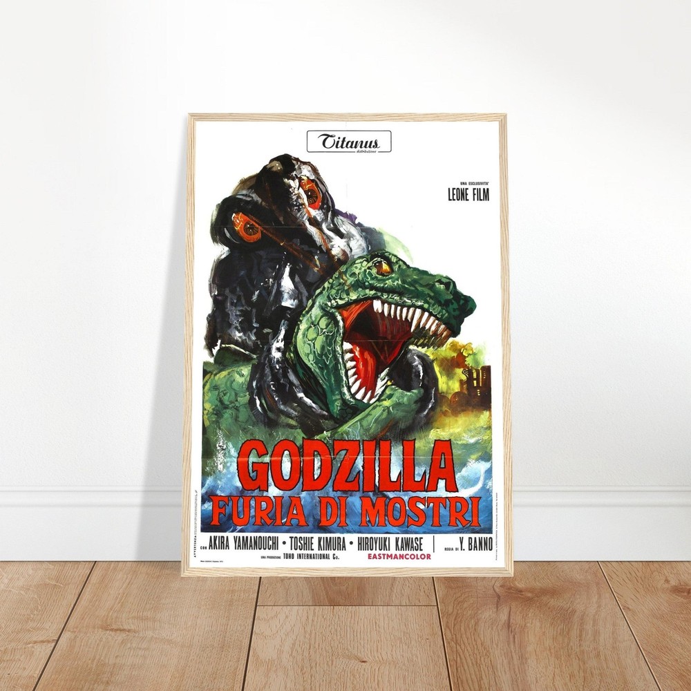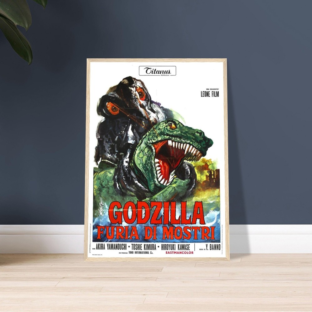 Classic Italian movie poster artwork featuring a dramatic battle between Godzilla and a ferocious dinosaur-like monster. Bold, retro illustration style with vivid greens and blacks, showcasing the creatures' menacing faces and sharp teeth. Perfect for fans of vintage horror, Japanese kaiju films, and classic movie poster art --- Our sturdy wooden framed posters come ready to hang and are printed on heavyweight white matte paper with a smooth, luxurious finish—designed to stand the test of time: Ready-to-hang: Includes hanging kit, ready to hang directly on the wall. Frame Material: Durable pine wood. Frame Measurements: 20-25mm (0.79"-0.98") thick, 10-14mm (0.4"-0.6") wide. Paper Weight: 200 gsm (80 lb), thickness: 0.22 mm (8.7 mils). Paper Finishing: Matte, smooth, non-reflective surface. Protection: Shatterproof plexiglass protects the poster. Sustainable Paper: FSC-certified materials or equivalent.
