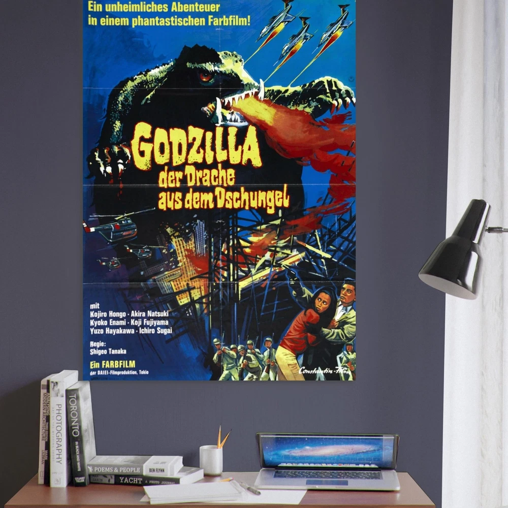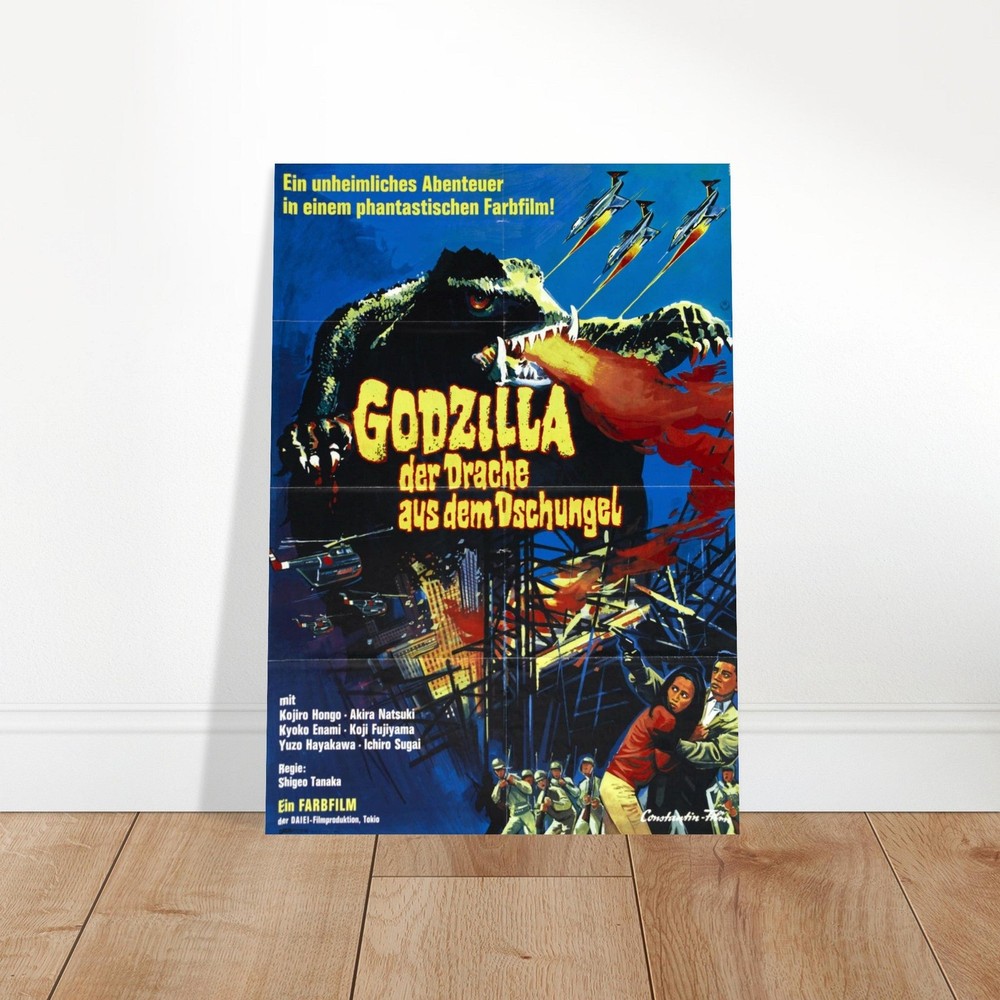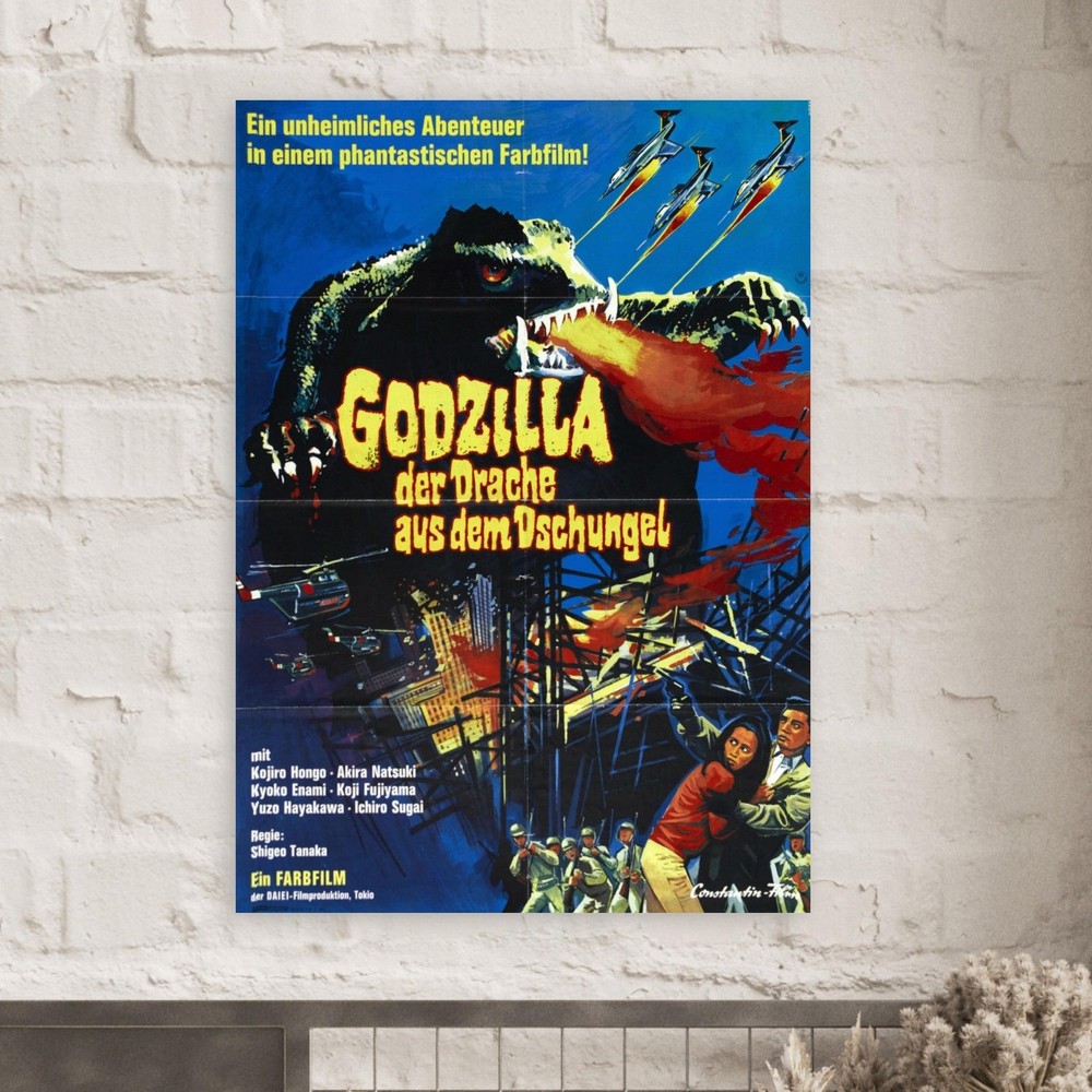 Dramatic vintage movie poster featuring a fierce Godzilla breathing fire against military aircraft. This retro German film poster captures the classic kaiju action with vibrant yellows and blues contrasting against the dark monster. Bold German text and dynamic composition create an exciting sci-fi atmosphere --- FREE SHIPPING FOR EACH EXTRA POSTER YOU ORDER! Our premium semi-glossy paper enhances colors with a subtle shine and protects against fading from light or moisture: Paper Finishing: Semi-glossy, enhances colors with a subtle shine. Paper Weight: 200 gsm (80 lb), thickness: 0.22 mm (8.7 mils). Sustainable Paper: FSC-certified or equivalent paper for sustainability.
