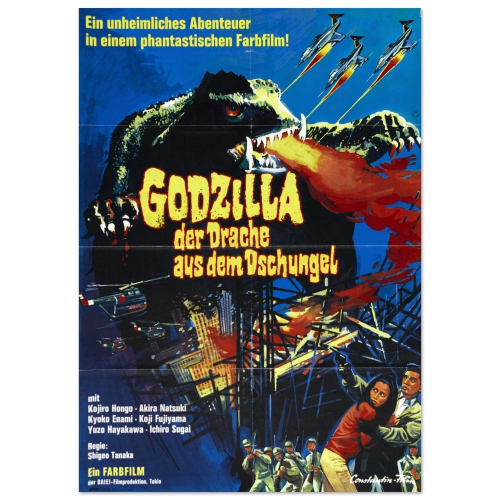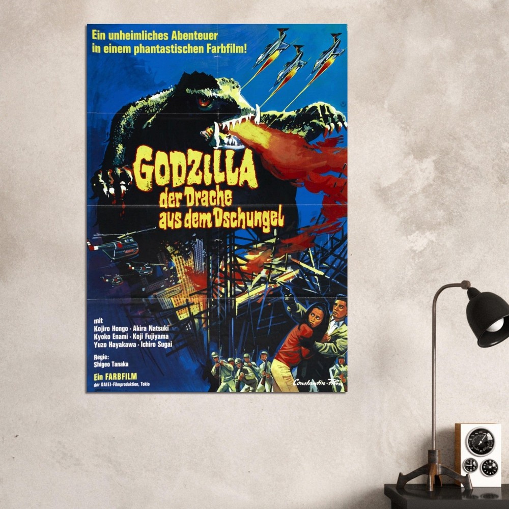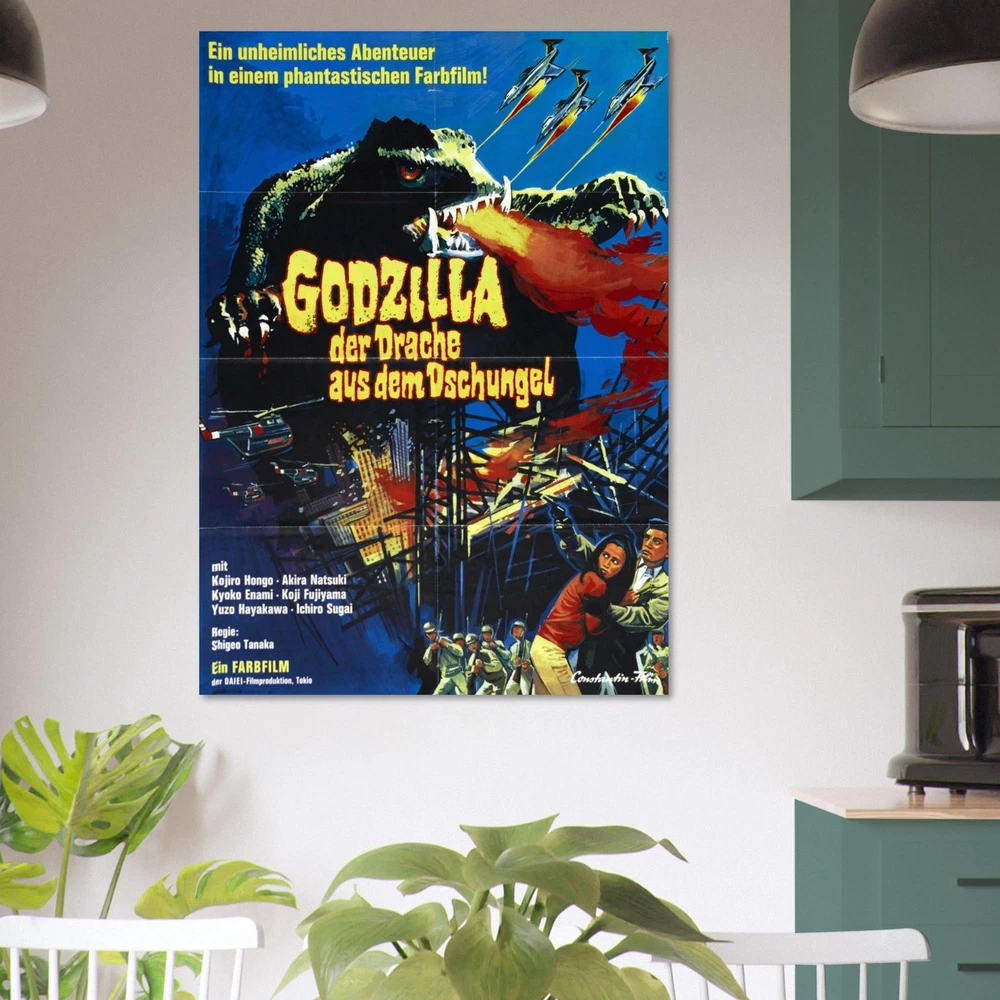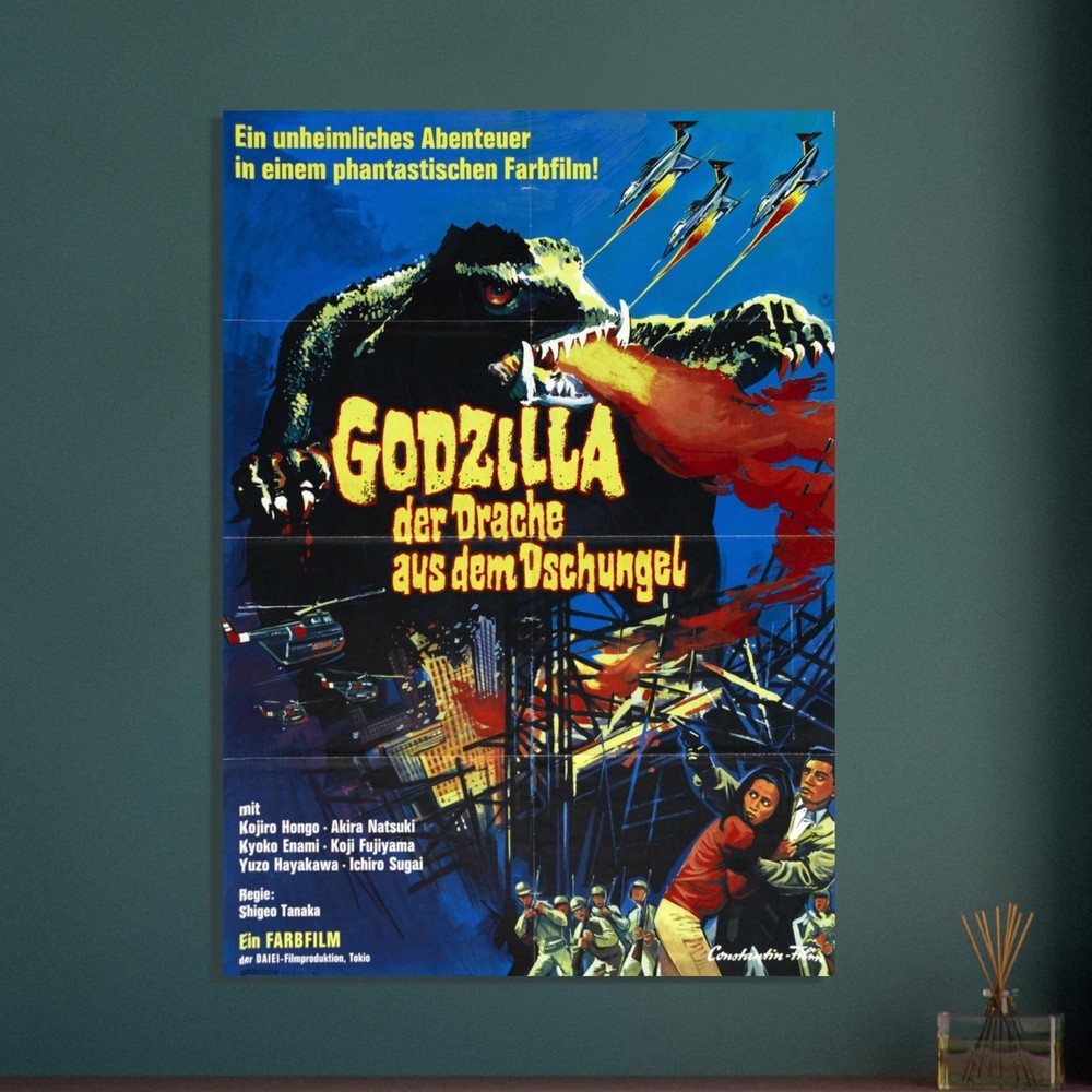 Dramatic vintage movie poster featuring a fierce Godzilla breathing fire against military aircraft. This retro German film poster captures the classic kaiju action with vibrant yellows and blues contrasting against the dark monster. Bold German text and dynamic composition create an exciting sci-fi atmosphere --- FREE SHIPPING FOR EACH EXTRA POSTER YOU ORDER! Our premium semi-glossy paper enhances colors with a subtle shine and protects against fading from light or moisture: Paper Finishing: Semi-glossy, enhances colors with a subtle shine. Paper Weight: 200 gsm (80 lb), thickness: 0.22 mm (8.7 mils). Sustainable Paper: FSC-certified or equivalent paper for sustainability.