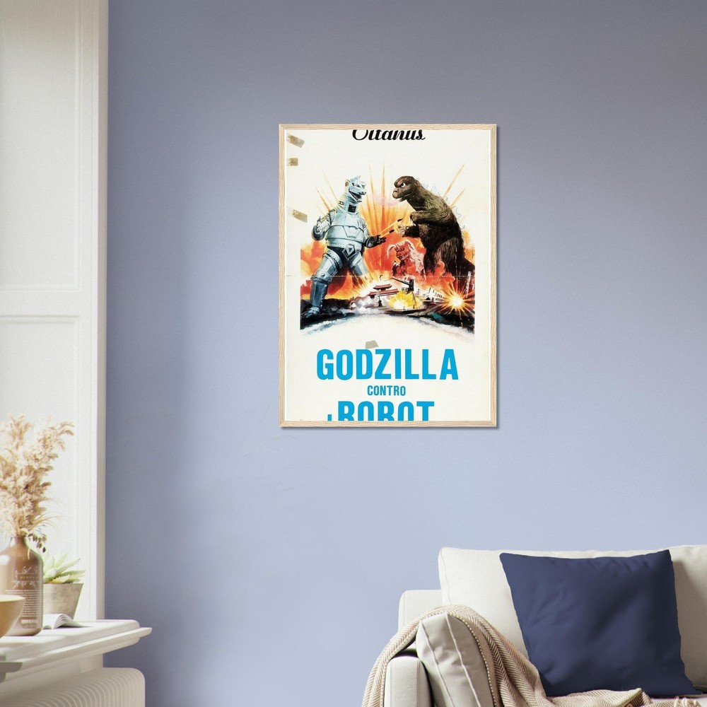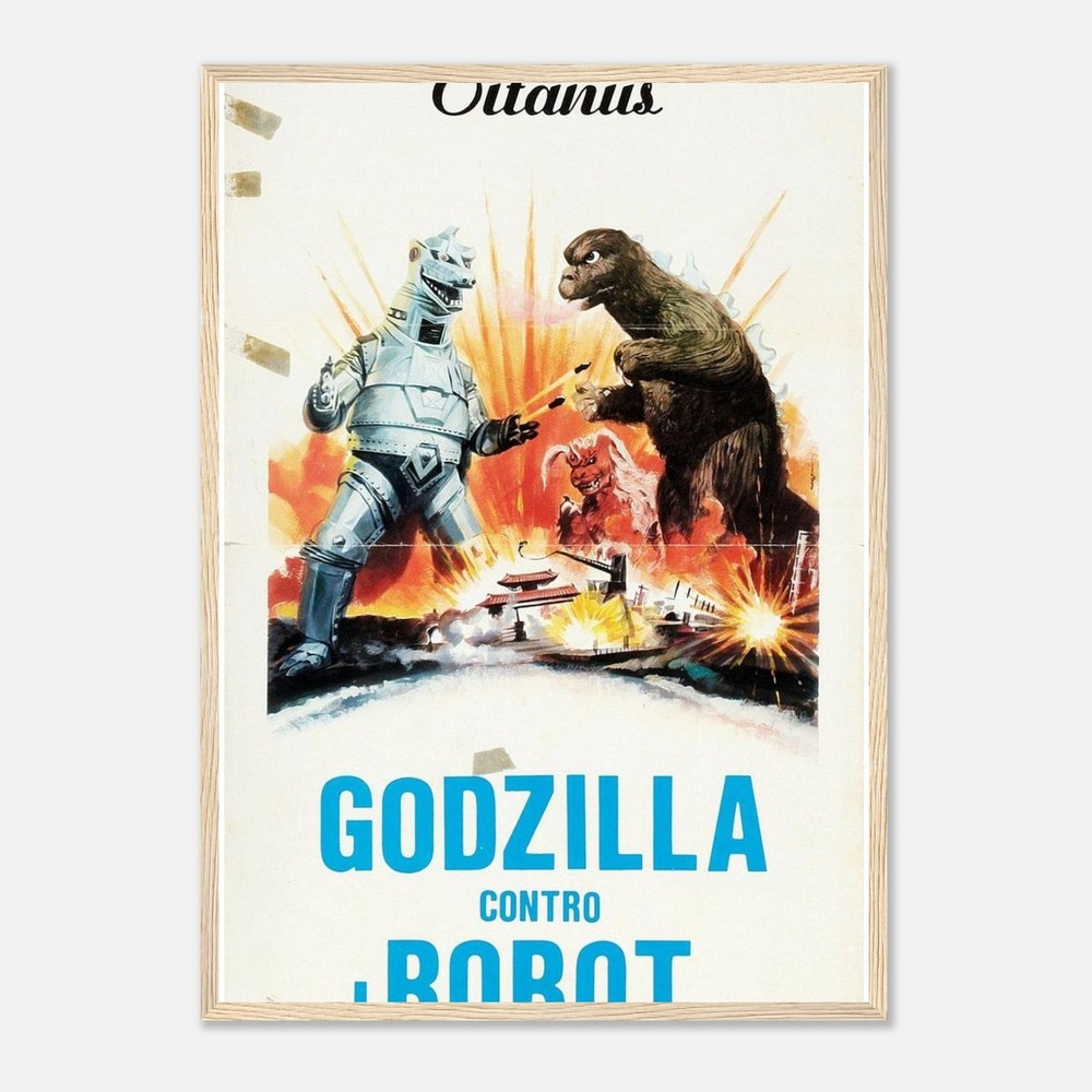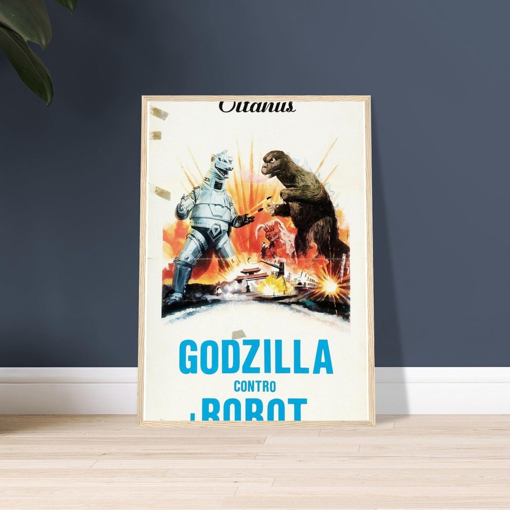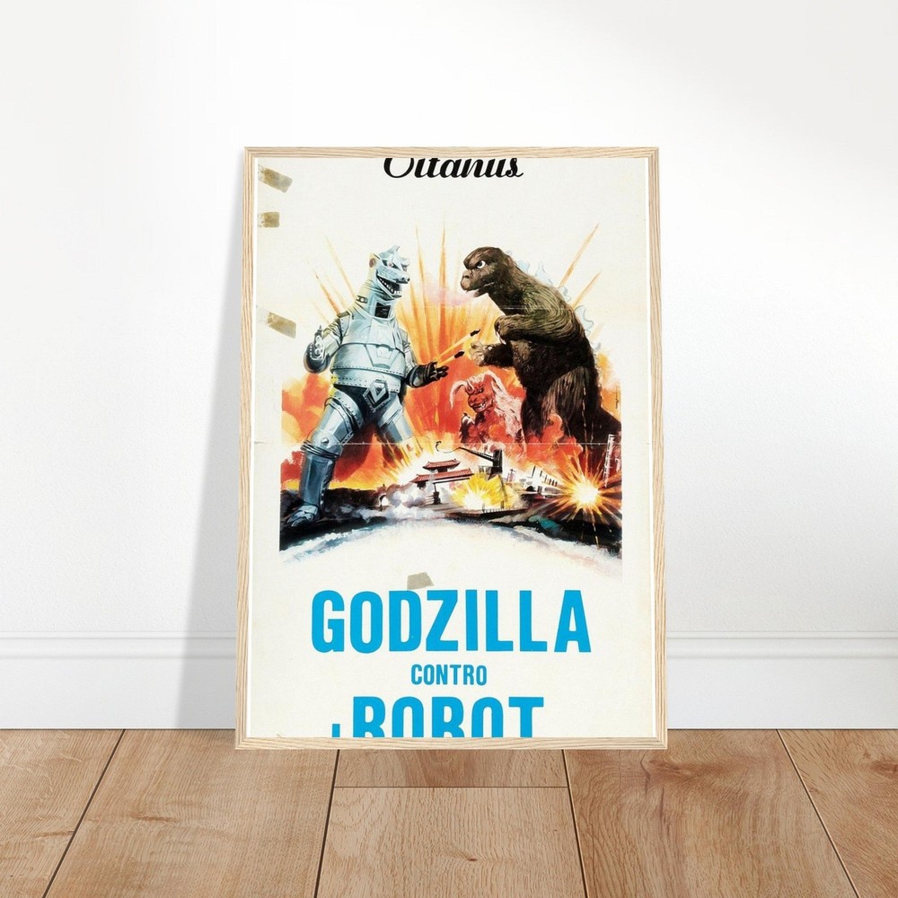 Dramatic retro movie poster artwork featuring an epic battle between Godzilla and a mechanical adversary. Set against an explosive orange and yellow background, this vintage-style illustration captures the classic kaiju action scene with bold colors and dynamic composition. Perfect for fans of classic monster movies and retro sci-fi artwork --- Our sturdy wooden framed posters come ready to hang and are printed on heavyweight white matte paper with a smooth, luxurious finish—designed to stand the test of time: Ready-to-hang: Includes hanging kit, ready to hang directly on the wall. Frame Material: Durable pine wood. Frame Measurements: 20-25mm (0.79"-0.98") thick, 10-14mm (0.4"-0.6") wide. Paper Weight: 200 gsm (80 lb), thickness: 0.22 mm (8.7 mils). Paper Finishing: Matte, smooth, non-reflective surface. Protection: Shatterproof plexiglass protects the poster. Sustainable Paper: FSC-certified materials or equivalent.