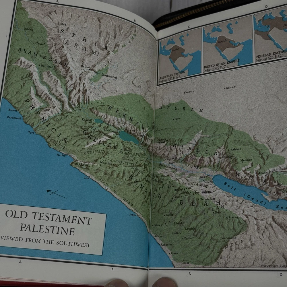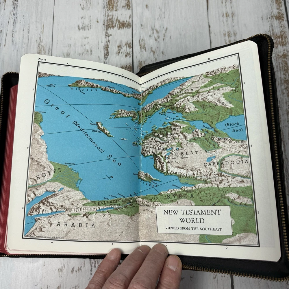 Red edge to pages. Nice clean Bible zip cover. This vintage Holy Bible from the American Bible Society is a beautiful addition to any collection. With a leather cover and maps, this KJV Bible from the 1950s series is perfect for both young adults and adults who are interested in Christianity and the Bible. The book is in excellent condition and is a great treasure for anyone who values history and the teachings of the Bible.