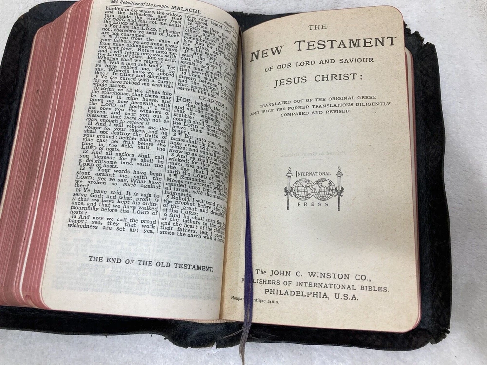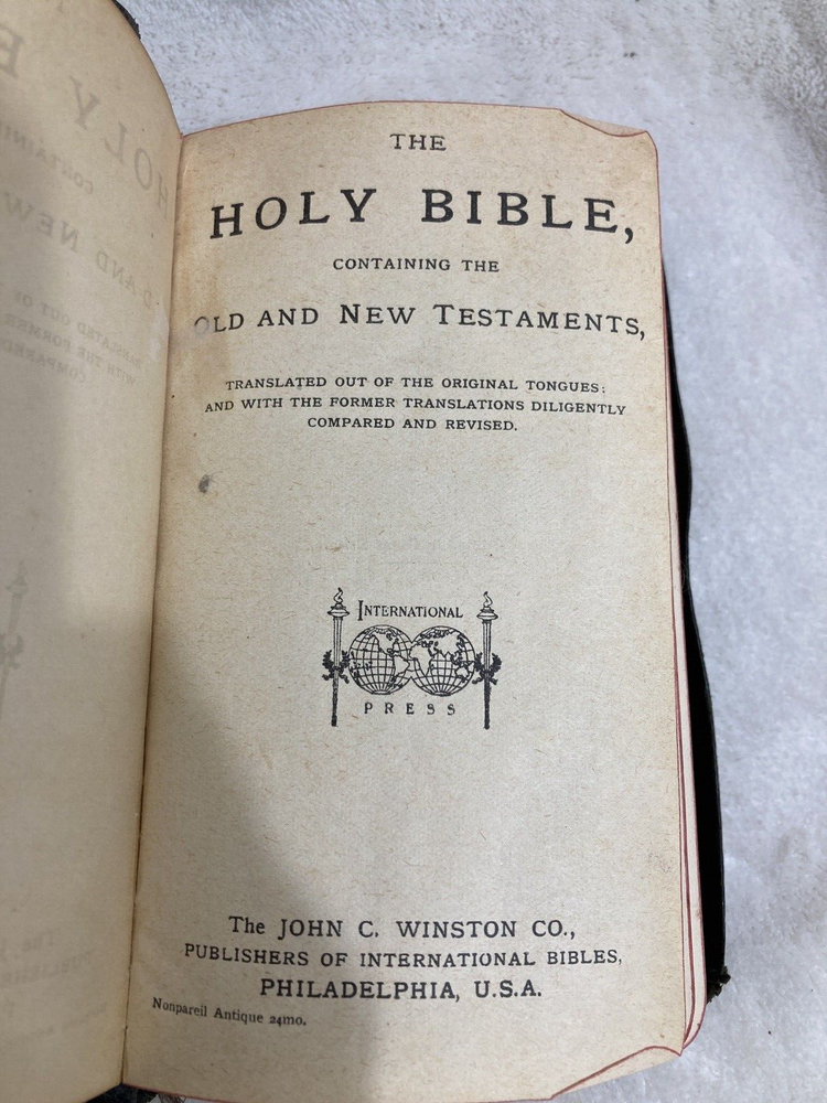 Vintage Holy Bible, International Series, Leather, Silk Sewn Printed Great Britian The John C. Winston Company Appears to have a name on cover Chester??? Also Mrs W.F. Blackmore?? inside...