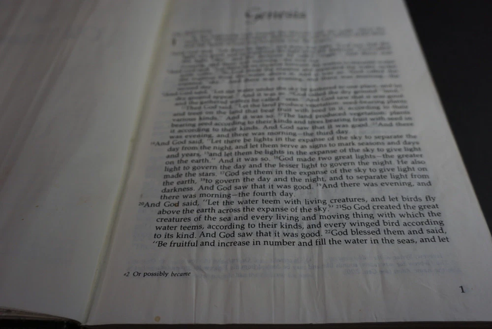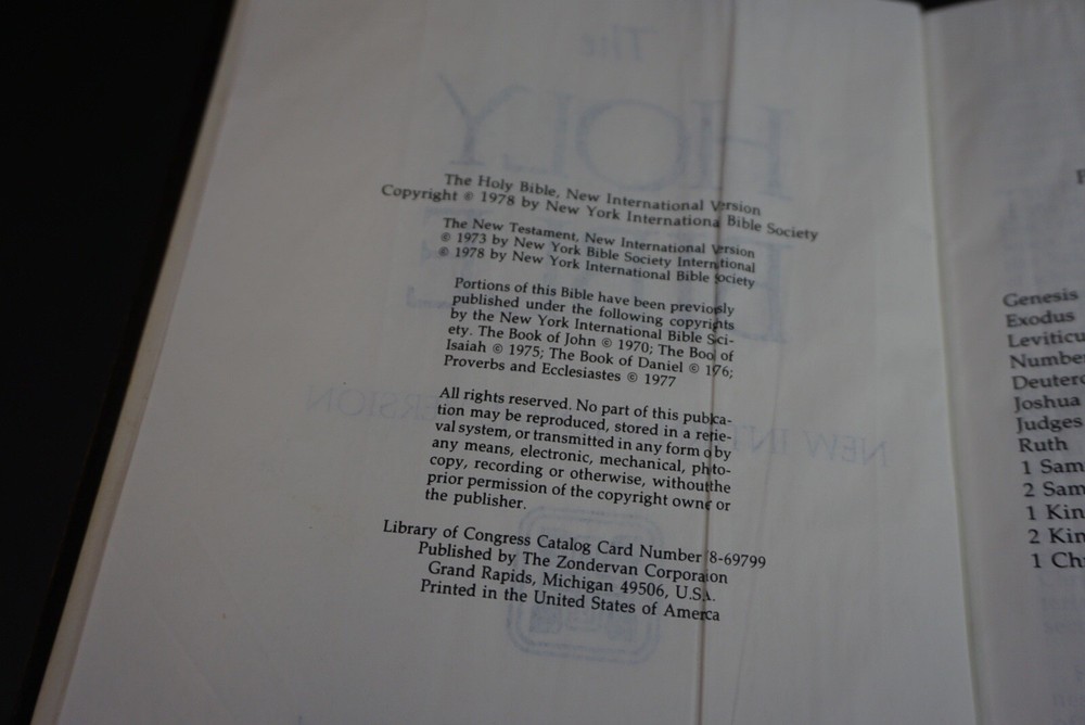Vintage Holy Bible New International Version Zonervan Publishers 1978. Vintage Holly Bible New International Version! This vintage bible was printed in 1978 by Zonervan Publishers. It has a brown leather hardcover with gold details. There are also pages of color printed maps. In great vintage condition, signs of age and wear on the cover and first few pages have some folding, please see photos for details.