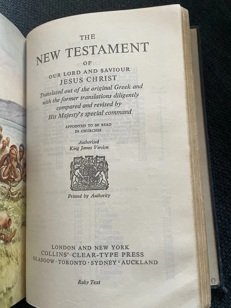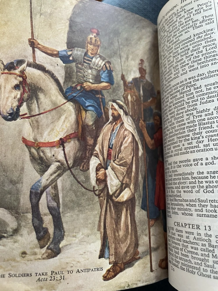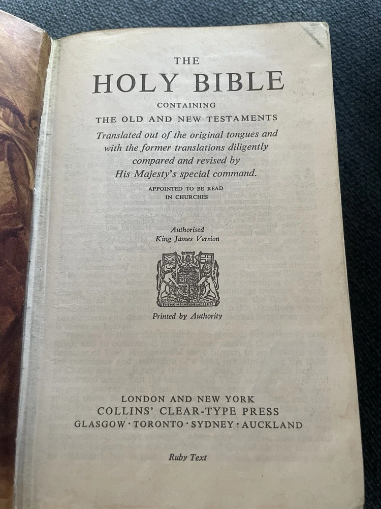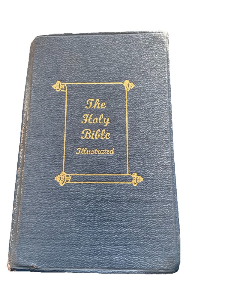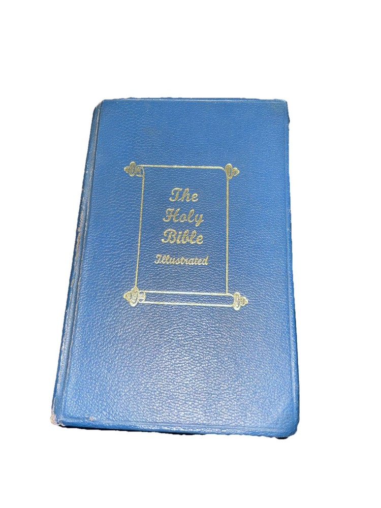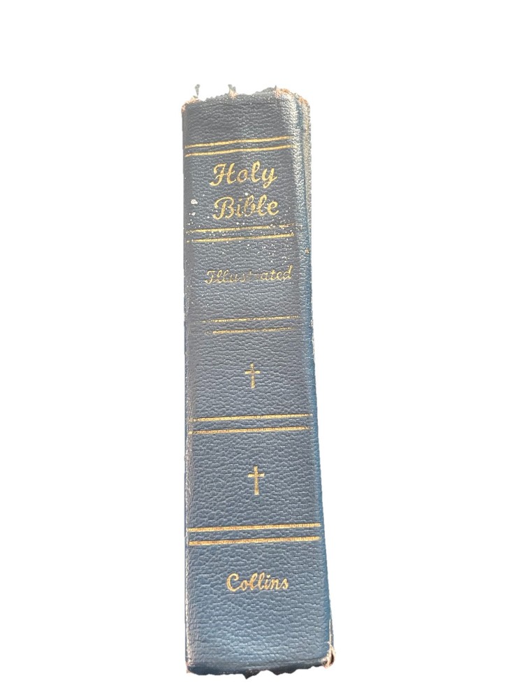Vintage ILLUSTRATED Holy Bible King James Edition in Blue Soft leather.. Published by Collins Clear-Type Press, this rare King James Edition features maps, family record pages, and an index. Collectible Bible for the spiritual readers seeking a piece of religious history from the 1950s-1960s Please not 2nd page does have the previous owner name written on the page. Loved Vintage condition, pages show glimpses of gold trim pages. Free tracked postage