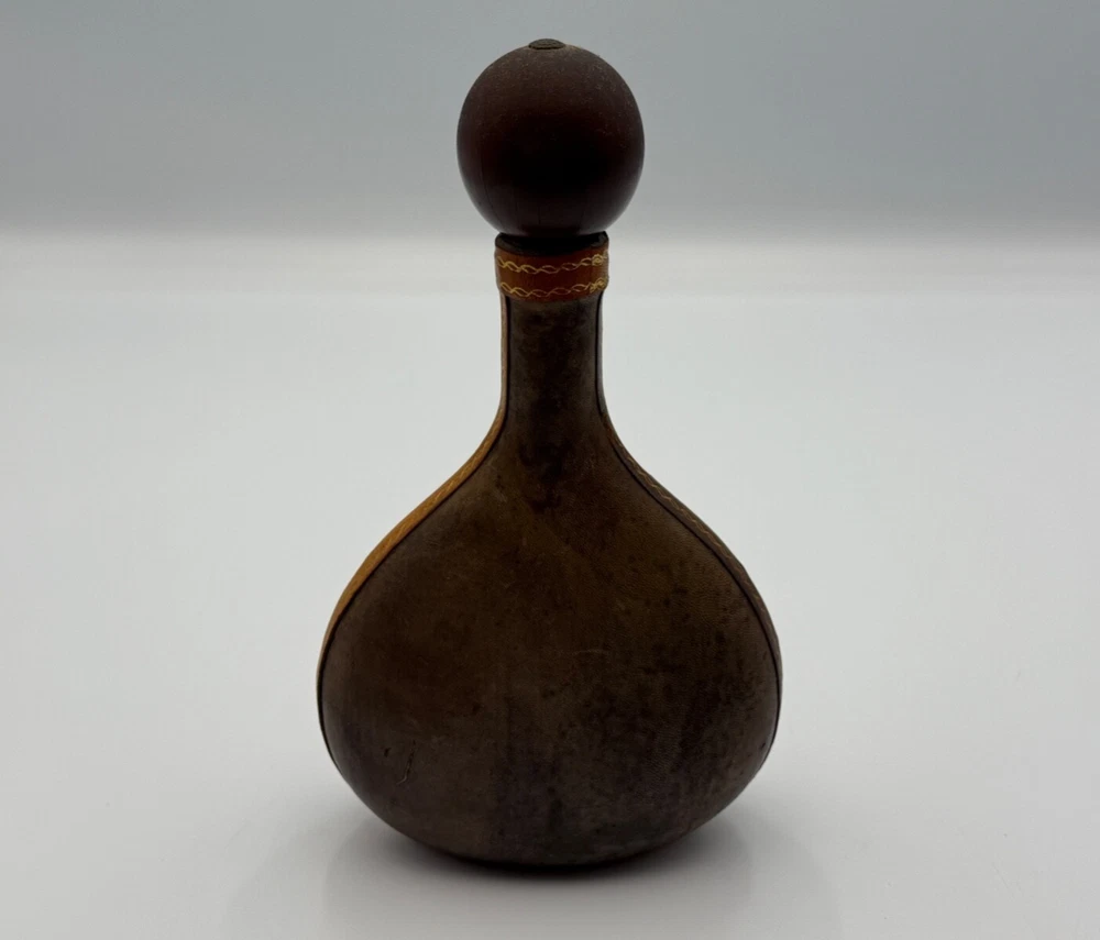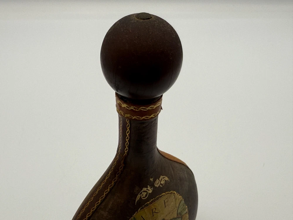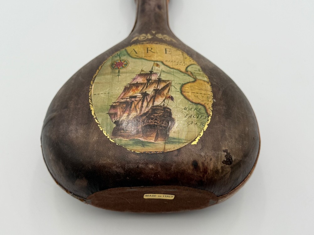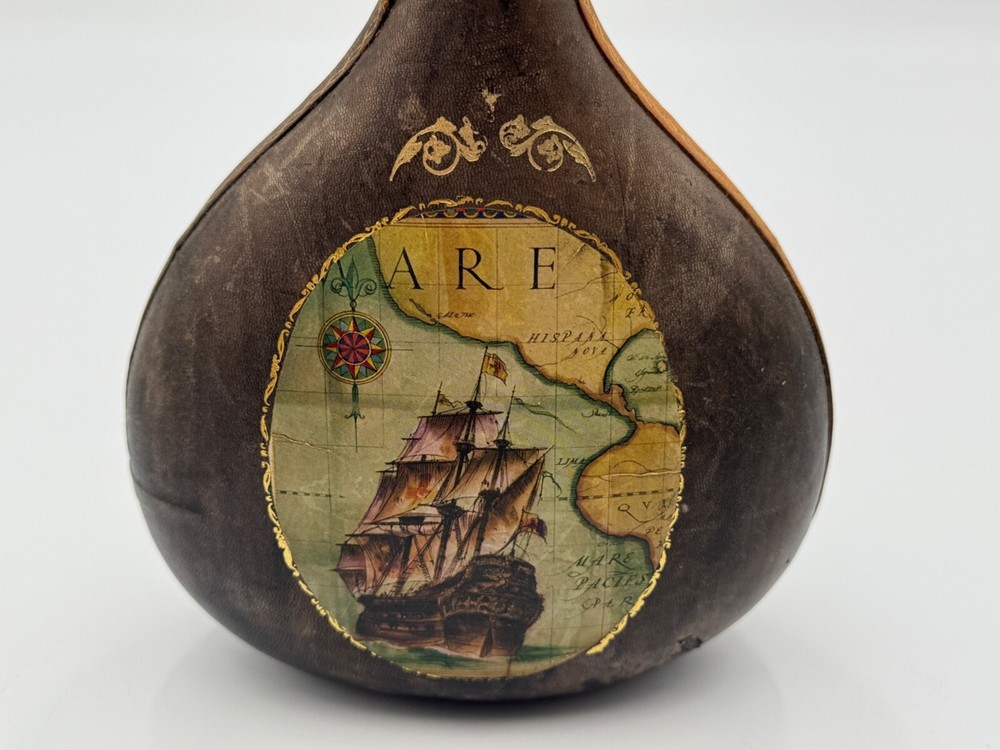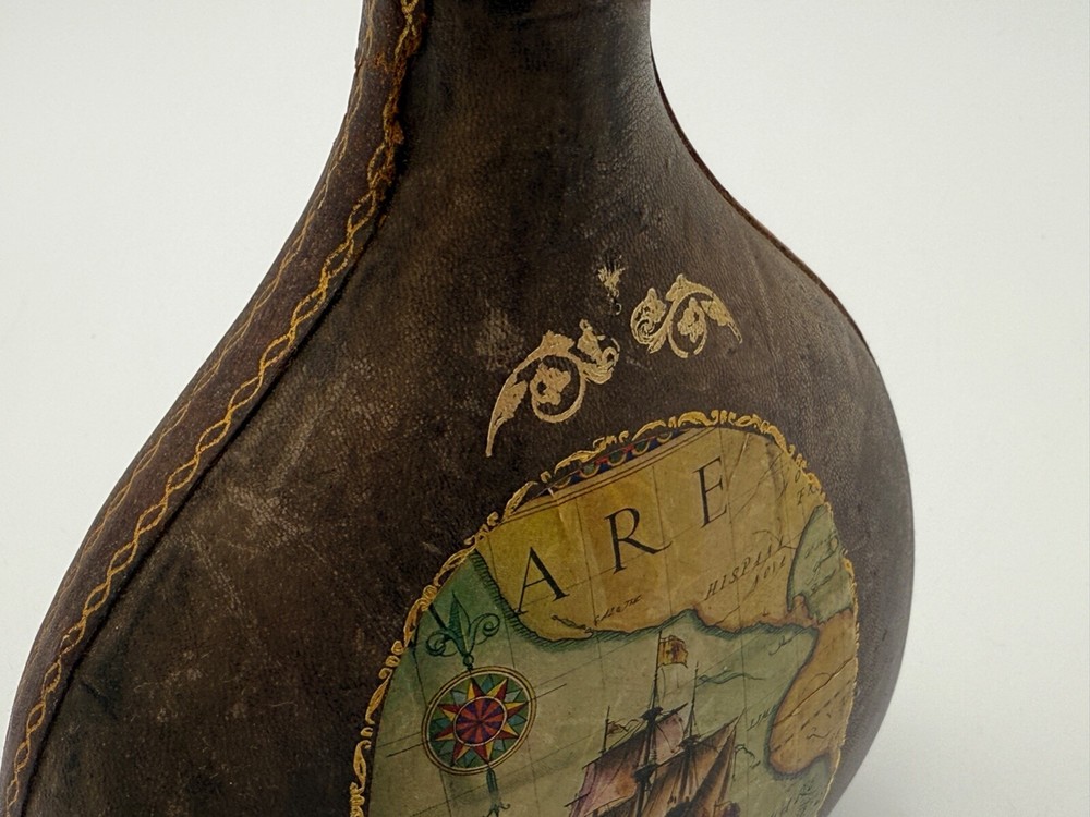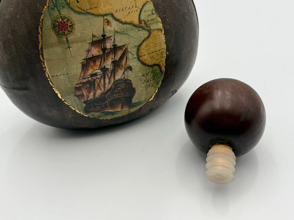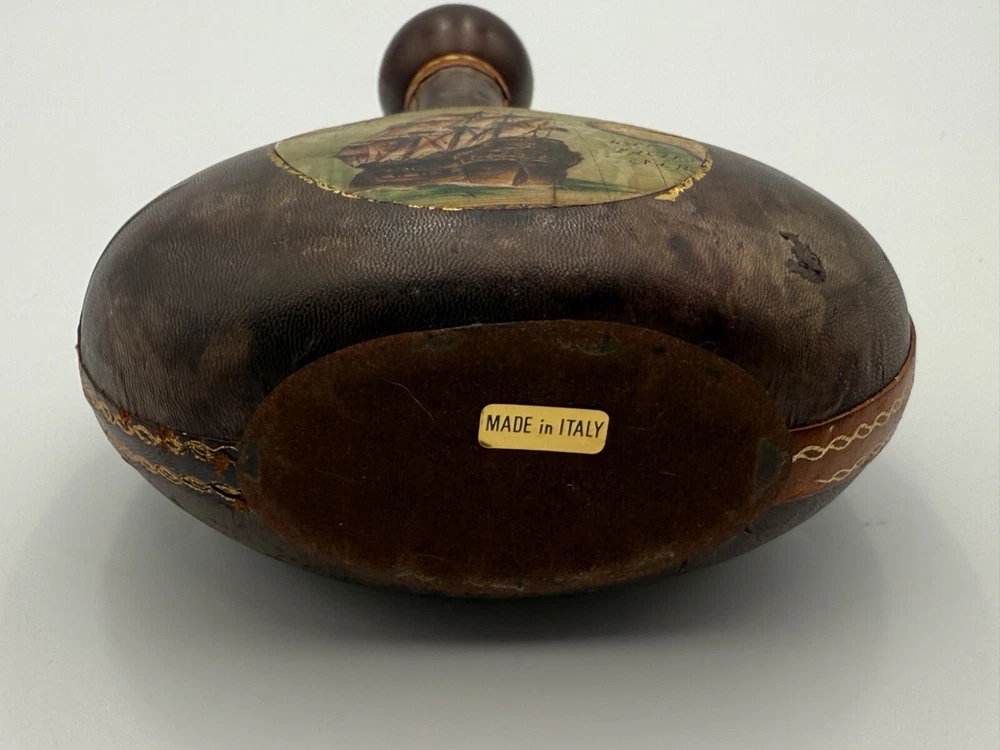 Vintage Italian Leather Bound Glass Decanter/Bottle w/Ship & Map Front Gold Edging Wood & Plastic Spiral Screw Top Made in Italy 60s/70s?? Measures 11”x 6 1/2” Very Good Condition, Old Book Scent Inside, Checkout Photos Please We Combine Shipping for Multiple Purchases Thanks for Looking💚