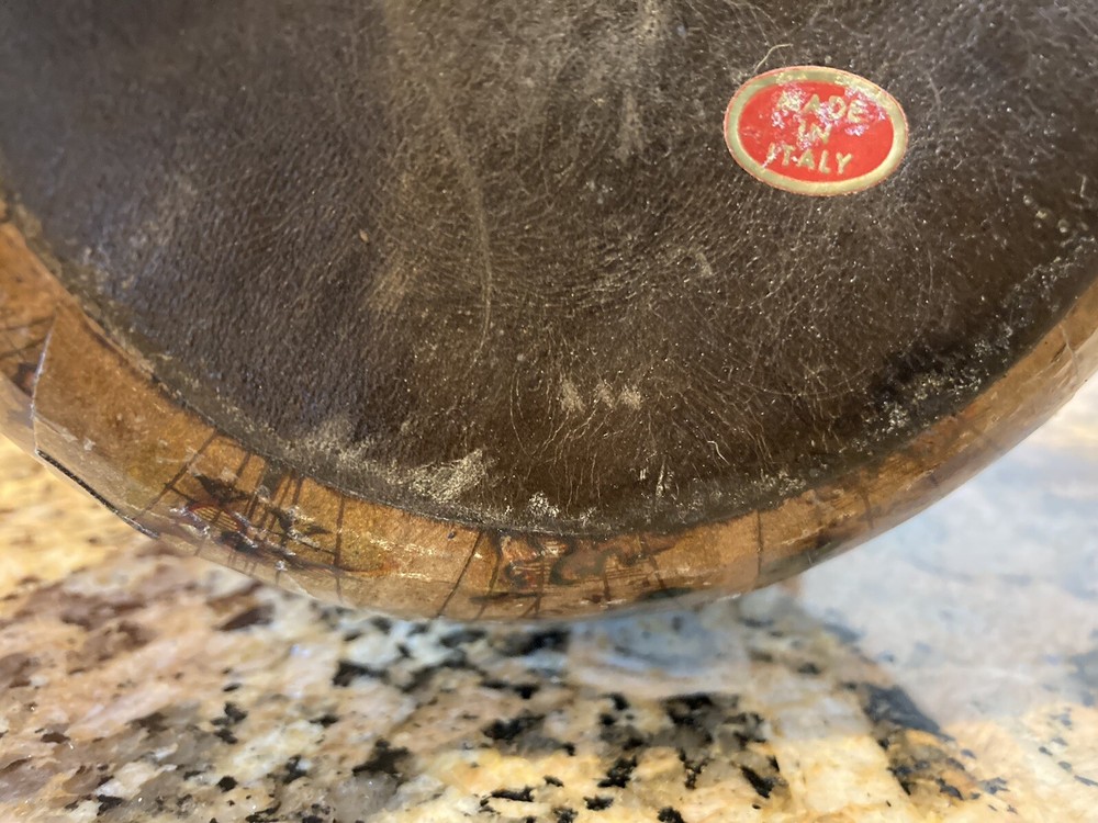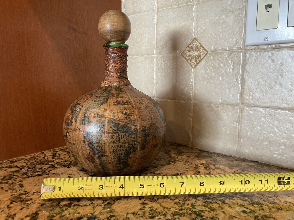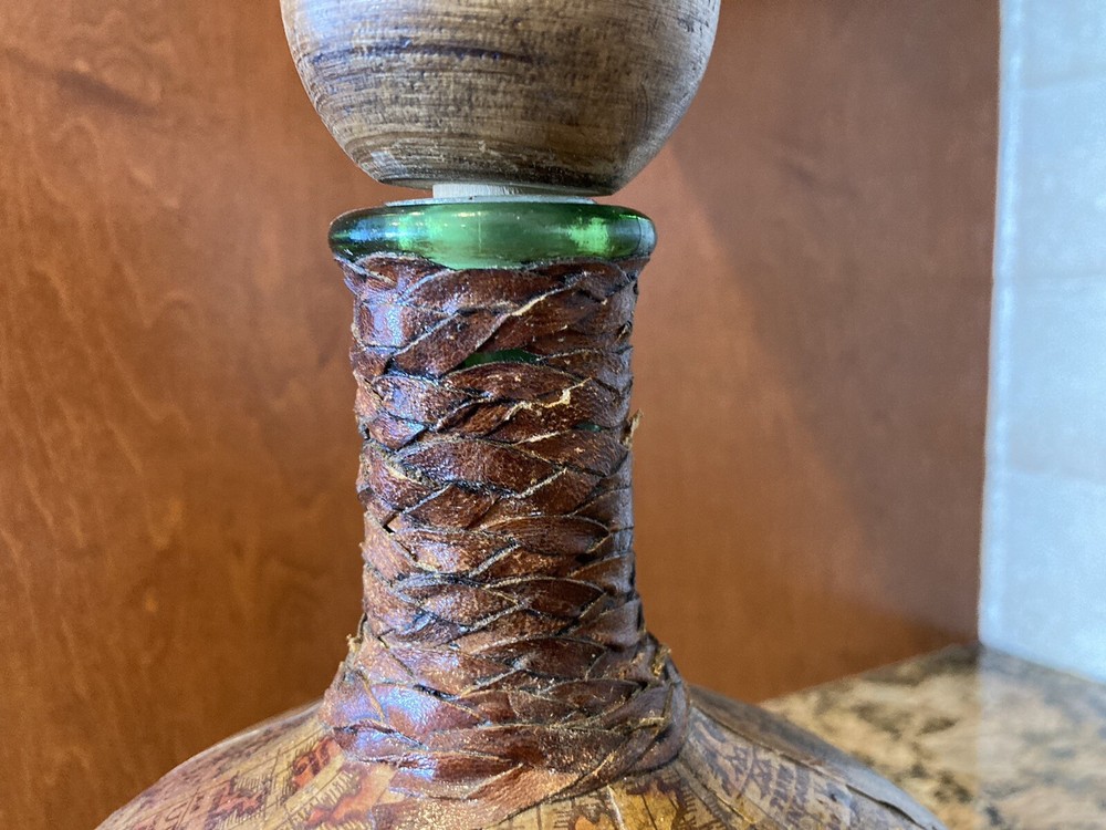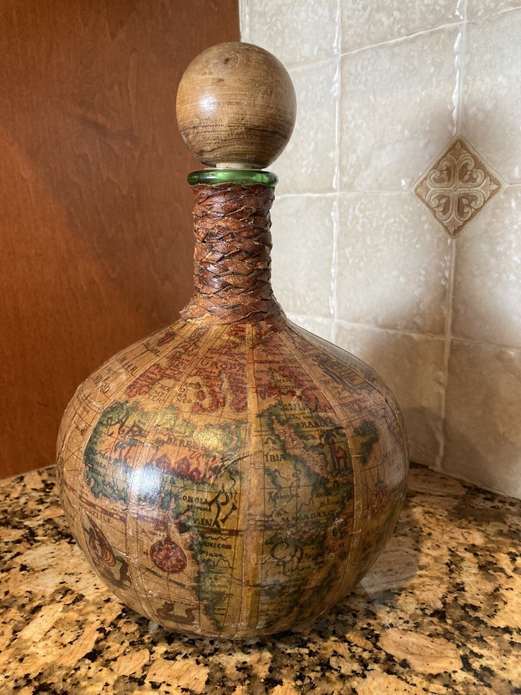 Add a touch of vintage charm to your bar with this stunning green glass decanter. Featuring a beautifully detailed world map design on a leather-bound exterior. Made in Italy, it comes complete with a lid/stopper. The combination of glass and leather materials make this decanter an elegant addition to any collection, and the unique world map pattern adds a sense of adventure to your barware.