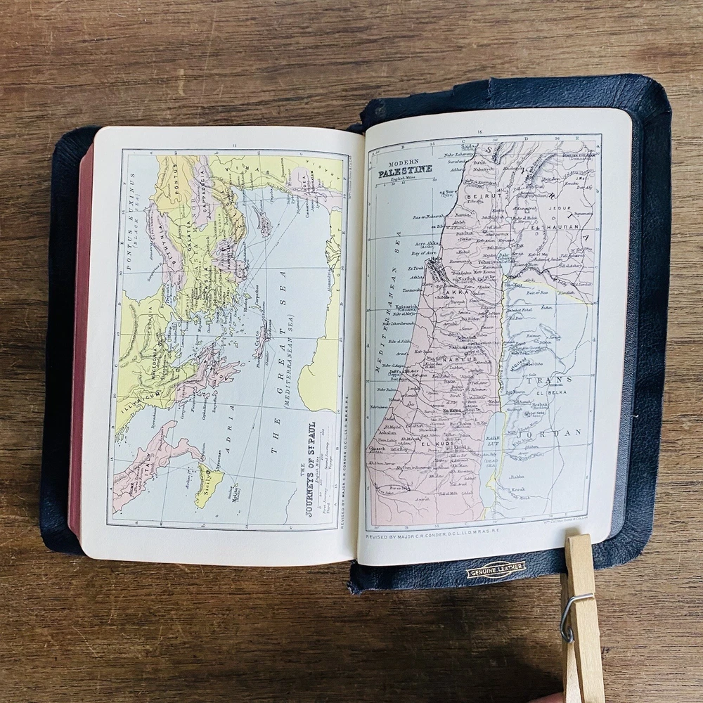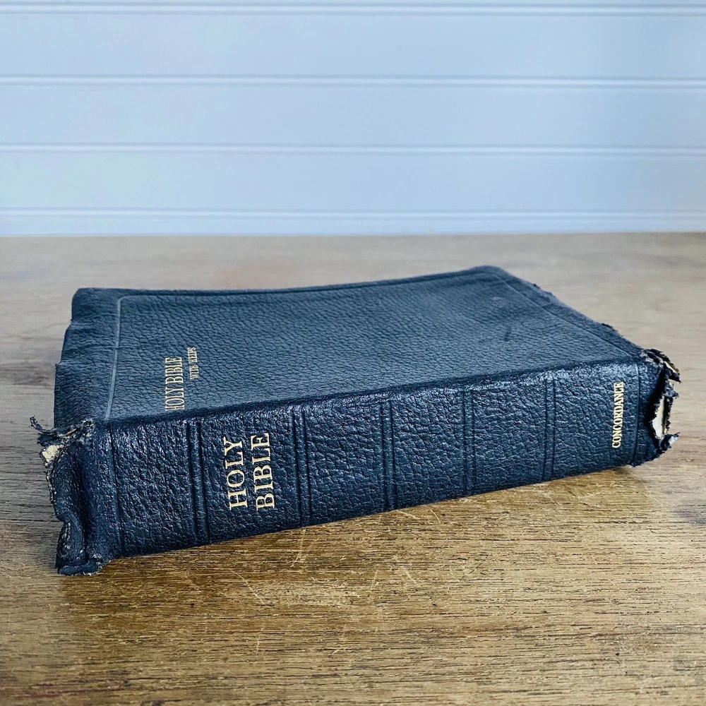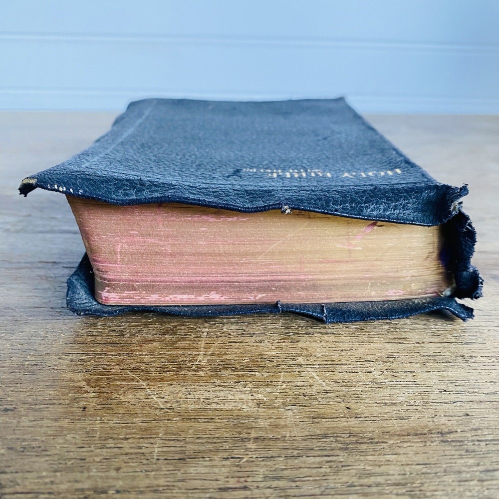 Vintage KJV Holy Bible With Helps Collins Press Leather Maps Photo Illustrated. Condition: Acceptable. Leather is very worn with torn edges. Gilted edges. Binding tight and intact. Free of handwriting or highlighting. Beautiful color photos by Photochrom Co., Ltd. Many maps in the back end including Ancient World Map, ancient Jerusalem, modern jerusalem, Palestine in the time of christ, etc. Maos are revised by Major CR Condor and produced by Wm Collins Sons & Co. Photos are part of the description. Please view all photos for complete detail and condition.