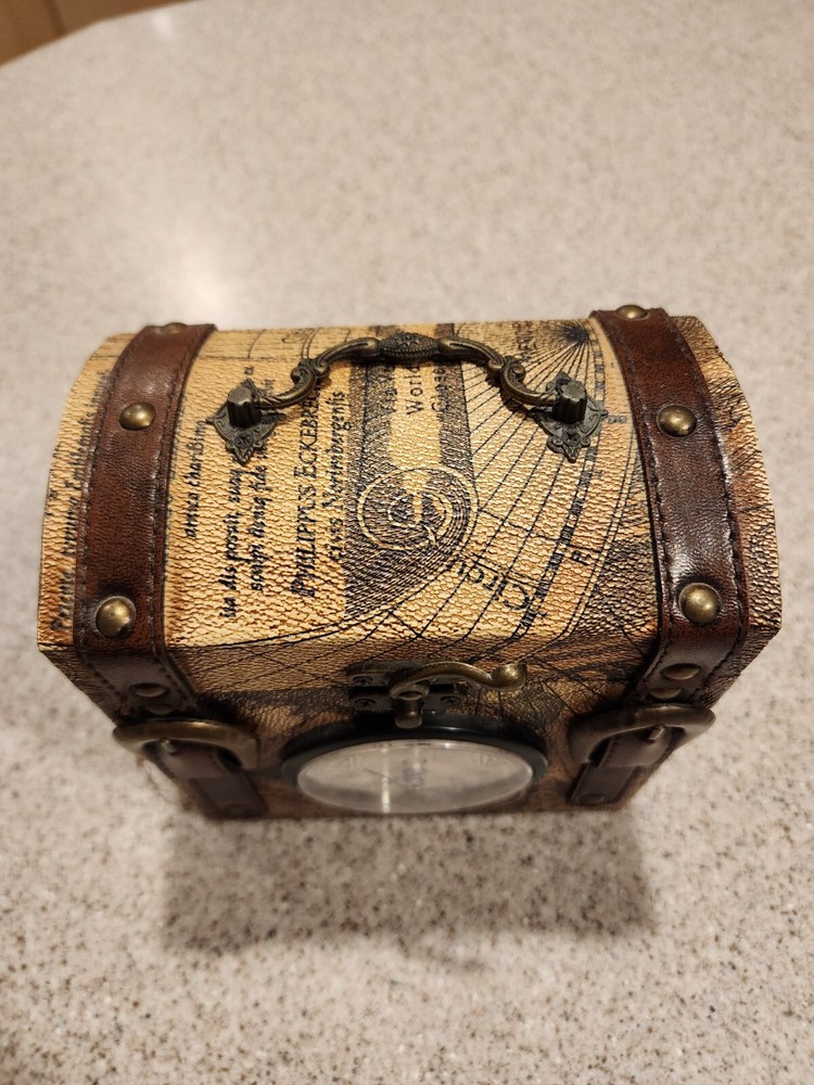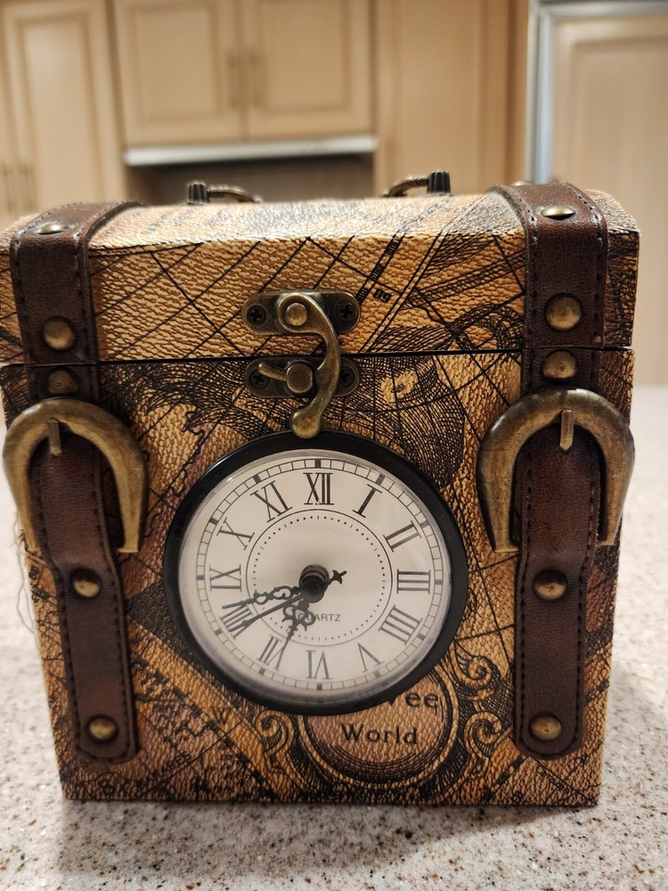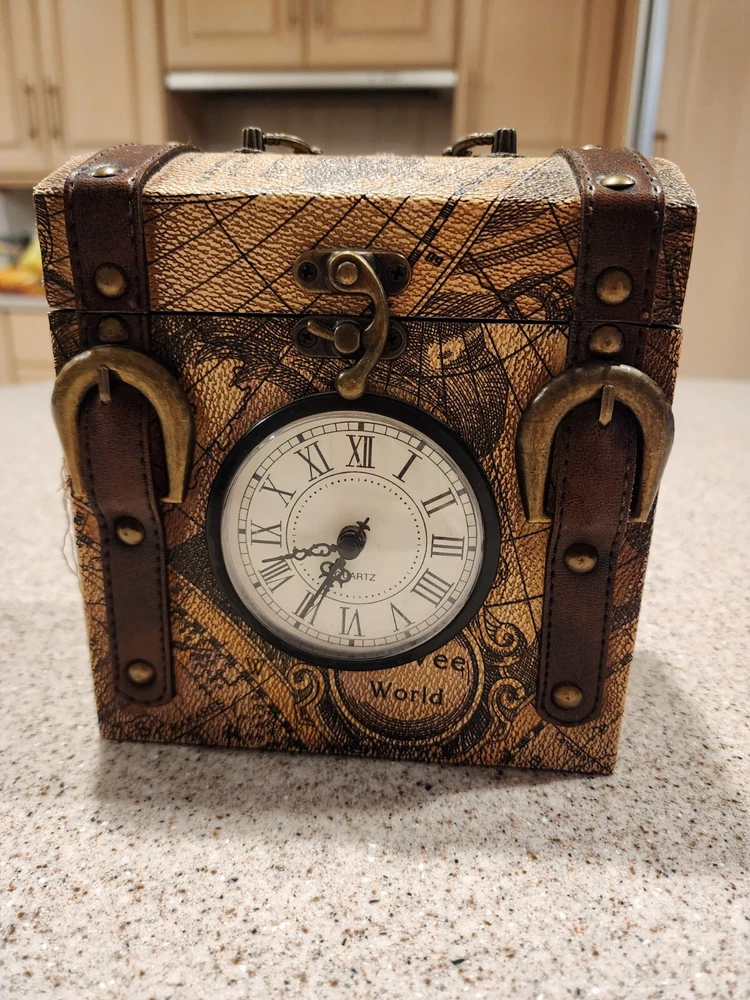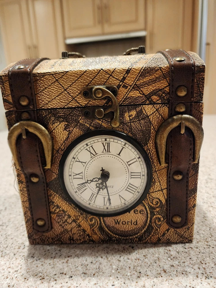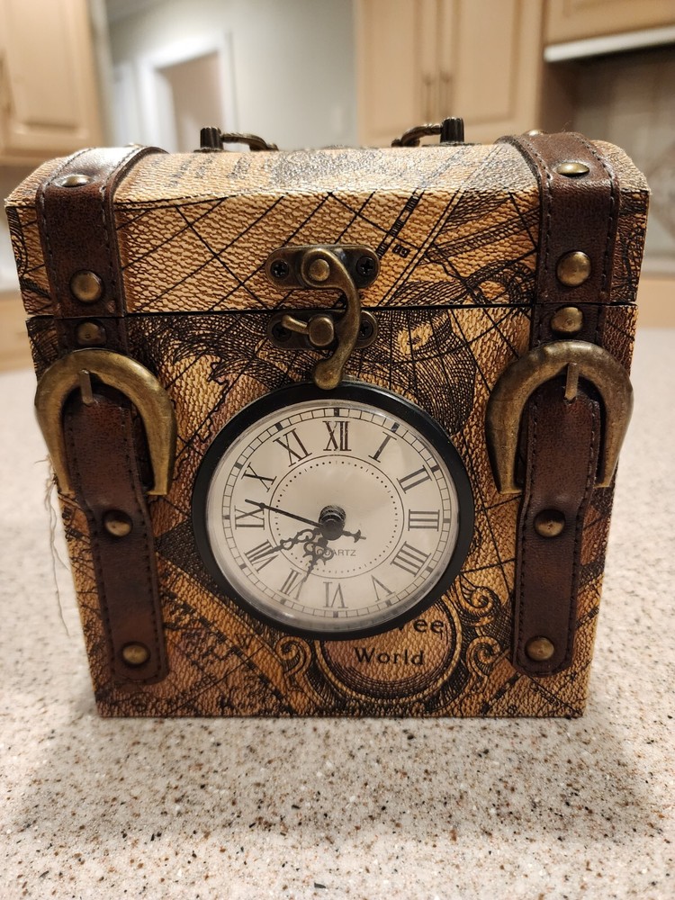 Excellent condition. Beautiful design. Leather bounded with brass buckles and a fully working clock. Perfect for your home decor, home office or storage.