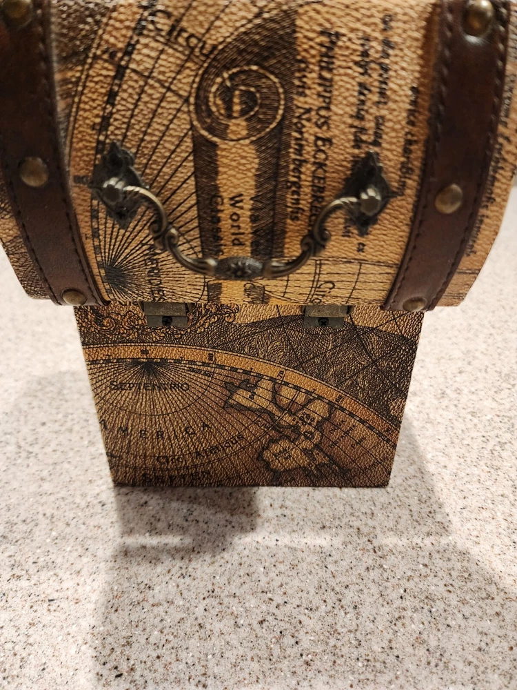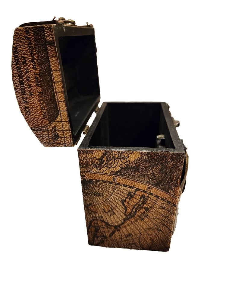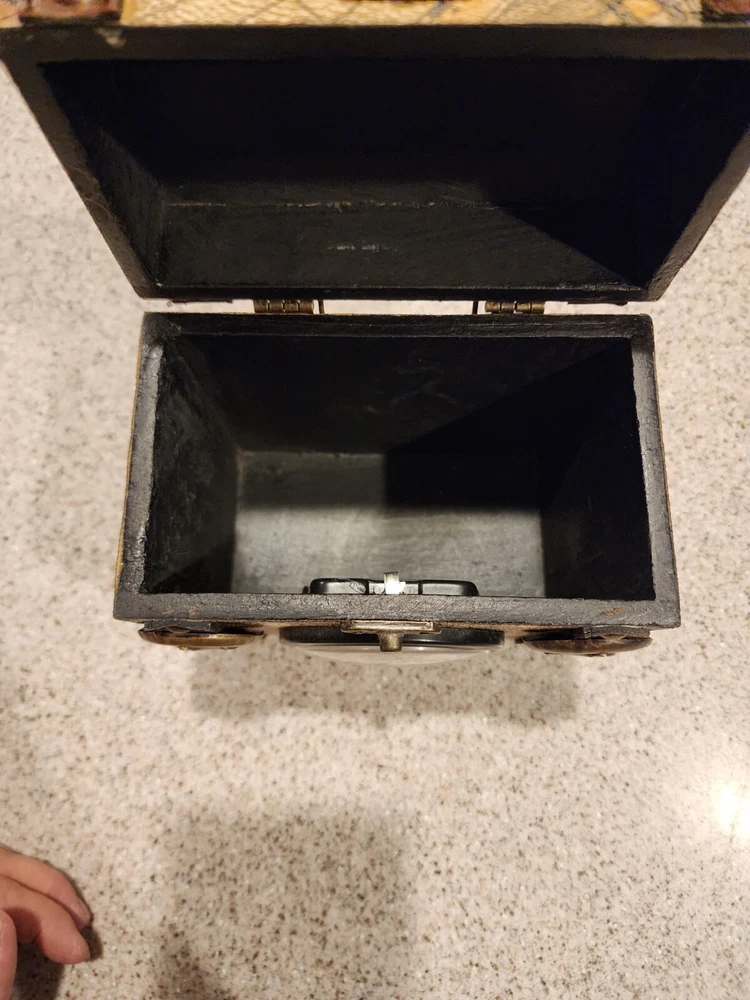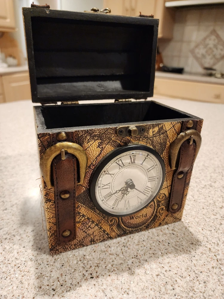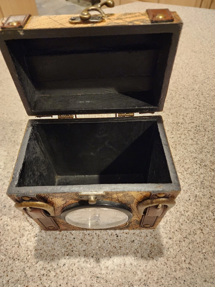 Excellent condition. Beautiful design. Leather bounded with brass buckles and a fully working clock. Perfect for your home decor, home office or storage.