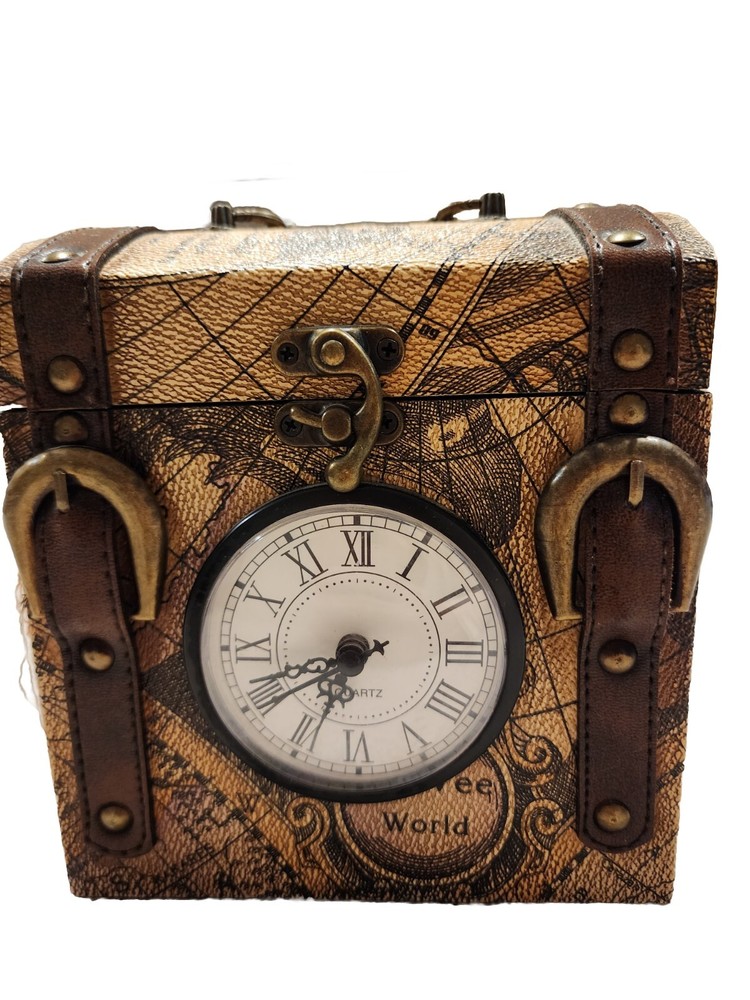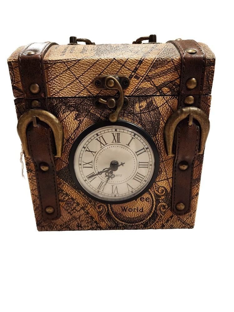 Excellent condition. Beautiful design. Leather bounded with brass buckles and a fully working clock. Perfect for your home decor, home office or storage....