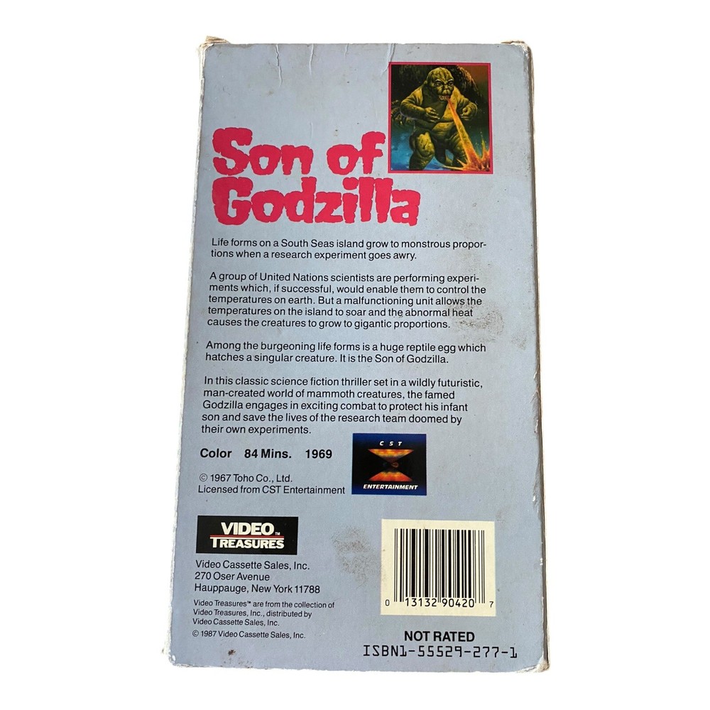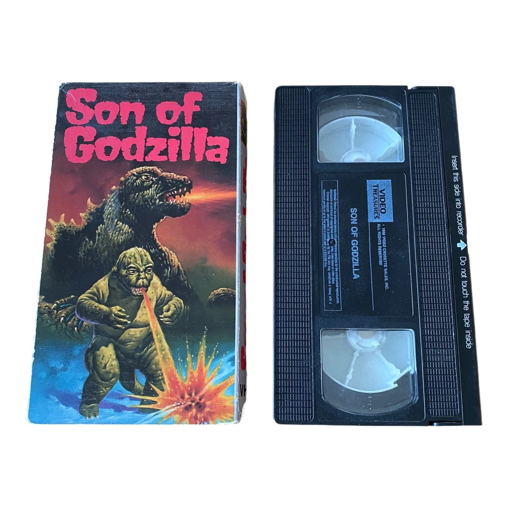 Title: Vintage Son of Godzilla 1967 Video Treasures VHS (1987) Rare Toho Co. LTD Description: Own a piece of kaiju film history with this rare Vintage Son of Godzilla (1967) VHS, released by Video Treasures in 1987. This collectible tape features the beloved Toho Co., LTD classic, where Godzilla defends his young son, Minilla, from monstrous threats on a tropical island. With its retro 80s VHS packaging, this rare find is a must-have for Godzilla enthusiasts and vintage VHS collectors. Relive the unforgettable monster battles and special effects from this iconic Toho film. The tape is in good condition, making it perfect for any fan of classic kaiju films. Features: • 1987 Video Treasures VHS of the 1967 Toho classic, Son of Godzilla • Rare collectible edition • Iconic monster action from the Godzilla series • Good condition Perfect for fans of vintage Godzilla movies and VHS collectors looking for a rare piece of Toho kaiju cinema!