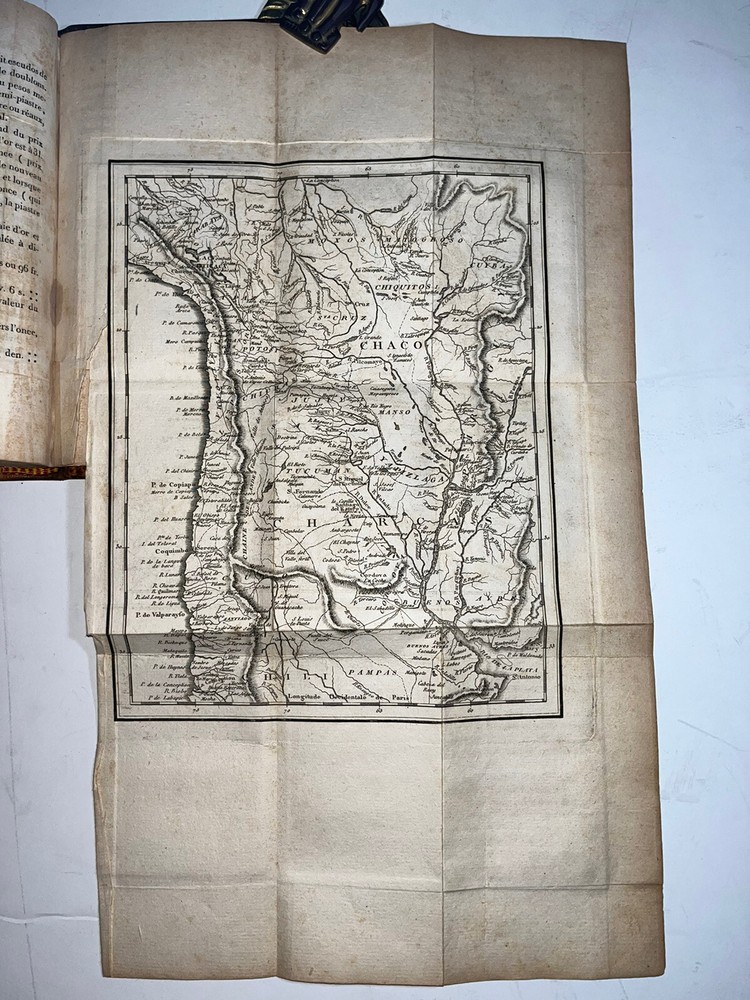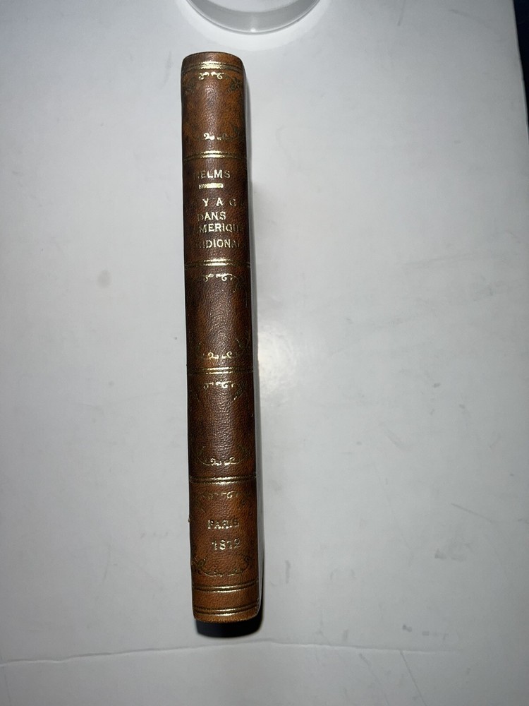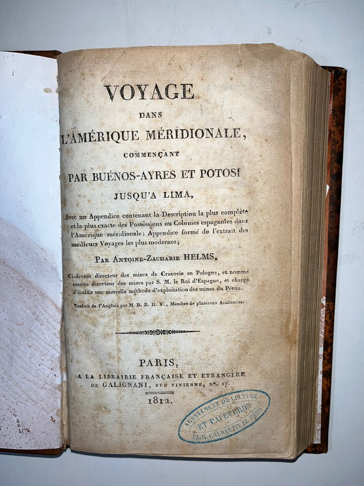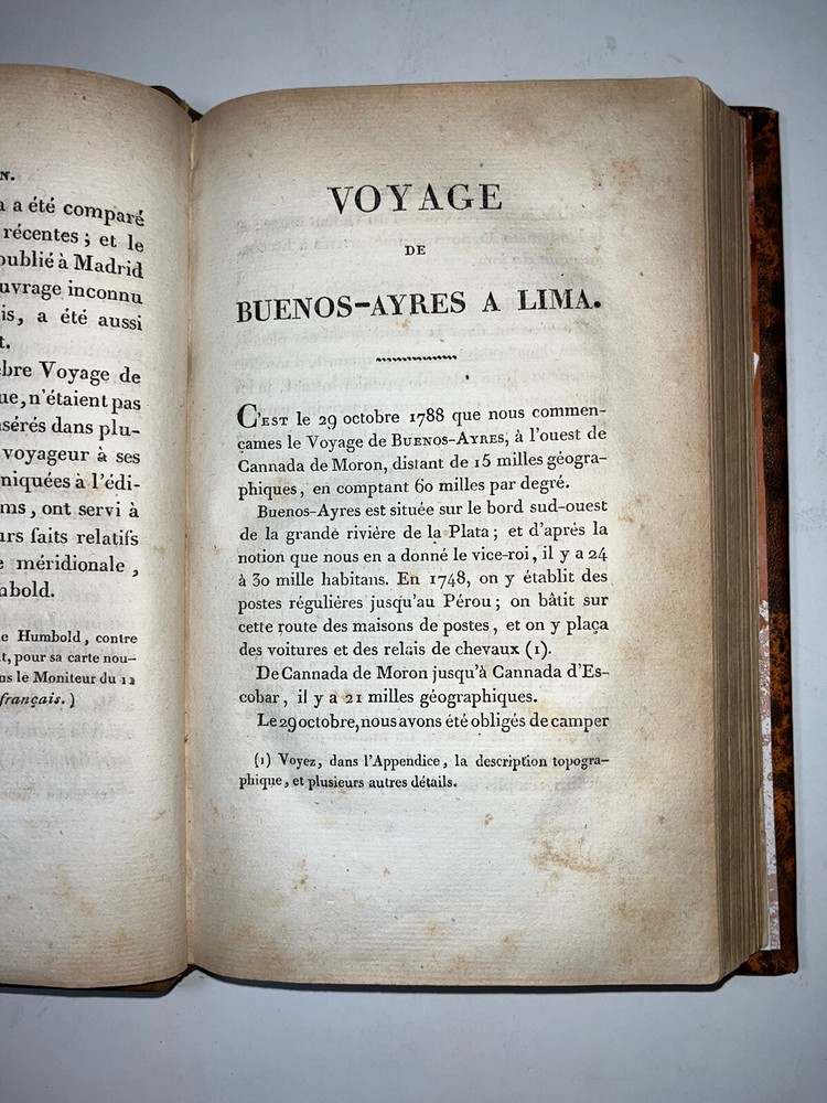Voyage dans l'Amérique méridionale, commençant par Buénos-Ayres et Potosi jusqu'à Lima. Avec un Appendice contenant la Description la plus complète et la plus exacte des Possessions ou Colonies espagnoles dans l'Amérique méridionale. Paris, Galignani, 1812, (4),II,2,(2),X,257p., 2 fold. engr. maps. Bound in recent leather, golden devices on spine. Overall in good condition, text oxidized, old owners stamp on title page. The first French edition. Sabin 31266; Henze II, p.564. Provides much information on the geology, agriculture and natural history of Chile and the Pampas.