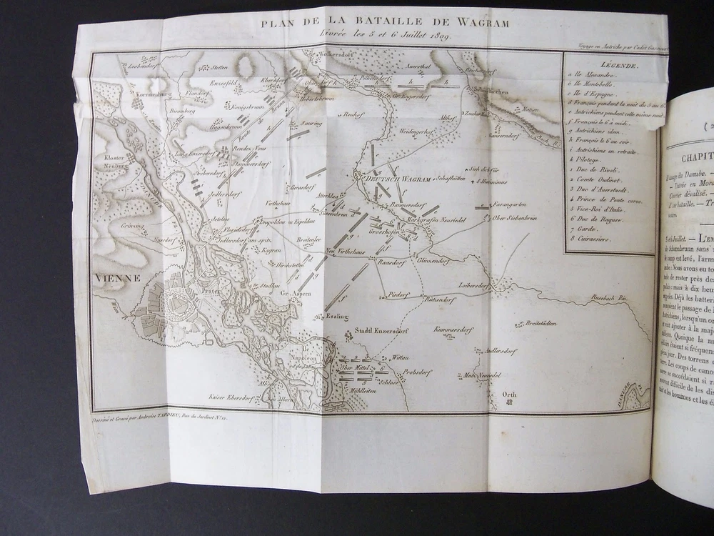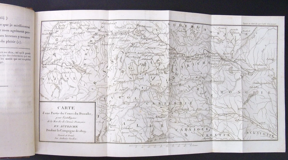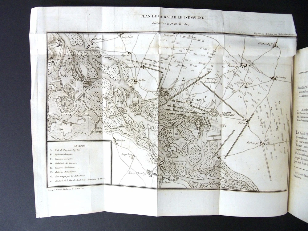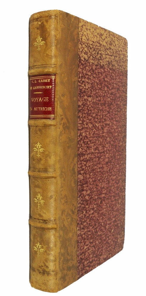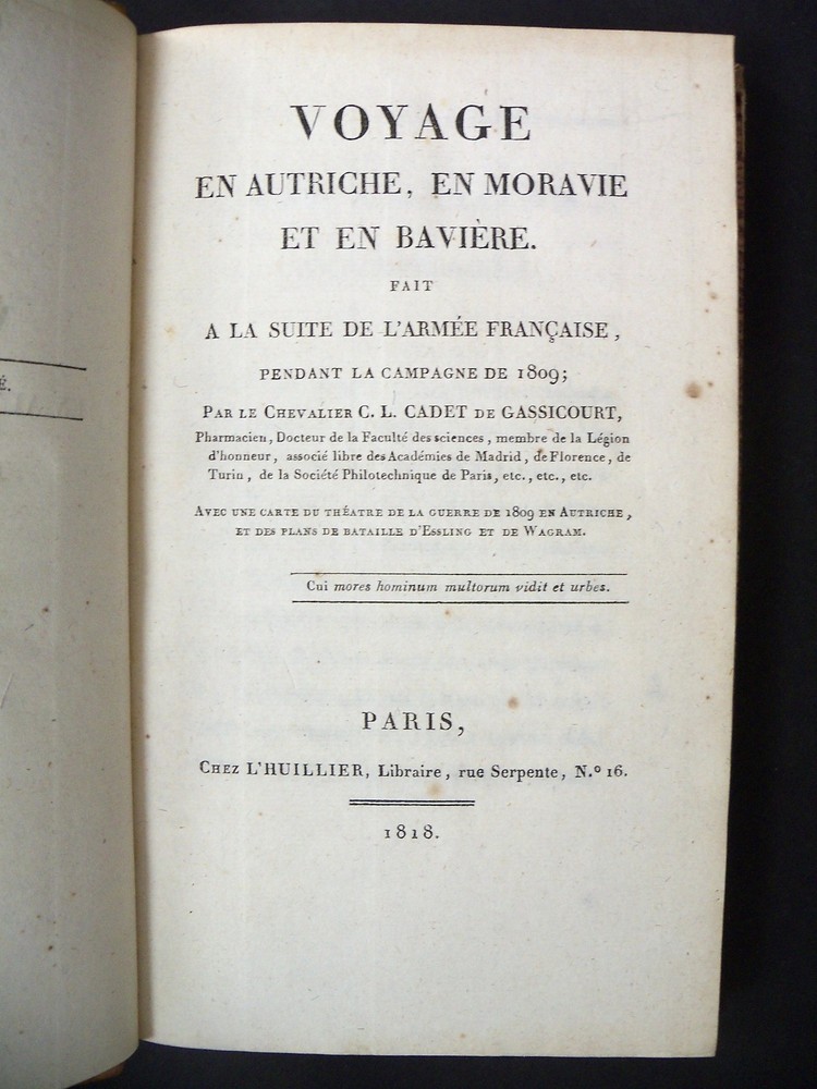 Voyage en Autriche, en Moravie et en Bavière Fait a la suite de l'armée Francaise, pendant la Campagne de 1809 Par: Charles Louis Cadet de Gassicourt Publié: 1818 Éditeur: Chez L'Huillier, Paris 3 Cartes Pliantes: 1) Carte du théatre de la guerre de 1809 en Autriche, 2) et des plans de bataille d' Essling et 3) de Wagram English Translation Voyage to Austria, Moravia, & Bavaria Done in the Wake of the French Army During the 1809 Campaign By: Charles Louis Cadet de Gassicourt Published: 1818 Publisher: Chez L'Huillier, Paris 3 Folding Maps: 1) Map of the theater of the war of 1809 in Austria; 2) Battle Plans of Essling and 3) Battle Plans of Wagram Additional Information : Note : this copy includes a stamp on the second end paper that identifies it as having been in possession the Library of the Count of Fontenoy. The war mentioned in the subtitle of this book is also known as the Dalmatian Campaign. S9F - E