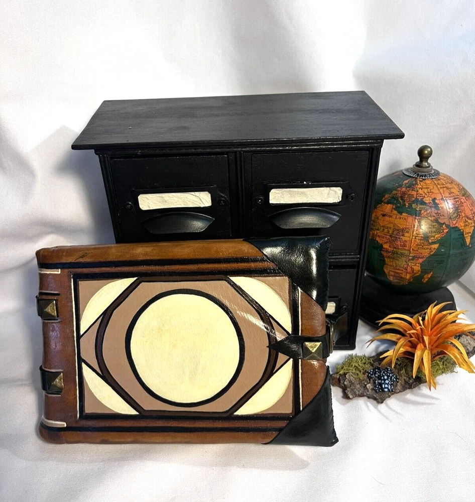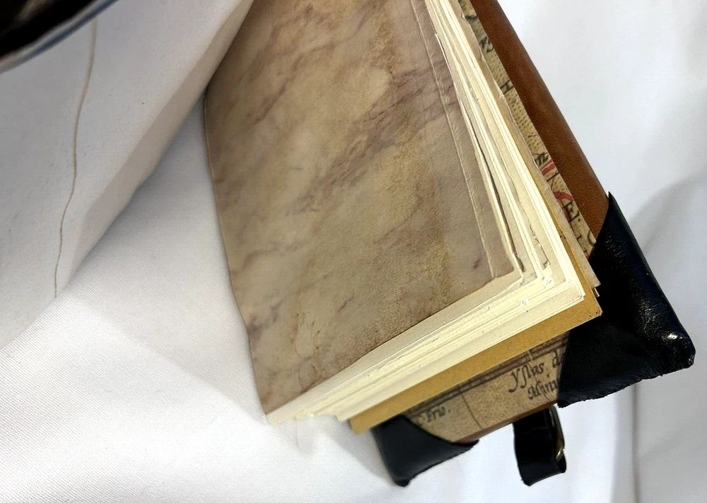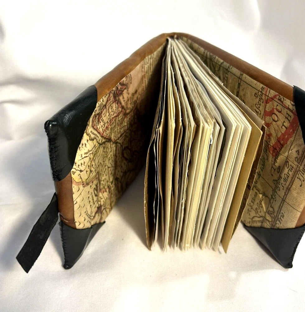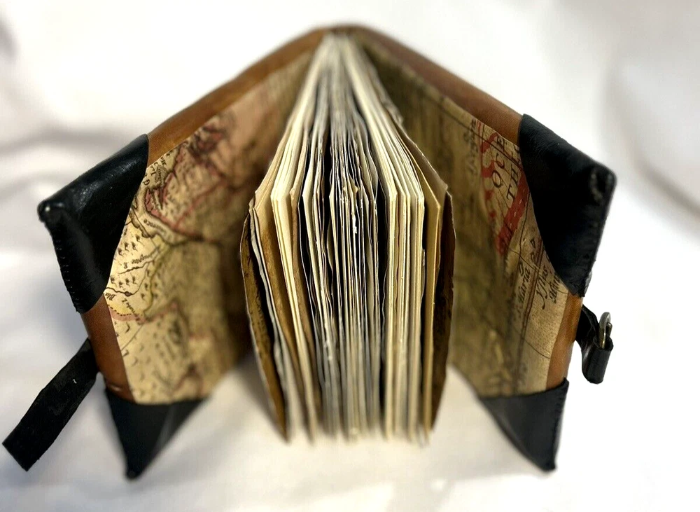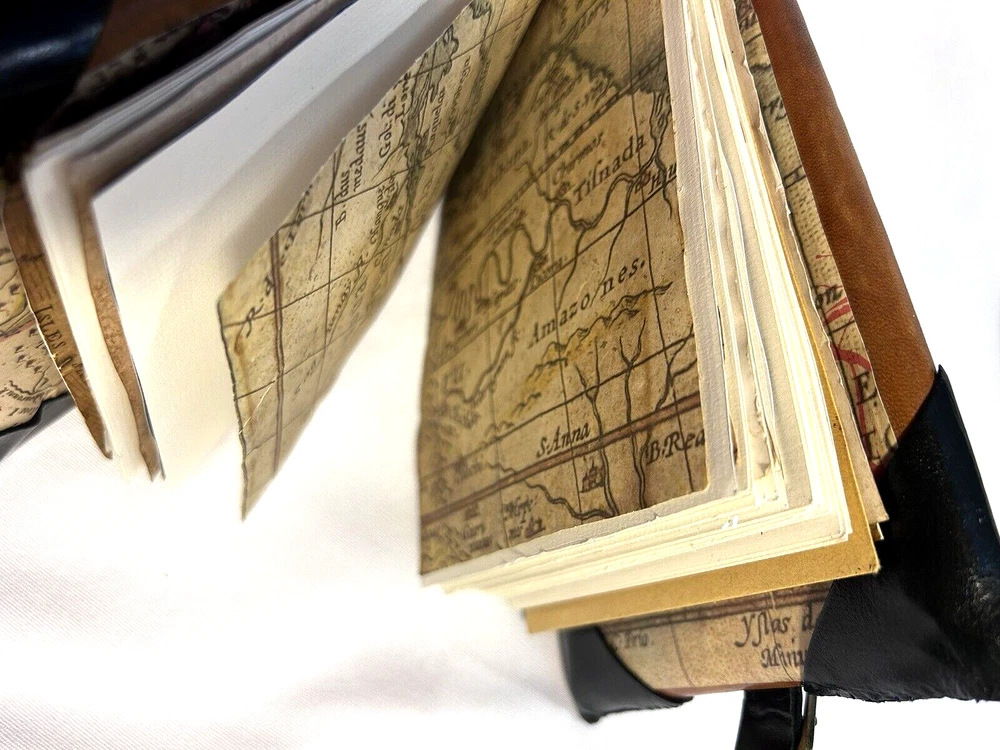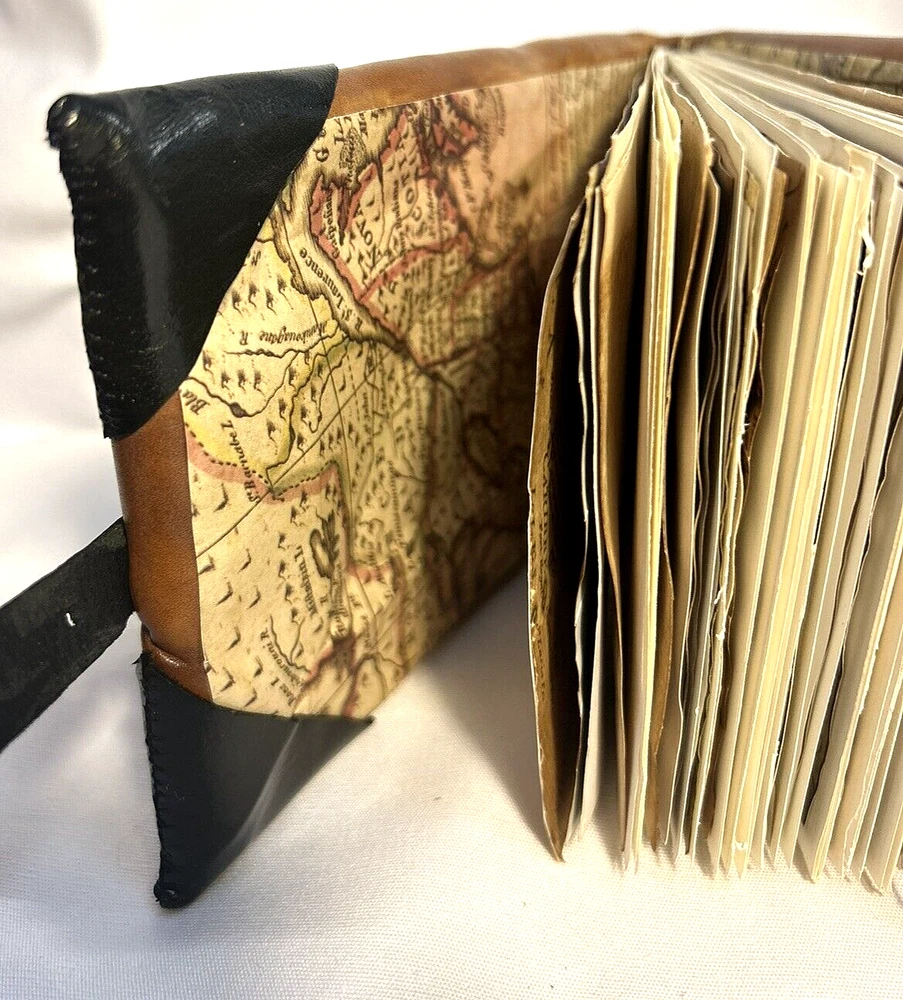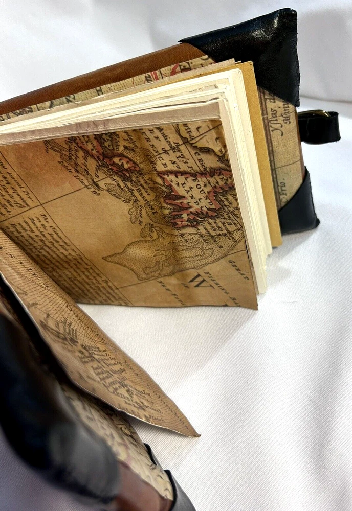 World Map Traveler's Leather Journal/Notebook 134 pages Various blank, lined, and map themed pages, including a secret envelope for covert notes! All pages are aged for an authentic vintage feel and aesthetic Handmade Leather Hardcover and Handsewn Binding 7" Tall x 8" Wide Genuine Leather with vegetable dye Leather strap and buckle closure The World Map Traveler's Leather Journal feels like an undiscovered treasure left over from the likes of Indiana Jones' adventures! The aged pages maintain the durability of "new" while lending the enchanting aesthetic of an "ancient" historical text. With 134 blank and cartography themed pages, this journal is ready to inspire the academic observations and awe-inspiring anecdotes of a life worth living! #SSLB0004 This item is certified One Of A Kind Safar Studios Safar Studios' products are handcrafted in the United States by Natasha Safar with the utmost care and attention to detail. She has been making art and expanding her sales in shops throughout the East Coast , and Mokarran is pleased to be able to offer works from her collection exclusively online. Custom art pieces available upon request CUSTOM ART COMMISSIONS: If you wish to commission a custom piece of art, please contact us with your requests. We will work with you to get all the details right and have Ms. Safar provide you with any designs for approval. We will provide you with details pertaining to cost, time-frames, etc. for your approval. Upon completion of your custom piece(s), we will contact you to work out a convenient time for us to post the item(s) on eBay for the agreed upon cost (a fixed price listing). WE WILL ONLY SELL THROUGH EBAY AT THIS TIME. We apologize for any inconvenience this may present, but that way the sale is covered under both Buyer and Seller Protections. PAYMENT : Payment is requested and expected within three (3) days of the close of the auction/listing (post purchase-date), unless you have contacted us and other arrangements have been made. We ship most items within one (1) day of receiving cleared payment. RETURNS : If you are not 100% satisfied with your purchase, please contact us within 30 days of receiving your item(s). Upon receiving your return, we will issue a full refund of the purchase price (original price + original shipping). In most cases, you, the buyer will be responsible for any return shipping costs. INTERNATIONAL SHIPPING: We ship internationally, but please check the shipping price and service offered prior to bidding or purchasing. We use calculated shipping based upon your location and the weight of the package, which is provided by eBay’s Shipping Calculator. The shipping price you see in the listing is eBay’s calculation for the cost of shipping directly to you; that price does not include any taxes, tariffs, or customs charges that may be incurred at your end. We have no way of calculating taxes, tariffs, or customs duties; they are your responsibility to pay in addition to shipping charges. For more information or details please contact your local post office. Please contact us with any other questions regarding shipping internationally. COMBINED SHIPPING: Whenever possible we combine shipping to save you money. To ensure you get accurate combined shipping, you can request a combined invoice. Please wait until we have sent you an invoice through eBay/PayPal before you pay for items that you wish to have shipped together to ensure accuracy of pricing. ADDITIONAL PICTURES POLICY: Please contact us if you would like to see more pictures of any of the items we have in stock. We strive to give you the best possible representation of the actual item available for purchase; however, we do use stock photos provided by suppliers for many of our items. If you would like more detailed pictures in general or pictures of specific details of an item, please let us know.