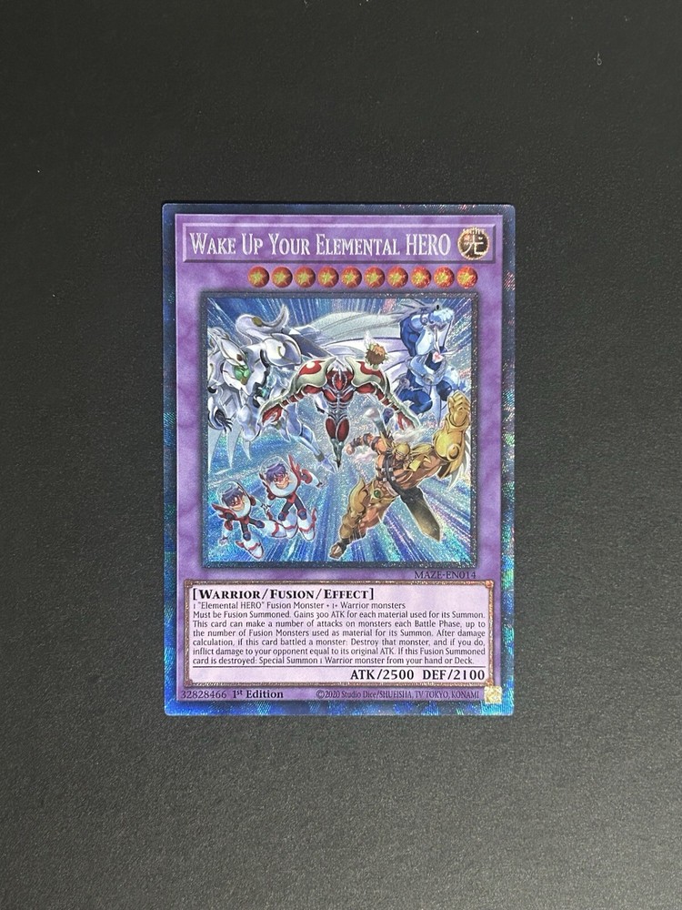 This is a rare and highly sought-after card from the Yu-Gi-Oh! TCG game. The Wake Up Your Elemental HERO card, with the card number MAZE-EN014, is a 1st Edition Collector's Rare card. It features a beautiful foil finish and is in Japanese card size. The card is in English language and manufactured by Konami. This card is perfect for any collector or player of the Yu-Gi-Oh! TCG game. It is an excellent addition to any collection and is sure to impress. Don't miss your chance to own this rare and unique card.