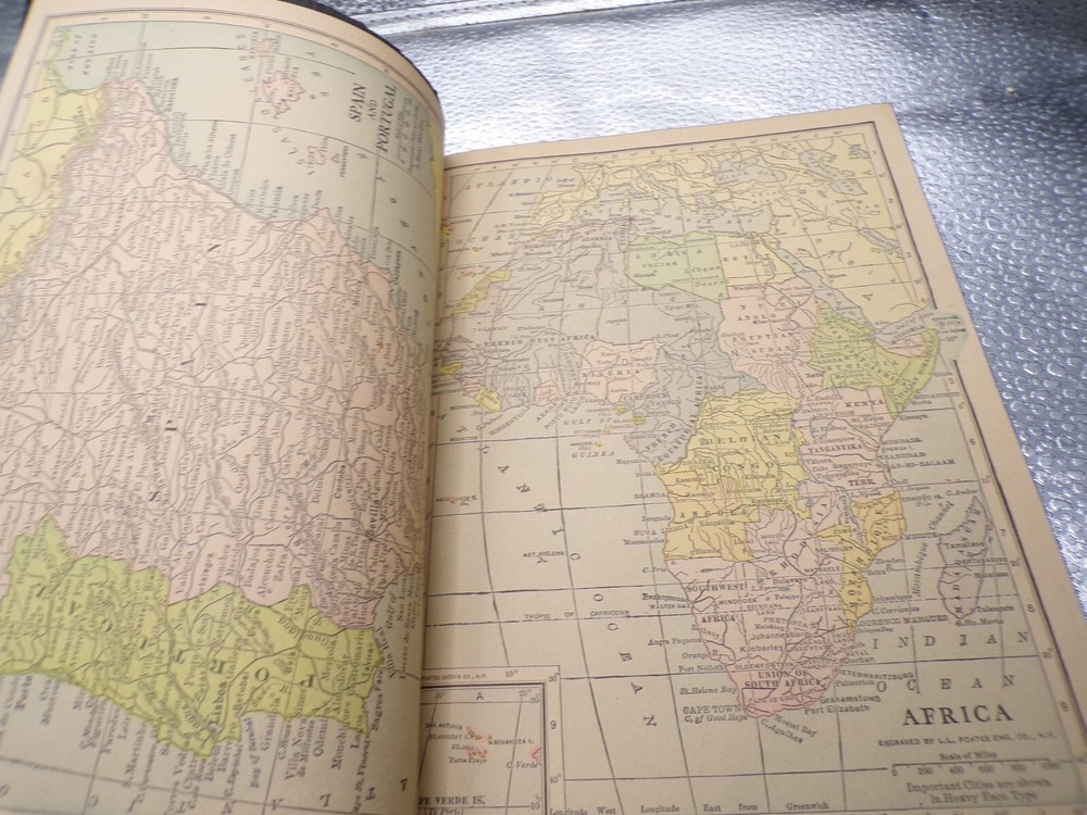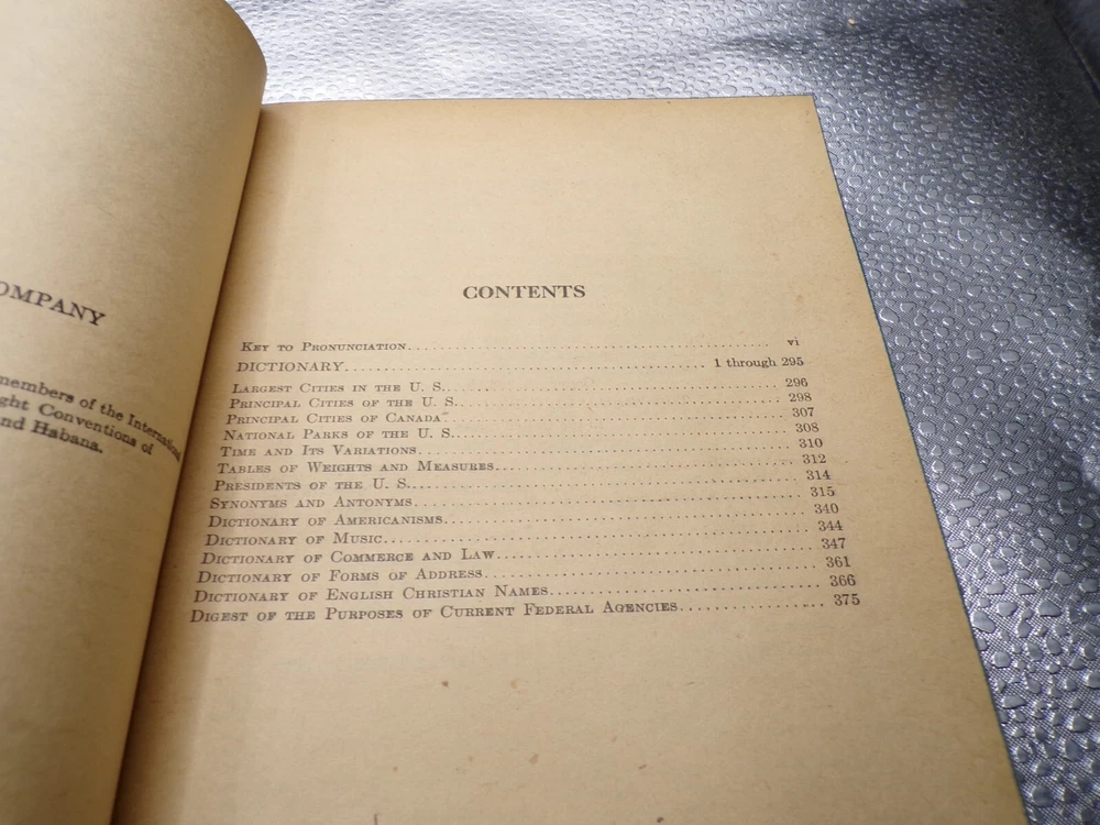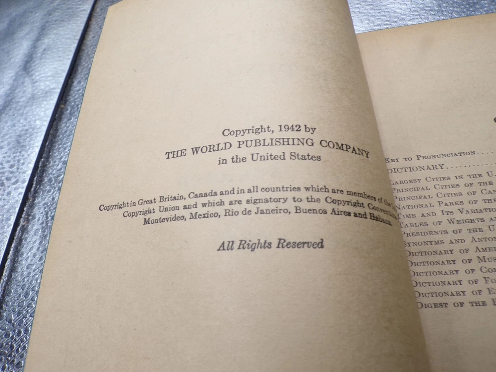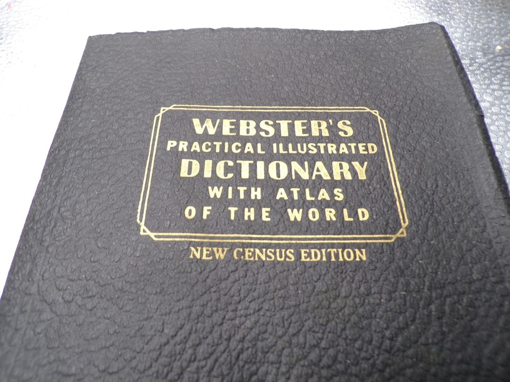 For sale is a vintage 1942 copy of "Webster's Practical Illustrated Dictionary". This is a leather bound softcover edition and includes New Census Military Facts and color Maps....