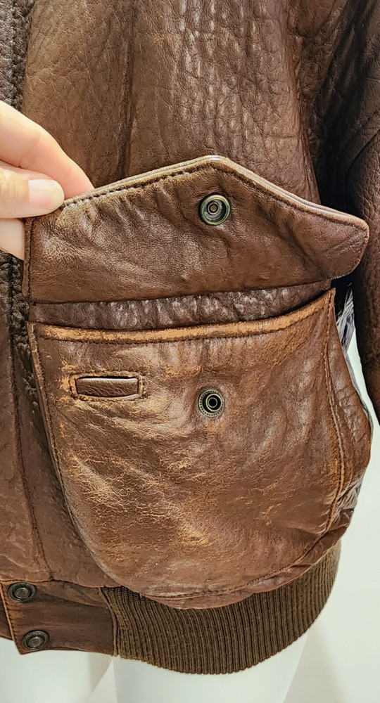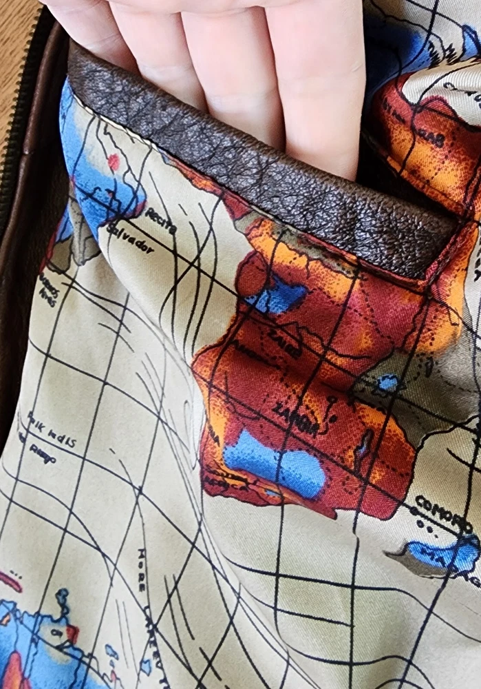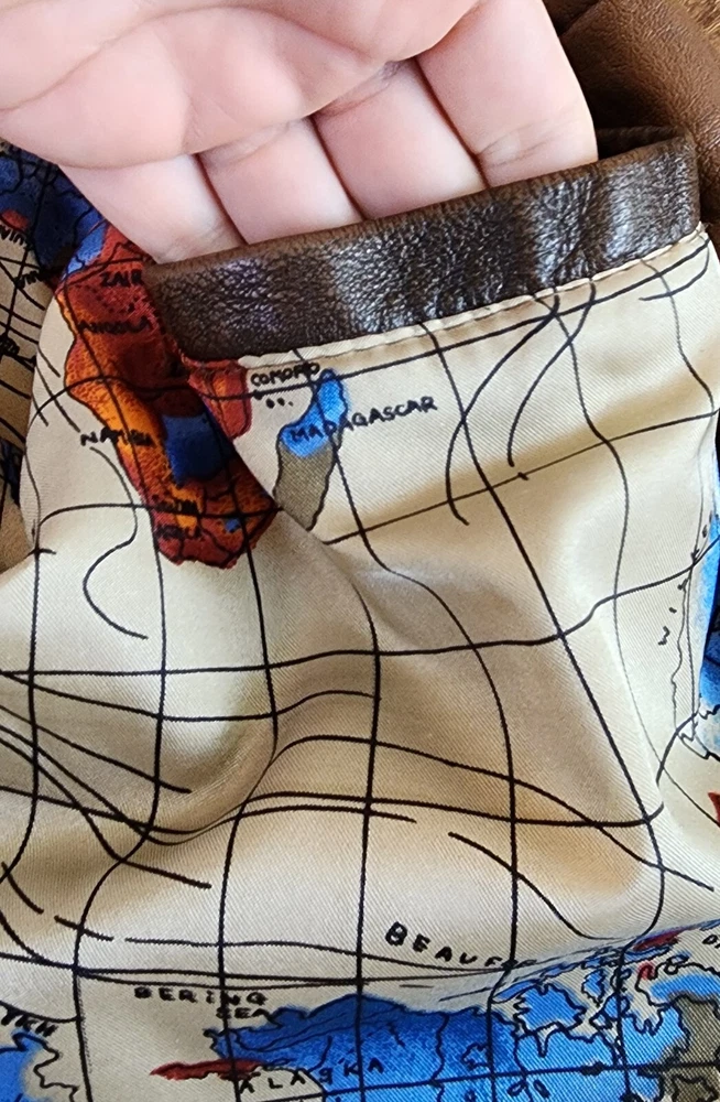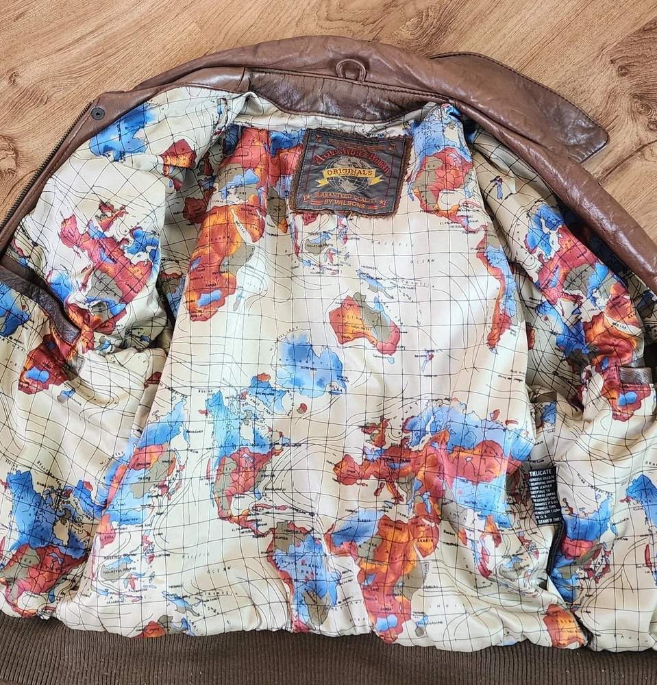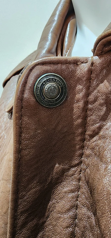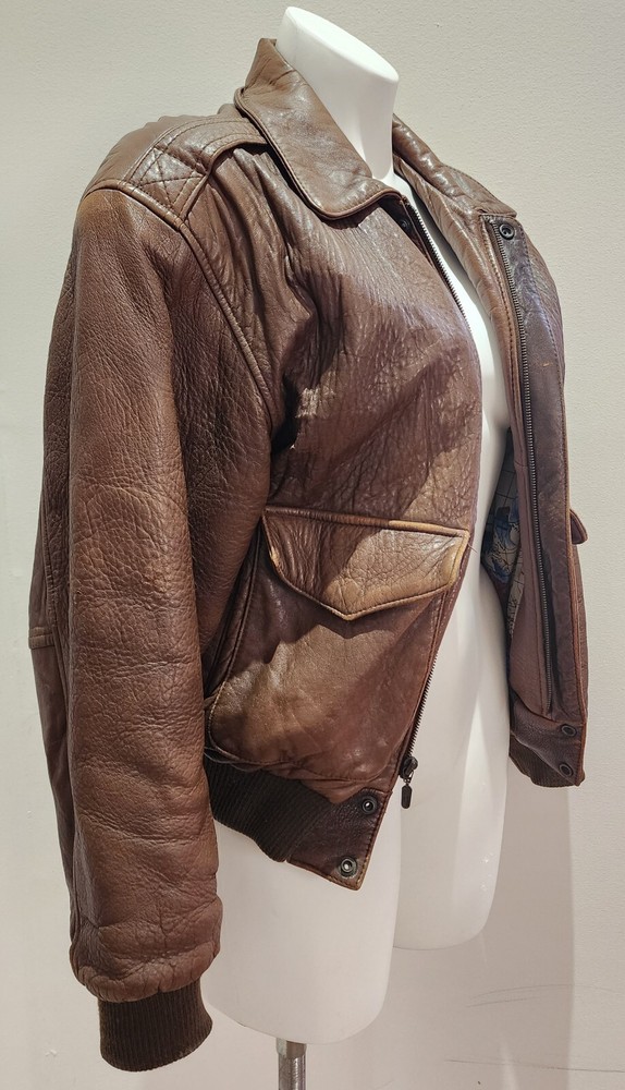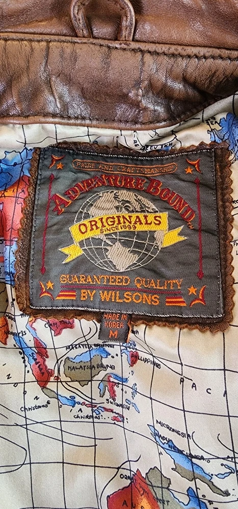 This is a vintage Wilsons Adventure Bound leather flight jacket with a full zip closure. The jacket is made of high-quality leather and has a solid brown color. It is a size medium and has a bomber jacket style that is perfect for men who want to add a touch of vintage to their wardrobe. The jacket has a full zip feature and is check all measurements to ensure the perfect fit. The jacket is perfect for those who love the outdoors and want to make a statement with their clothing. Highly sought after map inner lining, buttery soft leather, does have a couple scuffs and bumps here and there.