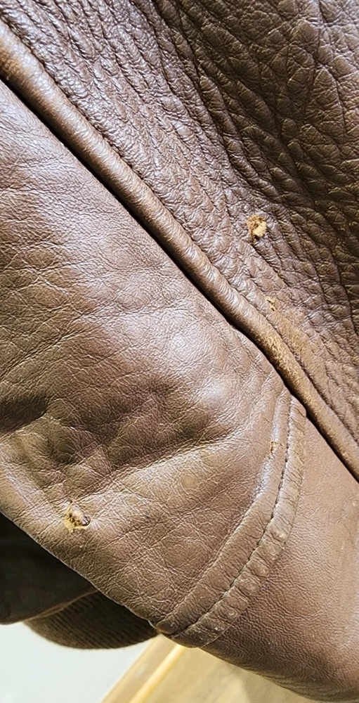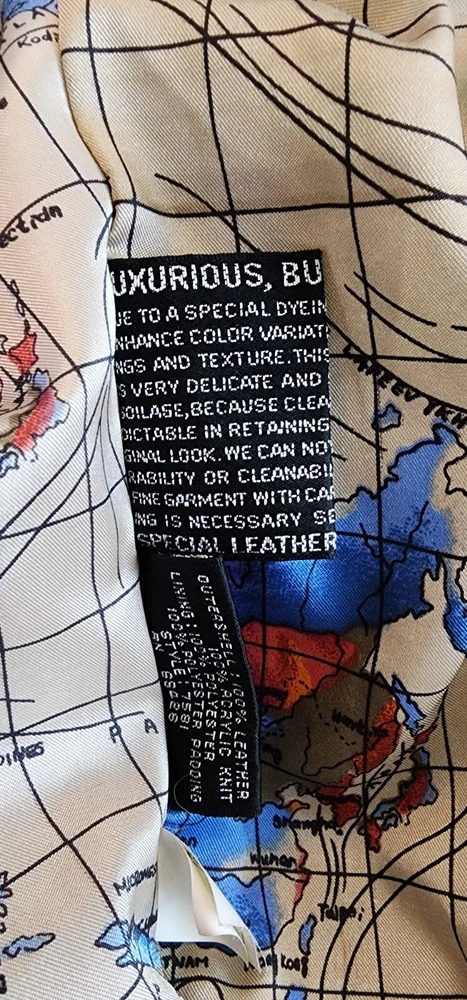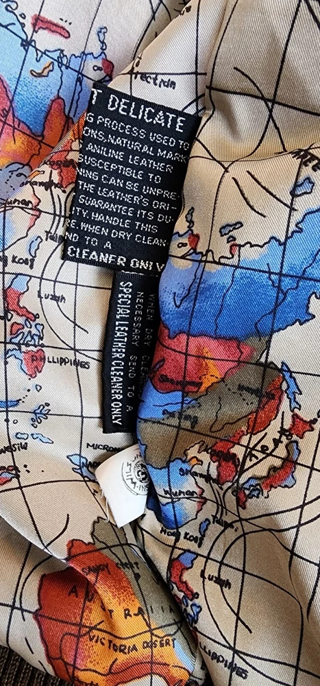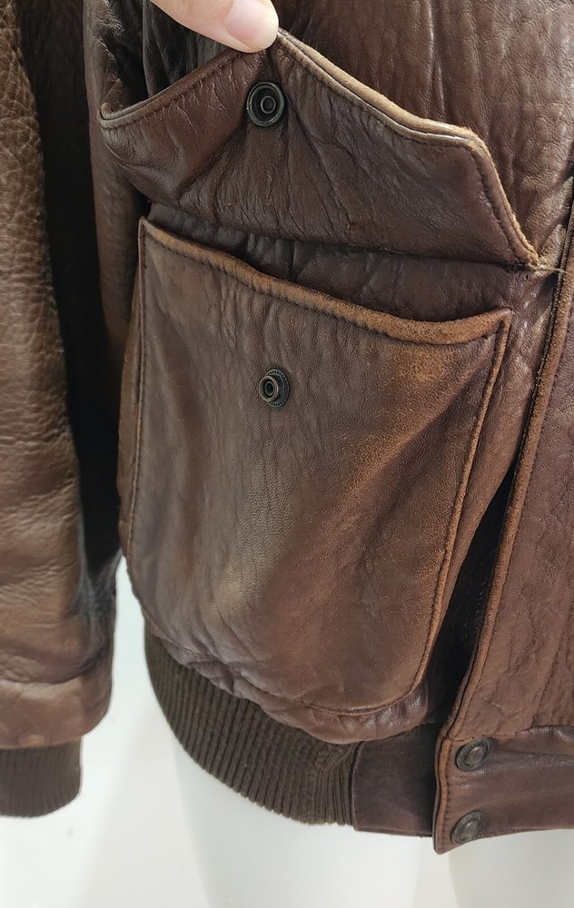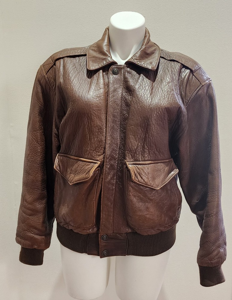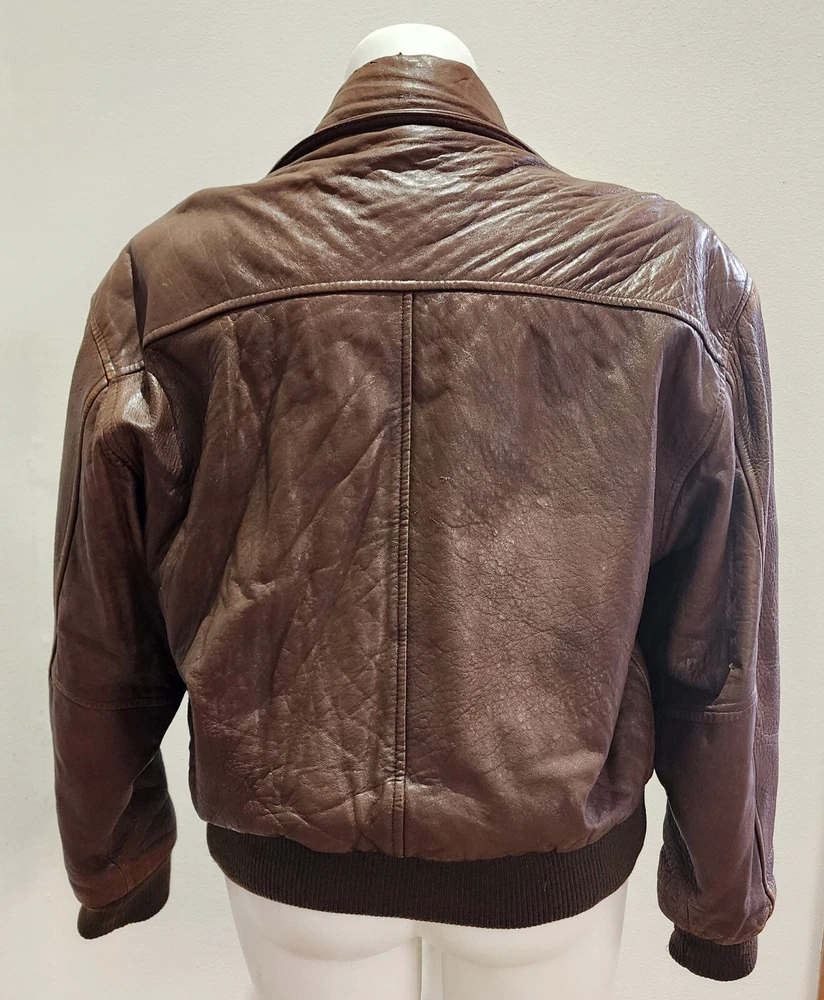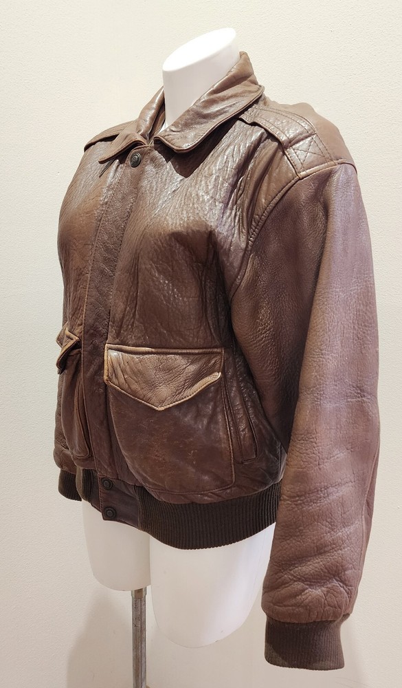 This is a vintage Wilsons Adventure Bound leather flight jacket with a full zip closure. The jacket is made of high-quality leather and has a solid brown color. It is a size medium and has a bomber jacket style that is perfect for men who want to add a touch of vintage to their wardrobe. The jacket has a full zip feature and is check all measurements to ensure the perfect fit. The jacket is perfect for those who love the outdoors and want to make a statement with their clothing. Highly sought after map inner lining, buttery soft leather, does have a couple scuffs and bumps here and there.