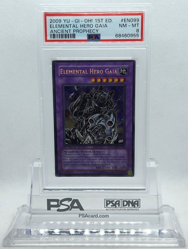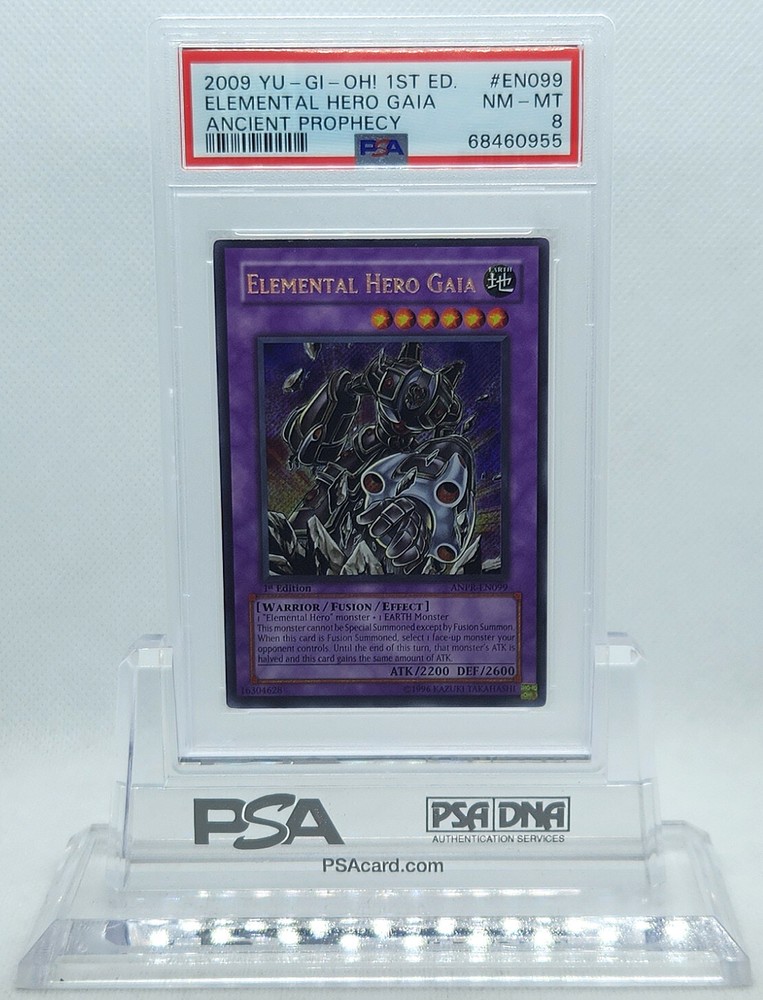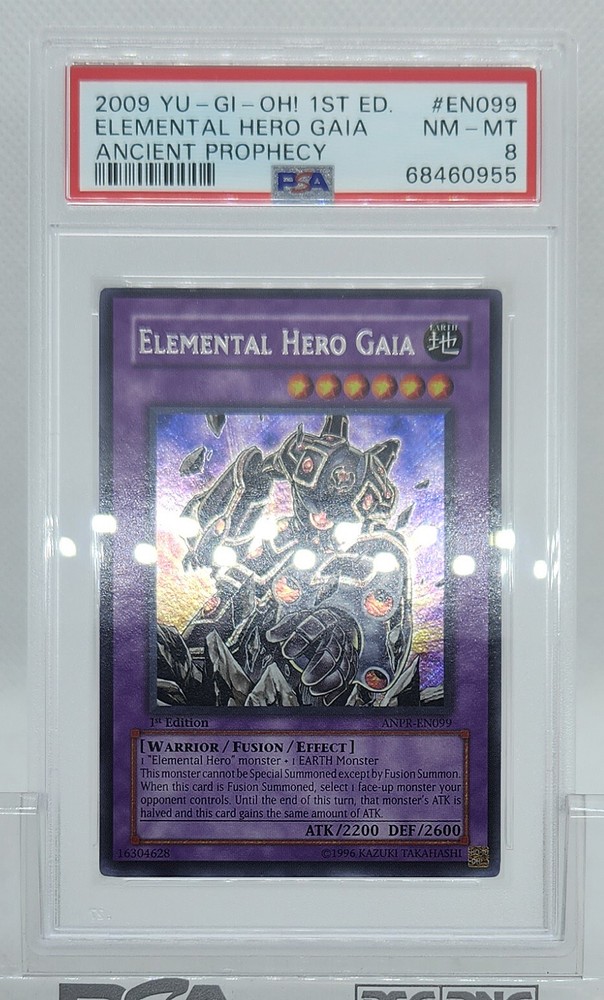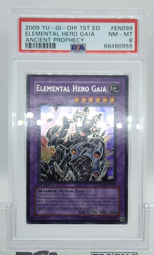 Description Condition: PSA 8 NM-MT Availability: In Stock You are Purchasing YUGIOH 1ST ED ANPR-EN099 ELEMENTAL HERO GAIA SECRET RARE HOLO PSA 8 NM #68460955 Professionally graded by Professional Sports Authenticator (PSA) *PLEASE REVIEW PHOTO(S) BEFORE PURCHASING >>MORE GRADED YUGIOH CARDS<< Payment Options Payment is expected within 7 days of your purchase date. We accept all forms of payments through Paypal. Shipping and Handling We ship to all U.S. states, U.S. territories, APO/FPO locations and any international countries listed under our "ship to" heading. Shipping and Handling is calculated based on the combined shipping weight of your item(s). Please use the shipping calculator to estimate your shipping and handling charges. In order to qualify for combined shipping terms, all items must be paid for in one payment; please do not pay until you are done bidding/shopping. Please contact us if you have any questions regarding our shipping and handling terms. Shipping and Delivery Packages are shipped out every Monday, Wednesday, and Friday. Domestic Packages take approximately 2-7 days to arrive. International packages may take a little longer to arrive, typically 1-4 weeks. Please allow ample transit times before inquiring about your package, thank you. Sales Tax All orders shipped to a California address will be subject to Sales Tax. Sales Tax is calculated on the item's price and is not applied to the shipping or other charges. Customer Service We will make every effort to get your purchase is mailed in a timely manner. Please contact us if you have any questions or concerns; we would love to hear any suggestions you have on how we can improve your eBay experience. Thank you for visiting us today.