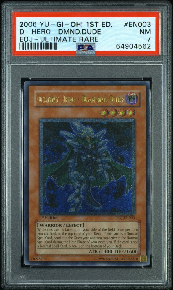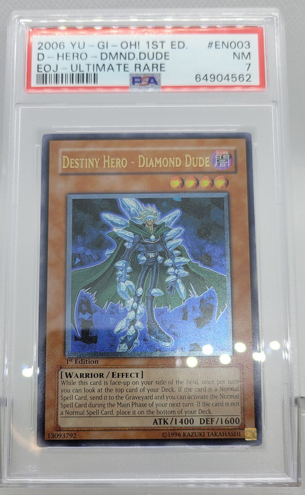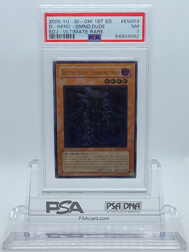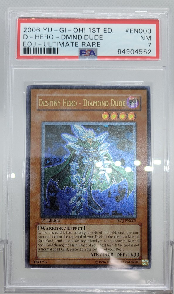Description Condition: PSA 7 NM Availability: In Stock You are Purchasing YUGIOH 1ST ED EOJ-EN003 ELEMENTAL HERO DIAMOND DUDE ULTIMATE PSA 7 NM #64904562 Professionally graded by Professional Sports Authenticator (PSA) *PLEASE REVIEW PHOTO(S) BEFORE BIDDING/BUYING. >>MORE GRADED YUGIOH CARDS<< IG: CARD_RUSH_INC Payment Options Payment is expected within 7 days of your purchase date. We accept all forms of payments through Paypal. Shipping and Handling We ship to all U.S. states, U.S. territories, APO/FPO locations and any international countries listed under our "ship to" heading. Shipping and Handling is calculated based on the combined shipping weight of your item(s). Please use the shipping calculator to estimate your shipping and handling charges. In order to qualify for combined shipping terms, all items must be paid for in one payment; please do not pay until you are done bidding/shopping. Please contact us if you have any questions regarding our shipping and handling terms. Shipping and Delivery Packages are shipped out every Monday, Wednesday, and Friday. Domestic Packages take approximately 2-7 days to arrive. International packages may take a little longer to arrive, typically 1-4 weeks. Please allow ample transit times before inquiring about your package, thank you. Sales Tax Sales tax will be automatically collected by Ebay. Customer Service We will make every effort to get your purchase is mailed in a timely manner. Please contact us if you have any questions or concerns; we would love to hear any suggestions you have on how we can improve your eBay experience. Thank you for visiting us today.