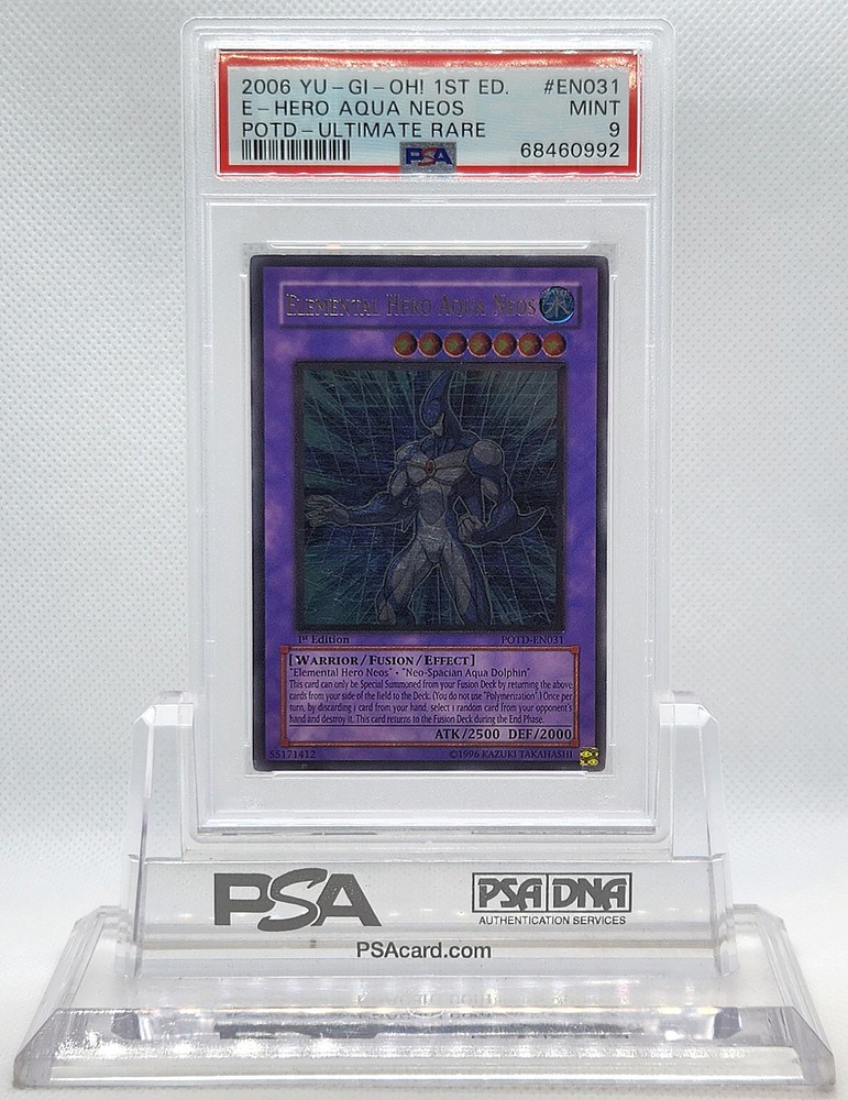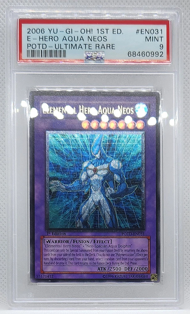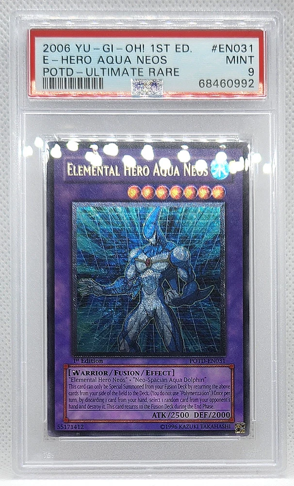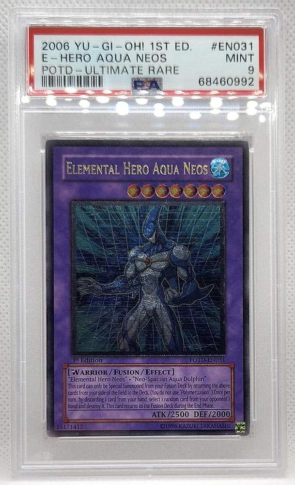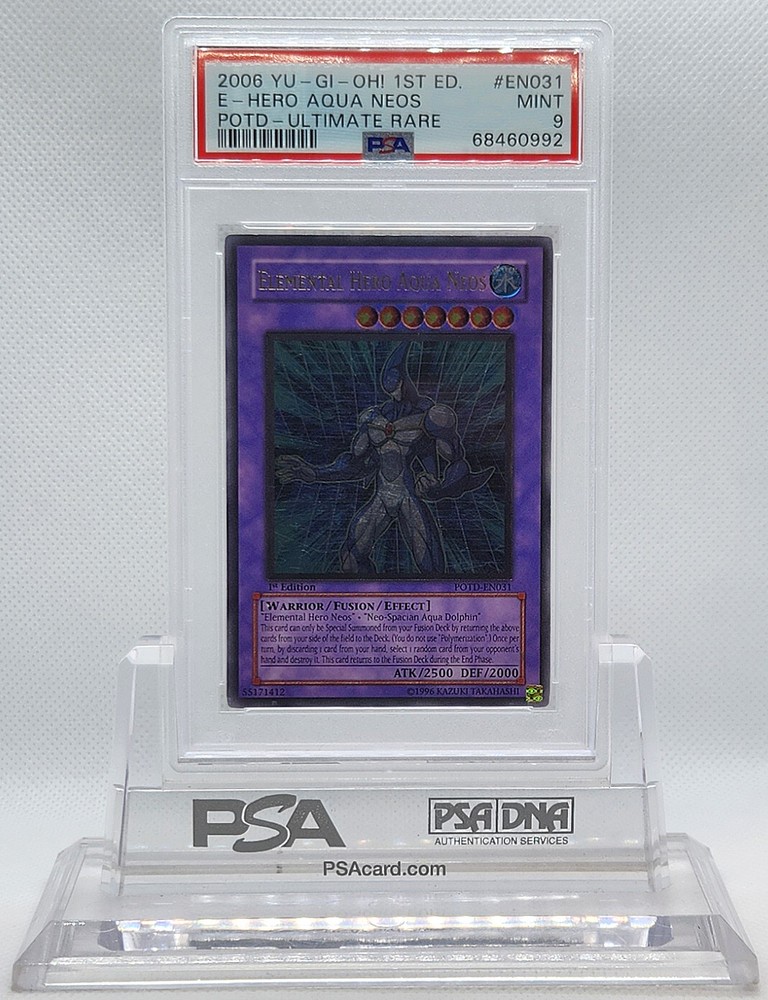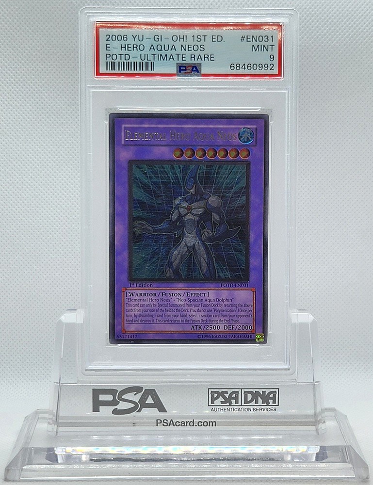 Description Condition: PSA 9 MINT Availability: In Stock You are Purchasing YUGIOH 1ST ED POTD-EN031 ELEMENTAL HERO AQUA NEOS ULTIMATE PSA 9 MINT #68460992 Professionally graded by Professional Sports Authenticator (PSA) *PLEASE REVIEW PHOTO(S) BEFORE BIDDING/BUYING. >>MORE GRADED YUGIOH CARDS<< IG: CARD_RUSH_INC Payment Options Payment is expected within 7 days of your purchase date. We accept all forms of payments through Paypal. Shipping and Handling We ship to all U.S. states, U.S. territories, APO/FPO locations and any international countries listed under our "ship to" heading. Shipping and Handling is calculated based on the combined shipping weight of your item(s). Please use the shipping calculator to estimate your shipping and handling charges. In order to qualify for combined shipping terms, all items must be paid for in one payment; please do not pay until you are done bidding/shopping. Please contact us if you have any questions regarding our shipping and handling terms. Shipping and Delivery Packages are shipped out every Monday, Wednesday, and Friday. Domestic Packages take approximately 2-7 days to arrive. International packages may take a little longer to arrive, typically 1-4 weeks. Please allow ample transit times before inquiring about your package, thank you. Sales Tax Sales tax will be automatically collected by Ebay. Customer Service We will make every effort to get your purchase is mailed in a timely manner. Please contact us if you have any questions or concerns; we would love to hear any suggestions you have on how we can improve your eBay experience. Thank you for visiting us today.