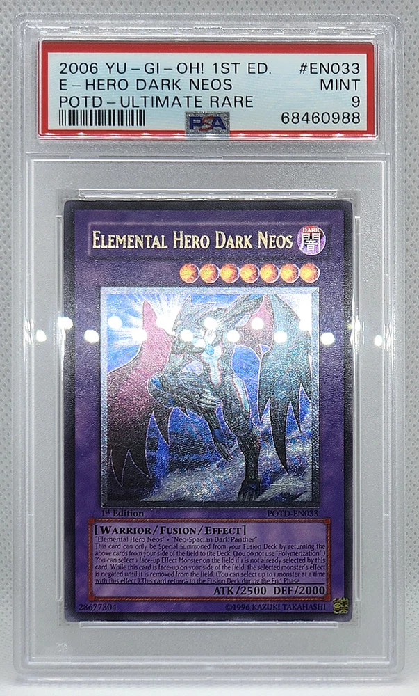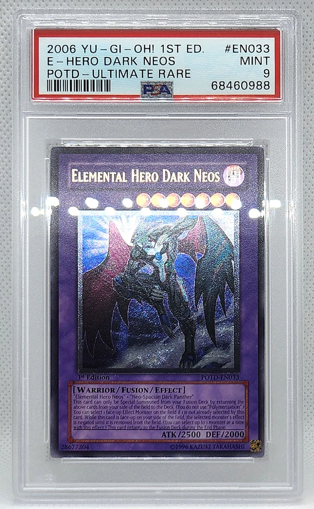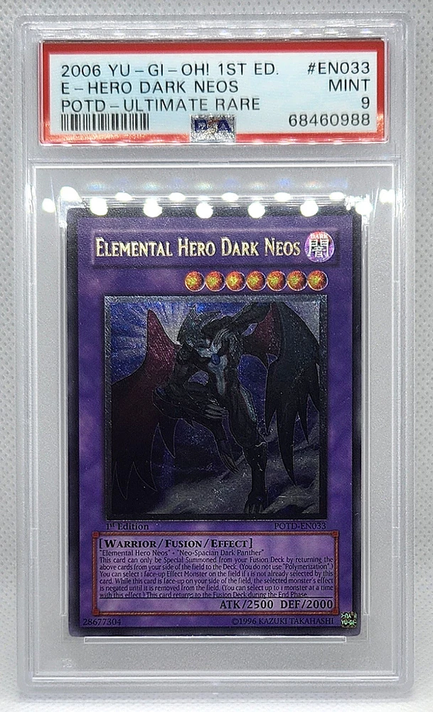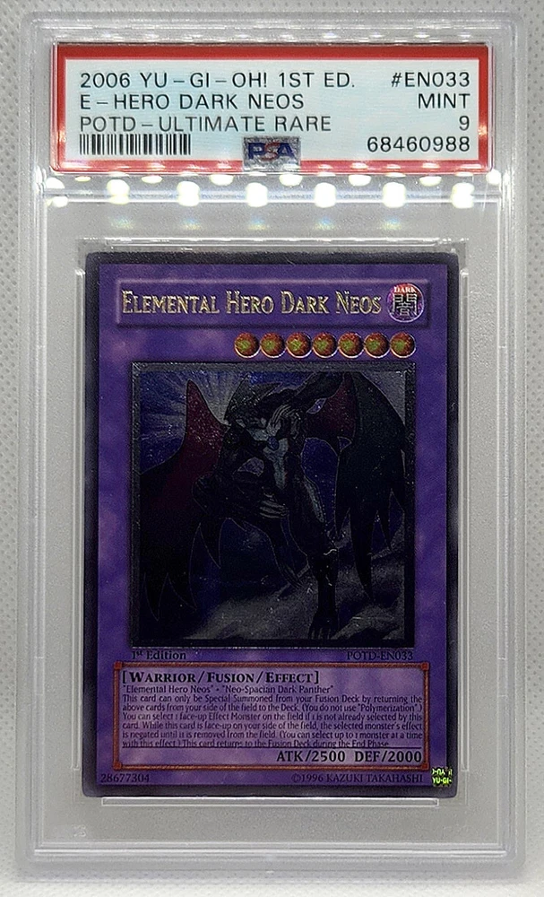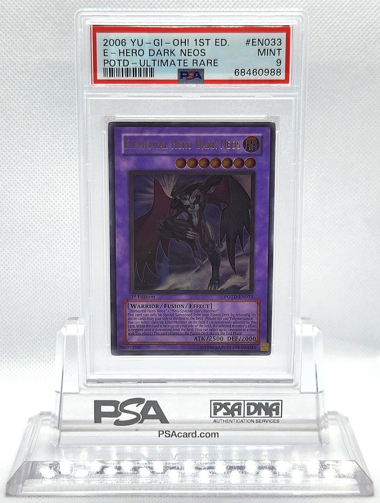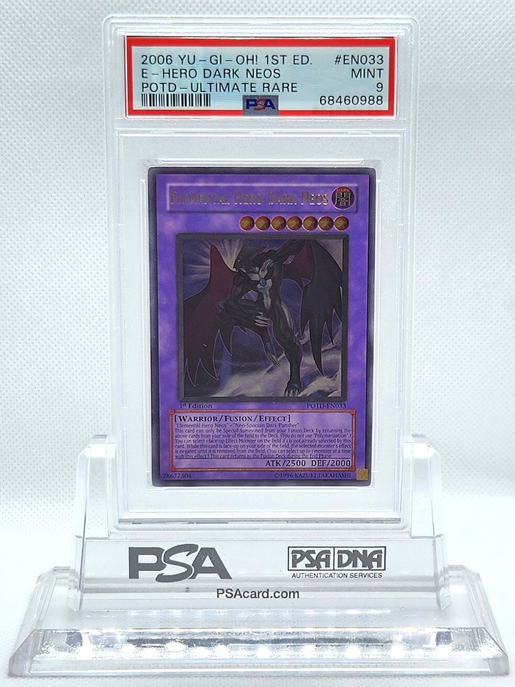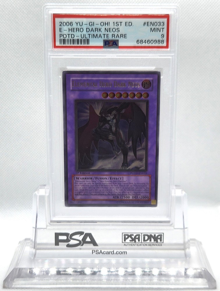 Description Condition: PSA 9 MINT Availability: In Stock You are Purchasing YUGIOH 1ST ED POTD-EN033 ELEMENTAL HERO DARK NEOS ULTIMATE PSA 9 MINT #68460988 Professionally graded by Professional Sports Authenticator (PSA) *PLEASE REVIEW PHOTO(S) BEFORE BIDDING/BUYING. >>MORE GRADED YUGIOH CARDS<< IG: CARD_RUSH_INC Payment Options Payment is expected within 7 days of your purchase date. We accept all forms of payments through Paypal. Shipping and Handling We ship to all U.S. states, U.S. territories, APO/FPO locations and any international countries listed under our "ship to" heading. Shipping and Handling is calculated based on the combined shipping weight of your item(s). Please use the shipping calculator to estimate your shipping and handling charges. In order to qualify for combined shipping terms, all items must be paid for in one payment; please do not pay until you are done bidding/shopping. Please contact us if you have any questions regarding our shipping and handling terms. Shipping and Delivery Packages are shipped out every Monday, Wednesday, and Friday. Domestic Packages take approximately 2-7 days to arrive. International packages may take a little longer to arrive, typically 1-4 weeks. Please allow ample transit times before inquiring about your package, thank you. Sales Tax Sales tax will be automatically collected by Ebay. Customer Service We will make every effort to get your purchase is mailed in a timely manner. Please contact us if you have any questions or concerns; we would love to hear any suggestions you have on how we can improve your eBay experience. Thank you for visiting us today.
